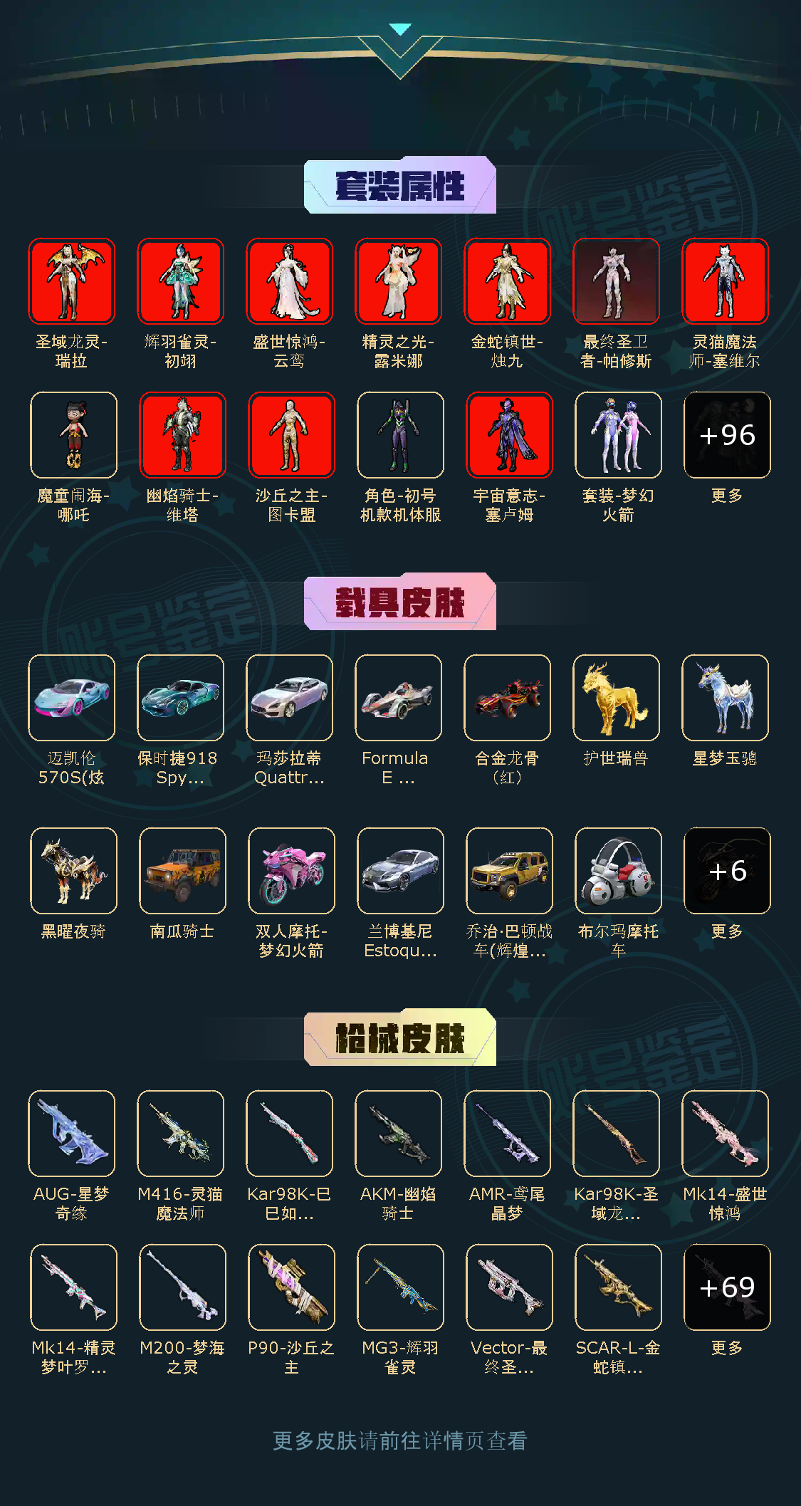 101粉,19载具,560套装,30王牌印记,无敌战神历史最高段,387527热力值 平底锅-仲夏莫吉托/平底锅-林间仙鹿/AKM-盖世英雄/M416-灵猫魔法师/AKM-甜心宝贝/SCAR-L-梦幻火箭/SCAR-L-童趣迷兔/AUG-星梦奇缘/M416-风花雪月/M416-电玩时刻/AUG-星之彼岸/SCAR-L-甜梦小狐/M762-甜心娃娃/M416-全功率超战/GROZA-旋转彩虹/M762-激战未来/GROZA-香水柠檬/M416-暖熊萌萌/AKM-幽焰骑士/AUG-南国舞曲/SCAR-L-天蓬元帅/M416-心之恋语/SCAR-L-纯梦嫁纱/M416-五爪金龙/AKM-魔法神域/M16A4-垂柳戏鸭/AKM-炫紫旋律/AKM-白勺歌姬/GROZA-精灵之光/M416-墨龙九天/GROZA-玉面桃花/SCAR-L-锦绣绵绵/M416-至情至圣/SCAR-L-金蛇镇世/AUG-妙趣可丽/M762-甜蜜誓约/M416-超新星/SCAR-L-魔童闹海 哪吒/SPAS-12-音爆索尼克/S12K-海渊国主/M417-第五大道/Mk14-盛世惊鸿/SKS-诡面斩/Mk14-精灵梦叶罗丽/Mini14-龙虾霸霸/DP-28-扶摇飞仙/M249-彩虹甜喵/MG3-辉羽雀灵/MG3-炙焰牛王/MG3-洛神天依/M249-蓝莓炮弹/DP-28-豹影疾电/UZI-绮梦青鸾/UZI-畅跳缤纷/P90-仙履奇缘/汤姆逊-怪笑疯兔/UMP45-量子极限/Vector-红伞翩翩/UMP45-宇宙意志/汤姆逊-荒漠赏金/Vector-环太平洋/UZI-筑梦精灵/Vector-最终圣卫者/UMP45-相思残雪/野牛-青空秋雨/UMP45-恐龙拽拽/P90-沙丘之主/爆炸猎弓-雪梅暗香/烟雾弹-猫咪绅士/破片手榴弹-粉粉猫爪/Kar98K-伏魔团/Kar98K-圣域龙灵/AWM-花间之火/AMR-鸢尾晶梦/Kar98K-巳巳如意/AWM-橘柚倾心/M24-暗星紫秘/M200-玉鳞金羽/AMR-智耀战神/M200-梦海之灵/Kar98K-暗翼战神/M24-星之信仰/玛莎拉蒂Quattroporte(幻星粉)/兰博基尼Estoque(尊享铂)/乔治·巴顿战车(辉煌金)/南瓜骑士/拉轰鸭鸭车/快艇-自由的鲸/特斯拉Cybertruck(镭光铂)/Formula E Gen2(荒原银)/合金龙骨(红)/保时捷918 Spyder(玺耀绿)/迈凯伦570S(炫冰蓝)/护世瑞兽/星梦玉骢/关羽赤兔马/黑曜夜骑/疾风龙骑/辉羽雀灵自行车/双人摩托-梦幻火箭/布尔玛摩托车/