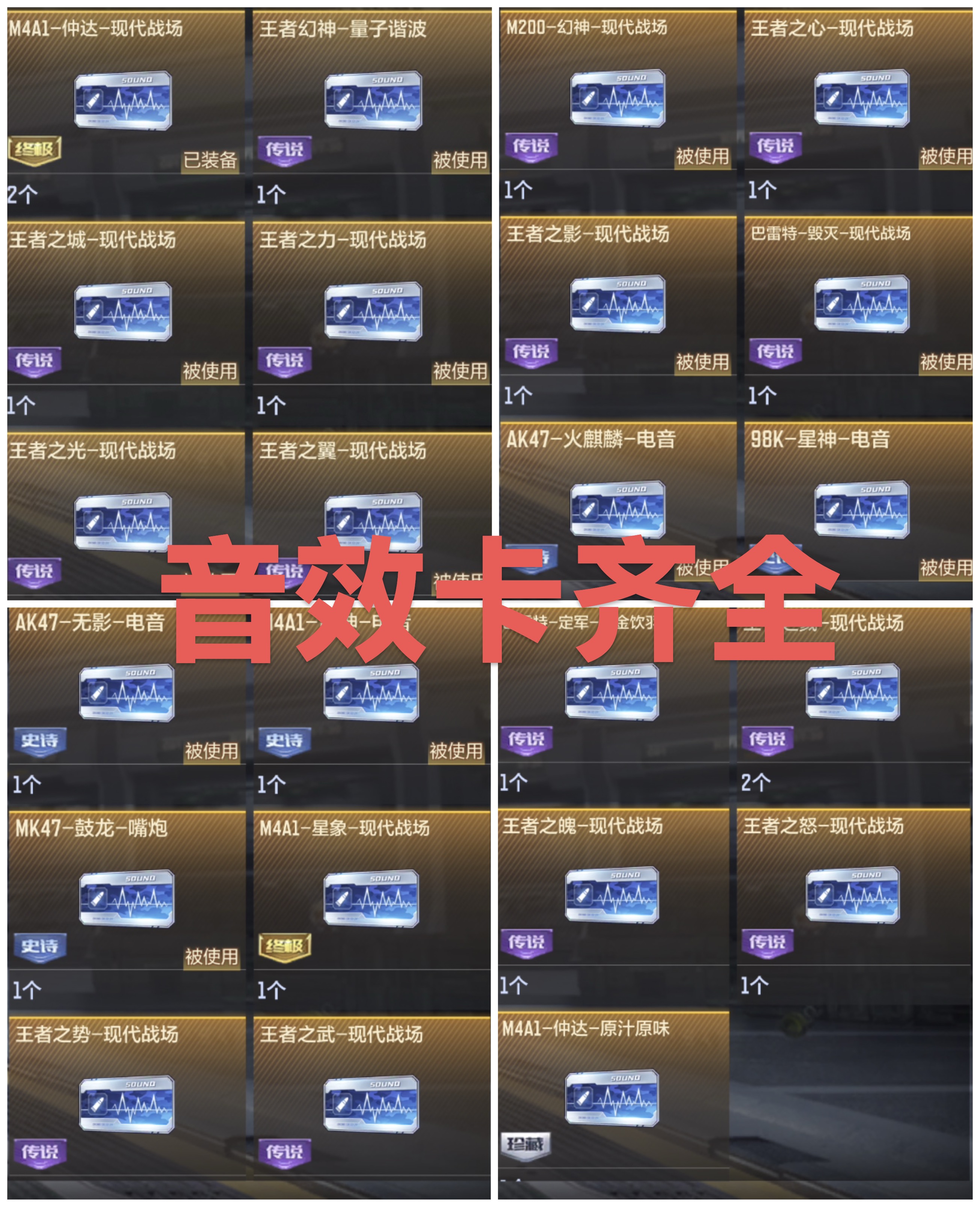 19消灭音效(炎龙铠甲*1无双*1葫芦娃*1嘻嘻*1焰火贺岁*4巴巴塔*1能量核心*1、8bit*2赏金猎人*1战战嚎风云*1现代战场*2、八十*1、哎呦*1斩杀*1)、11狙击枪线(2黑化+5荣耀+1无双+1星火征途+1紫电熔岩+1HS)
