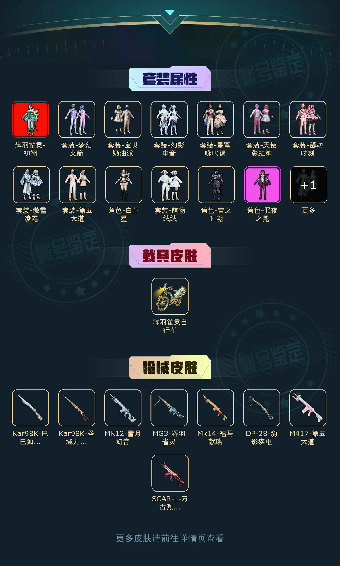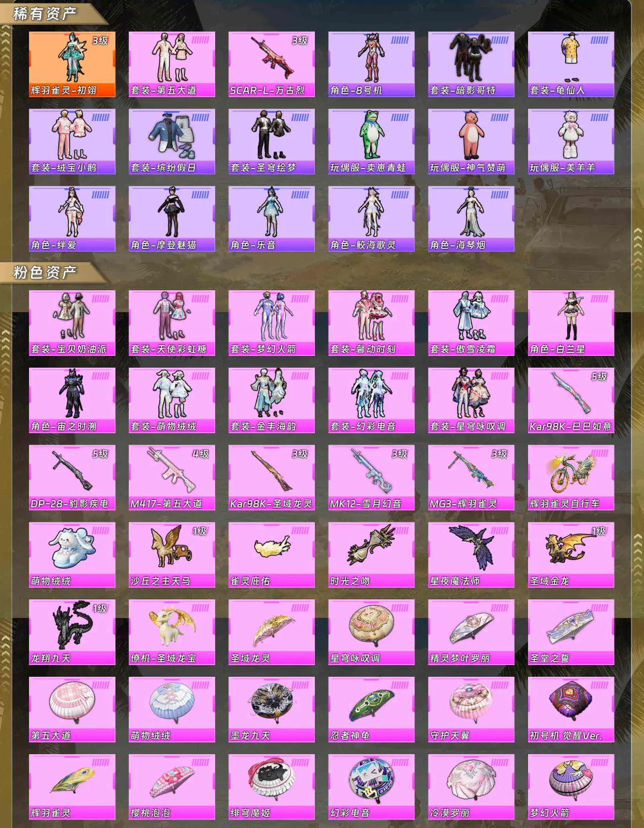 【稀有资产】辉羽雀灵-初翊[3级]/套装-第五大道/SCAR-L-万古烈焰/角色-8号机/套装-暗影哥特/套装-龟仙人/套装-绒宝小鹅/套装-缤纷假日/套装-圣穹绘梦/玩偶服-卖崽青蛙/玩偶服-神气赞萌露比/玩偶服-美羊羊/角色-绊爱/角色-摩登魅猫/角色-乐音/角色-鲛海歌灵/角色-海琴烟