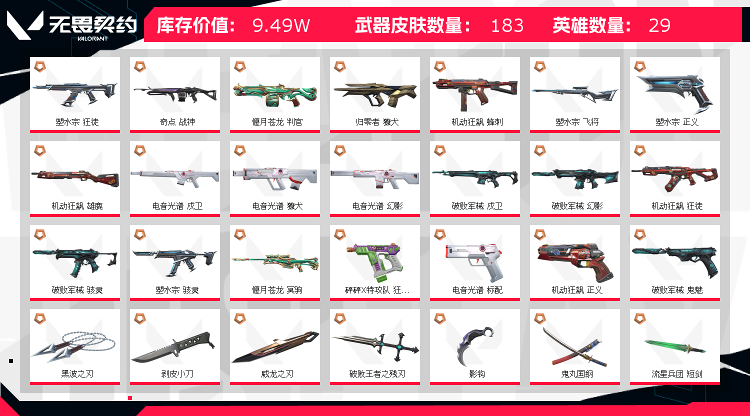 【当前段位:白银III】精氪毕业皮齐全特效炫彩拉满7套装✅掠影20套塑水套电音套破败套摩托套✅盖亚侦查✅影钩剥皮龙刀黑波之刃