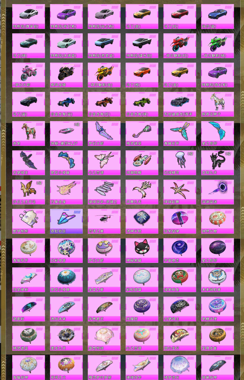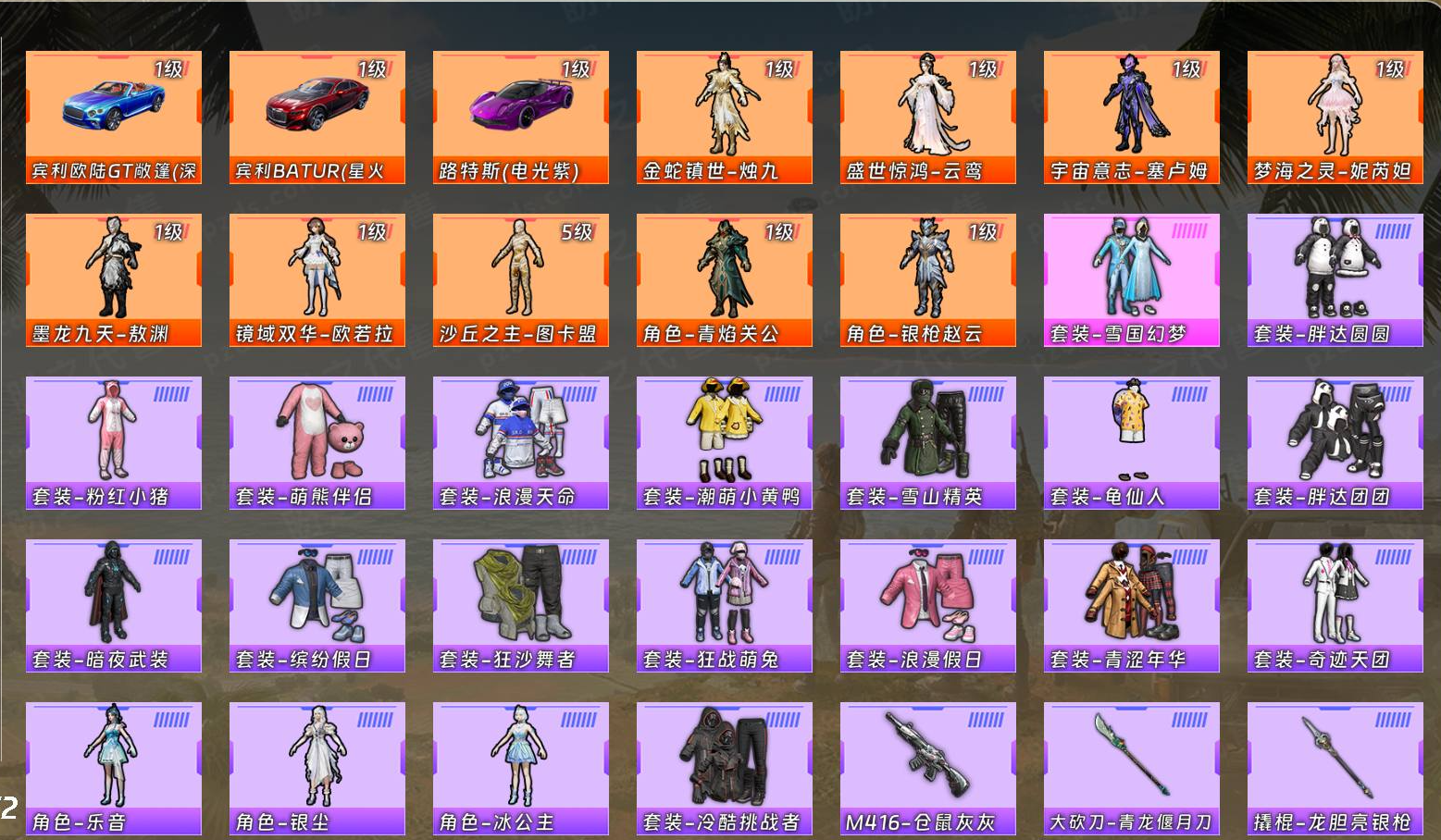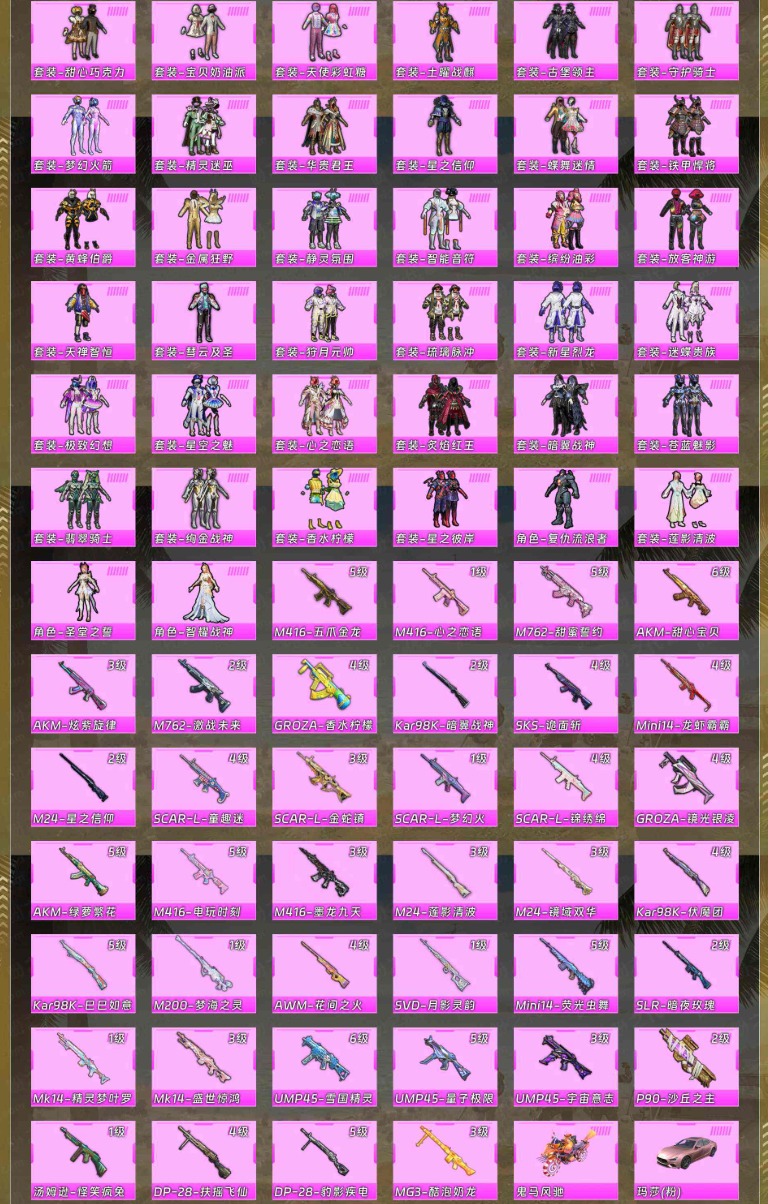 【套装数量】360【枪械数量】415 【粉枪械数量】45 【粉套装数量】45 【载具数量】31 【飞行器数量】18 【稀有资产】宾利欧陆GT敞篷(深空蓝)[1级]/宾利BATUR(星火红)[1级]/路特斯EVIJA(电光紫)[1级]/金蛇镇世-烛九[1级]/盛世惊鸿-云鸾[1级]/宇宙意志-塞卢姆[1级]/梦海之灵-妮芮妲[1级]/墨龙九天-敖渊[1级]/镜域双华-欧若拉[1级]/沙丘之主-图卡盟[5级]/角色-青焰关公[1级]/角色-银枪赵云[1级]/套装-雪国幻梦/套装-胖达圆圆/套装-粉红小猪/套装-萌熊伴侣/套装-浪漫天命/套装-潮萌小黄鸭/套装-雪山精英/套装-龟仙人/套装-胖达团团/套装-暗夜武装/套装-缤纷假日/套装-狂沙舞者/套装-狂战萌兔/套装-浪漫假日/套装-青涩年华/套装-奇迹天团/角色-乐音/角色-银尘/角色-冰公主/套装-冷酷挑战者/M416-仓鼠灰灰/大砍刀-青龙偃月刀/撬棍-龙胆亮银枪 【粉色套装】套装-甜心巧克力/套装-宝贝奶油派/套装-天使彩虹糖/套装-土曜战麒/套装-古堡领主/套装-守护骑士/套装-梦幻火箭/套装-精灵迷巫/套装-华贵君王/套装-星之信仰/套装-蝶舞迷情/套装-铁甲悍将/套装-黄蜂伯爵/套装-金属狂野/套装-静灵氛围/套装-智能音符/套装-缤纷油彩/套装-放客神游/套装-天禅智恒/套装-彗云及圣/套装-狩月元帅/套装-琉璃脉冲/套装-新星烈龙/套装-迷蝶贵族/套装-极致幻想/套装-星空之魅/套装-心之恋语/套装-炙焰红王/套装-暗翼战神/套装-苍蓝魅影/套装-翡翠骑士/套装-绚金战神/套装-香水柠檬/套装-星之彼岸/角色-复仇流浪者/套装-莲影清波/角色-圣堂之誓/角色-智耀战神 【粉色枪皮】M416-五爪金龙[5级]/M416-心之恋语[1级]/M762-甜蜜誓约[5级]/AKM-甜心宝贝[6级]/AKM-炫紫旋律[3级]/M762-激战未来[2级]/GROZA-香水柠檬[4级]/Kar98K-暗翼战神[2级]/SKS-诡面斩[4级]/Mini14-龙虾霸霸[4级]/M24-星之信仰[2级]/SCAR-L-童趣迷兔[4级]/SCAR-L-金蛇镇世[3级]/SCAR-L-梦幻火箭[1级]/SCAR-L-锦绣绵绵[4级]/GROZA-镜光银凌[4级]/AKM-绿萝繁花[5级]/M416-电玩时刻[5级]/M416-墨龙九天[3级]/M24-莲影清波[3级]/M24-镜域双华[3级]/Kar98K-伏魔团[4级]/Kar98K-巳巳如意[5级]/M200-梦海之灵[1级]/AWM-花间之火[4级]/SVD-月影灵韵[1级]/Mini14-荧光虫舞[5级]/SLR-暗夜玫瑰[2级]/Mk14-精灵梦叶罗丽[1级]/Mk14-盛世惊鸿[3级]/UMP45-雪国精灵[6级]/UMP45-量子极限[5级]/UMP45-宇宙意志[3级]/P90-沙丘之主[2级]/汤姆逊-怪笑疯兔[1级]/DP-28-扶摇飞仙[4级]/DP-28-豹影疾电[5级]/MG3-酷泡奶龙[3级] 【载具】鬼马风驰/玛莎拉蒂Ghibli(粉)/特斯拉Roadster(尊享铂)/特斯拉Model 3(奇幻紫)/特斯拉Roadster(沁心粉)/阿斯顿·马丁DBS(金)/阿斯顿·马丁DBS(红)/玛莎拉蒂Ghibli(蓝)/阿斯顿·马丁DBS(绿)/特斯拉Roadster(水滴蓝)/特斯拉Cybertruck(荒芜蓝)/特斯拉Cybertruck(镭光铂)/双人摩托-双刃魅影(红)/双人摩托-双刃魅影(绿)/双人摩托-梦幻火箭/疾风龙骑/双人摩托-双刃魅影(金)/阿斯顿·马丁DBX(橙)/阿斯顿·马丁DBX(金)/特斯拉Model X(奇幻紫)/阿斯顿·马丁DBX(蓝)/合金龙骨(蓝)/合金龙骨(红)/合金龙骨(绿)/布加迪威龙(海洋蓝)/照夜玉狮子/赤兔/快艇-塞莎KL27(霓虹粉)[1级] 【僚机】空客H135-恋语之翼 【飞行器】梦幻火箭飞行器/精灵迷巫飞行器/春暖花开飞行器/星之信仰飞行翼/古堡领主飞行器/繁花小夜曲飞行翼/心之恋语飞行翼/鸿潮鸣舰飞行器/幻海精灵飞行器[1级]/龙翔九天飞行器[1级]/沙丘之主天马[1级]/万象金身飞行器/镜域双华-灵镜之阶/凤舞九天飞行器/祥瑞起舞飞行器/深渊漩涡飞行器/酣梦熊熊飞行器/霓虹街区飞行器 【珍稀背包】萌熊伴侣背包(3级)/萌熊伴侣背包(2级)/萌熊伴侣背包(1级)/洛神天依背包(2级)