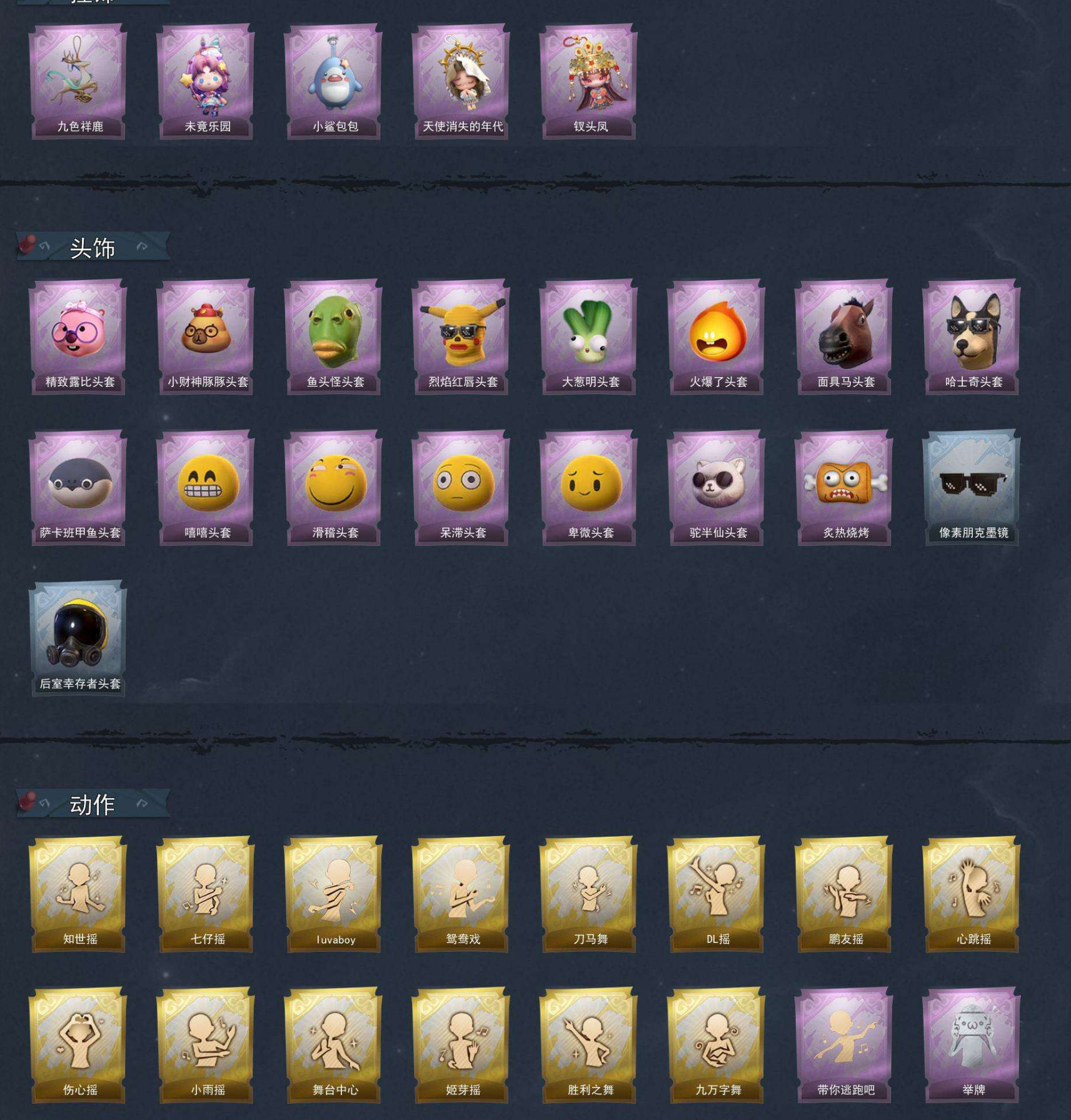 【头饰】精致露比头套、小财神豚豚头套、鱼头怪头套、烈焰红唇头套、大葱明头套、火爆了头套、面具马头套、哈士奇头套、萨卡班甲鱼头套、嘻嘻头套、滑稽头套、呆滞头套、卑微头套、驼半仙头套、炙热烧烤、像素朋克墨镜、后室幸存者头套