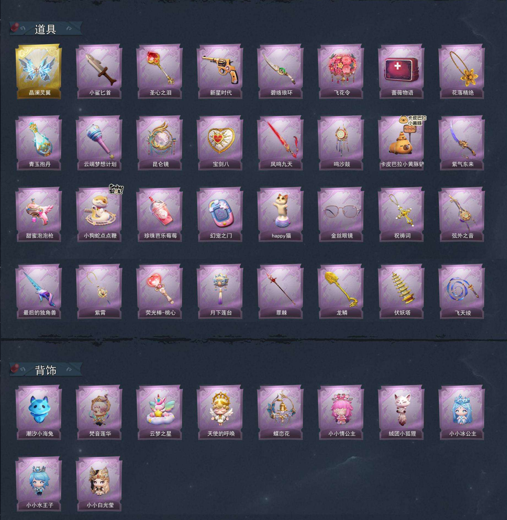【道具皮肤】喷气背包-晶澜灵翼、刺刀-小鲨匕首、铲子-圣心之泪、转轮手枪-新星时代、刺刀-碧络琅环、额外的背包-飞花令、急救包-蔷薇物语、摸金符-花落精绝、黄牛能量饮料-青玉抱丹、专业手电-云端梦想计划、传送按钮-昆仑镜、腰包-宝剑八、桃木剑-凤鸣九天、音响-鸣沙鼓、铲子-卡皮巴拉小黄豚铲、刺刀-紫气东来、电击枪-甜蜜泡泡枪、长鞭-小狗蛇点点鞭、黄牛能量饮料-珍珠芭乐莓莓、传送按钮-幻宠之门、音响-happy猫、夜视仪-金丝眼镜、摸金符-祝祷词、除颤仪-弦外之音、桃木剑-最后的独角兽、摸金符-紫霄、腰包-月下莲台、长枪-罪棘、铲子-龙鳞、葫芦-伏妖塔、长鞭-飞天绫