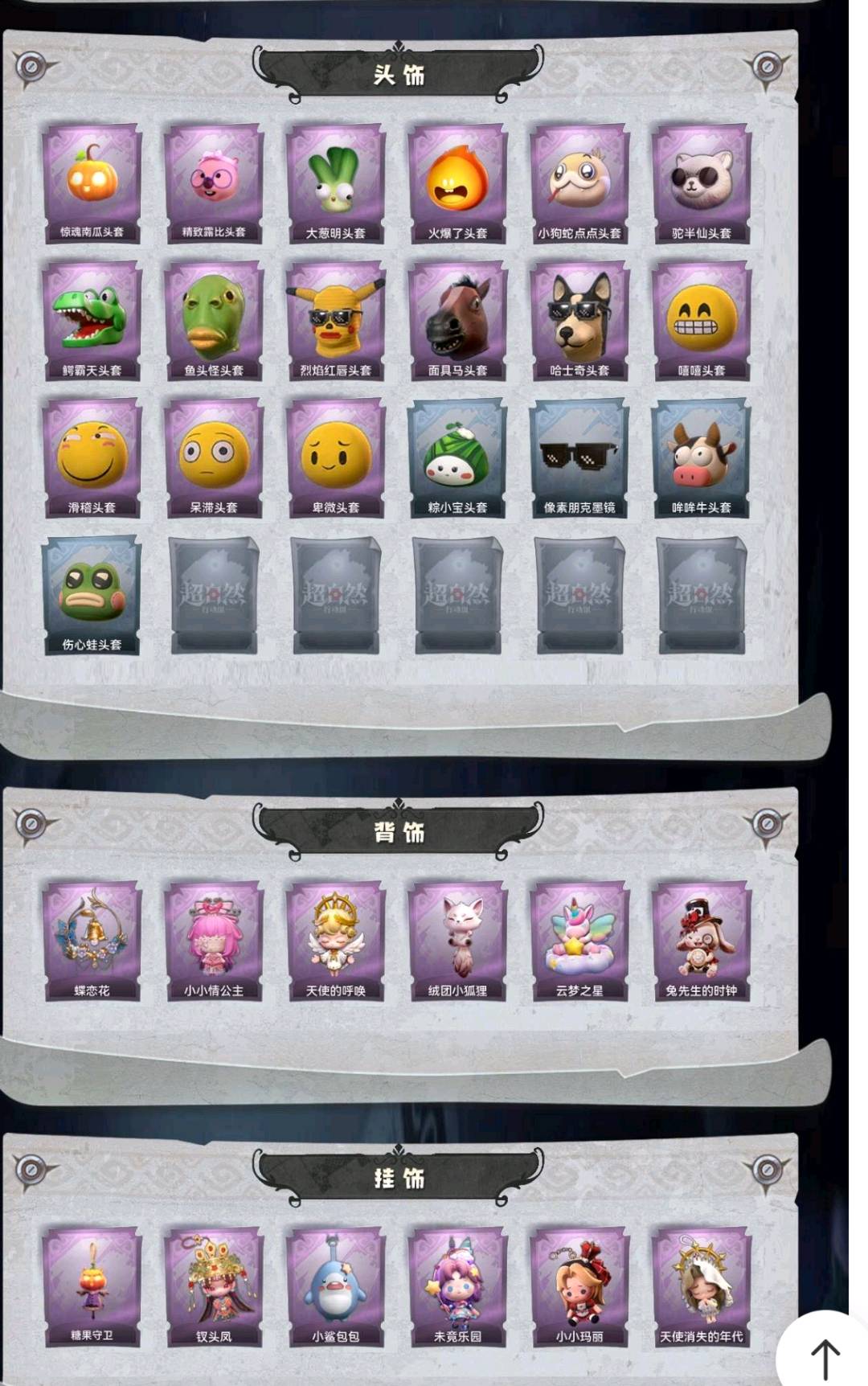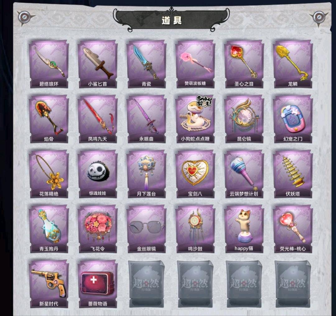 腰包﹣惊魂娃娃、铲子﹣焰骨、铲子﹣赞萌波板糖、铲子﹣龙鳞、铲子﹣圣心之泪、刺刀﹣青瓷、刺刀﹣小鲨匕首、刺刀﹣碧络琅环、桃木剑﹣永眠曲、桃木剑﹣凤鸣九天、传送按钮﹣幻宠之门、传送按钮﹣昆仑镜、摸金符﹣花落精绝、腰包﹣月下莲台、腰包﹣宝剑八、专业手电﹣云端梦想计划、长鞭﹣小狗蛇点点鞭、葫芦﹣伏妖塔、黄牛能量饮料﹣青玉抱丹、额外的背包﹣飞花令、夜视仪﹣金丝眼镜、音响﹣happy猫、音响﹣鸣沙鼓、荧光棒﹣桃心、转轮手枪﹣新星时代、急救包﹣蔷薇物语