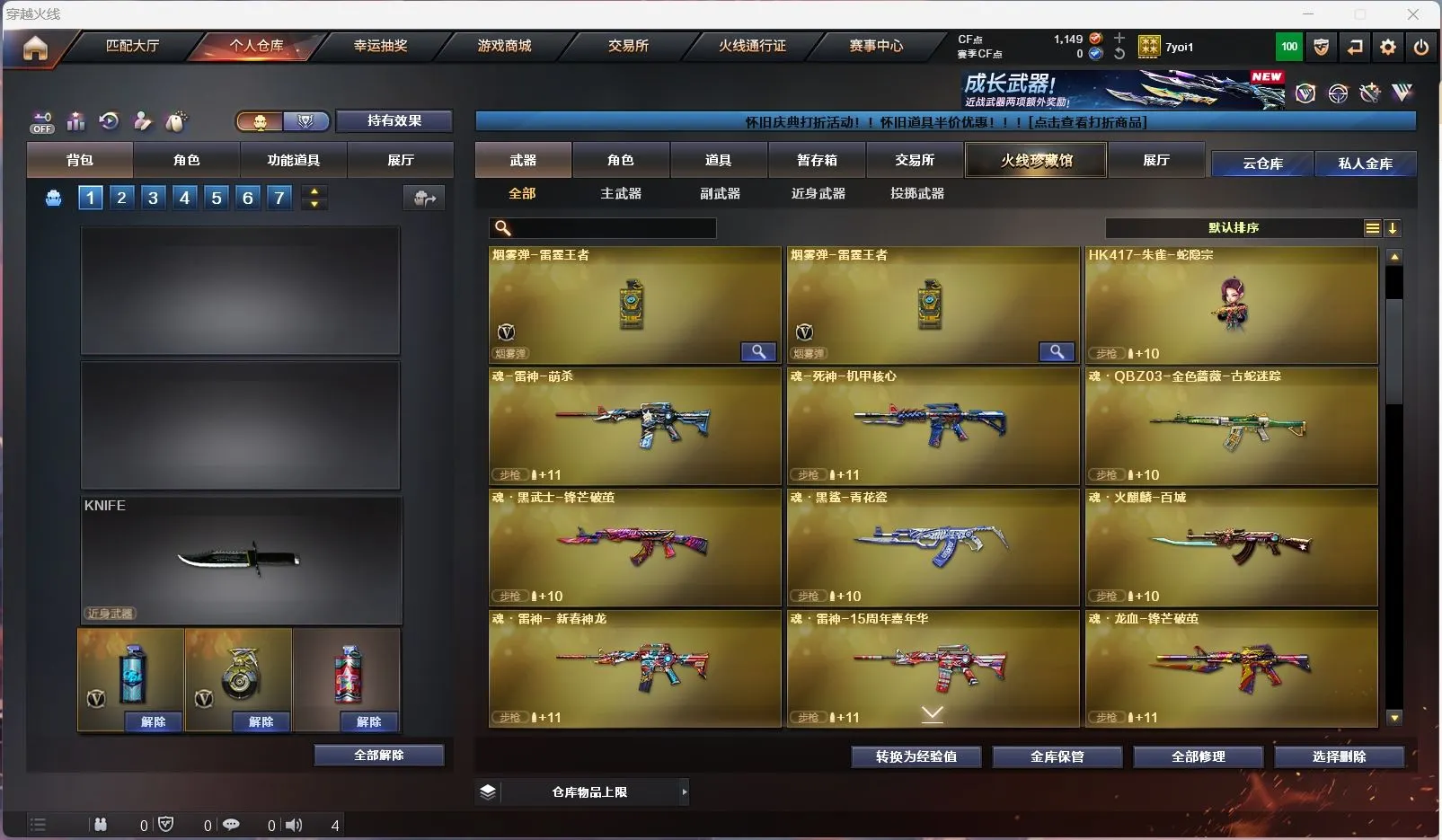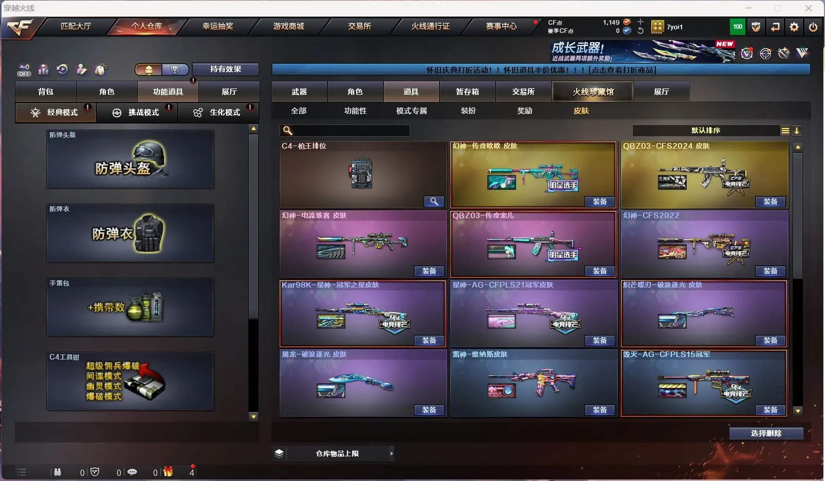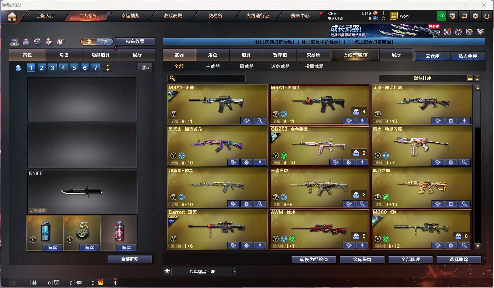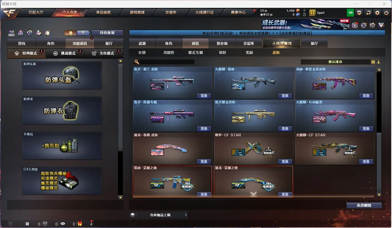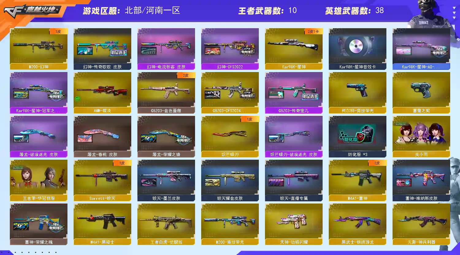 【亮点解析 98k星神音效卡】 【m200-幻神+幻神-传奇欧欧+cfs2022+电流骇客】 【98k星神+音效卡+冠军之星+ag21冠军】 【m200-竞技荣光】 【王者白虎】 【qbz金色蔷薇】 【雷神+雷神-荣耀之魄】 【黑骑士】 【毁灭】 【裁决】 【4手呛 cop雷霆】 【7近战 屠龙 麒麟刺 炽芒蝶刃蝴蝶刀 斩神刀雷暴】 【手雷 雷霆雷*3 雷暴雷 幻灵雷 雷霆王者*2】 【四防 王者零华冠丽服】 【角色 关小雨 乔伊教练 蛇隐宗】 【98k星神音效卡】