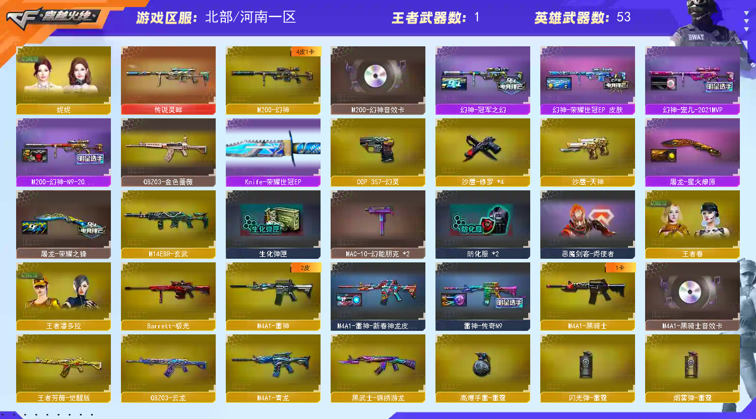 【亮点解析 幻神4皮带卡】【传说灵眸】【m200幻神+音效卡+n9宠儿+荣耀世冠ep+冠军之幻+宠儿】【qbz金色蔷薇】【玄武】【雷神+n9】【黑骑士+卡】【极光】【Knife-荣耀世冠EP】【武器:青龙 王者芳薇 烈龙】【6手枪:修罗*4 天神 幻灵 】【8刀具:屠龙*2 尼泊尔雷霆 幻灵之峰 竞技荣光 云龙扇 荣耀世冠ep】【6雷套:雷霆 幻灵 竞技荣光 云龙雷*3】【小人枪:白虎枪娘安妮 炼狱枪娘掣电】【音效卡:幻神音效卡 黑骑士音效卡 】【四防角色:妮妮 王者春 王者潘多拉 】