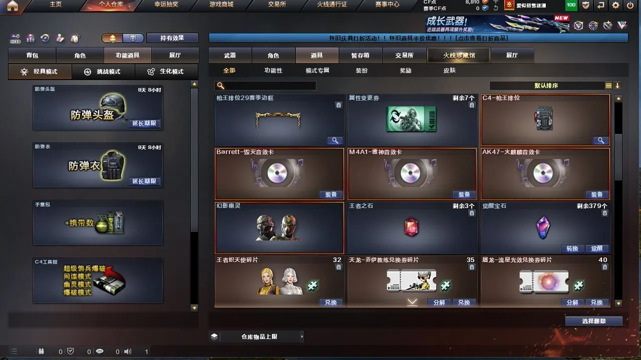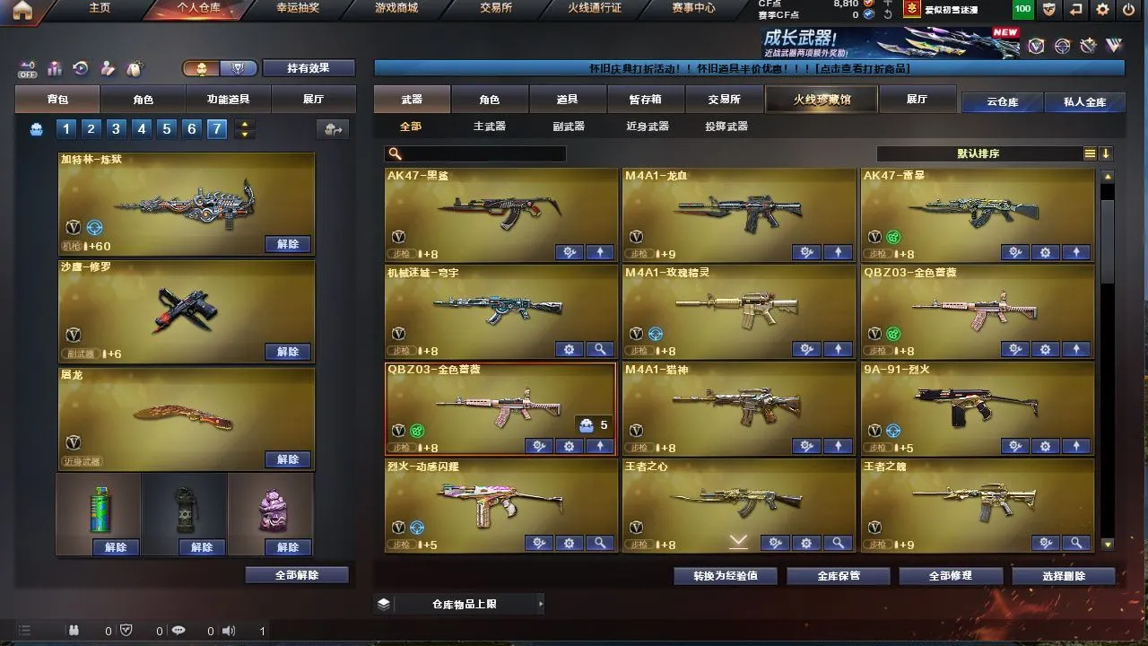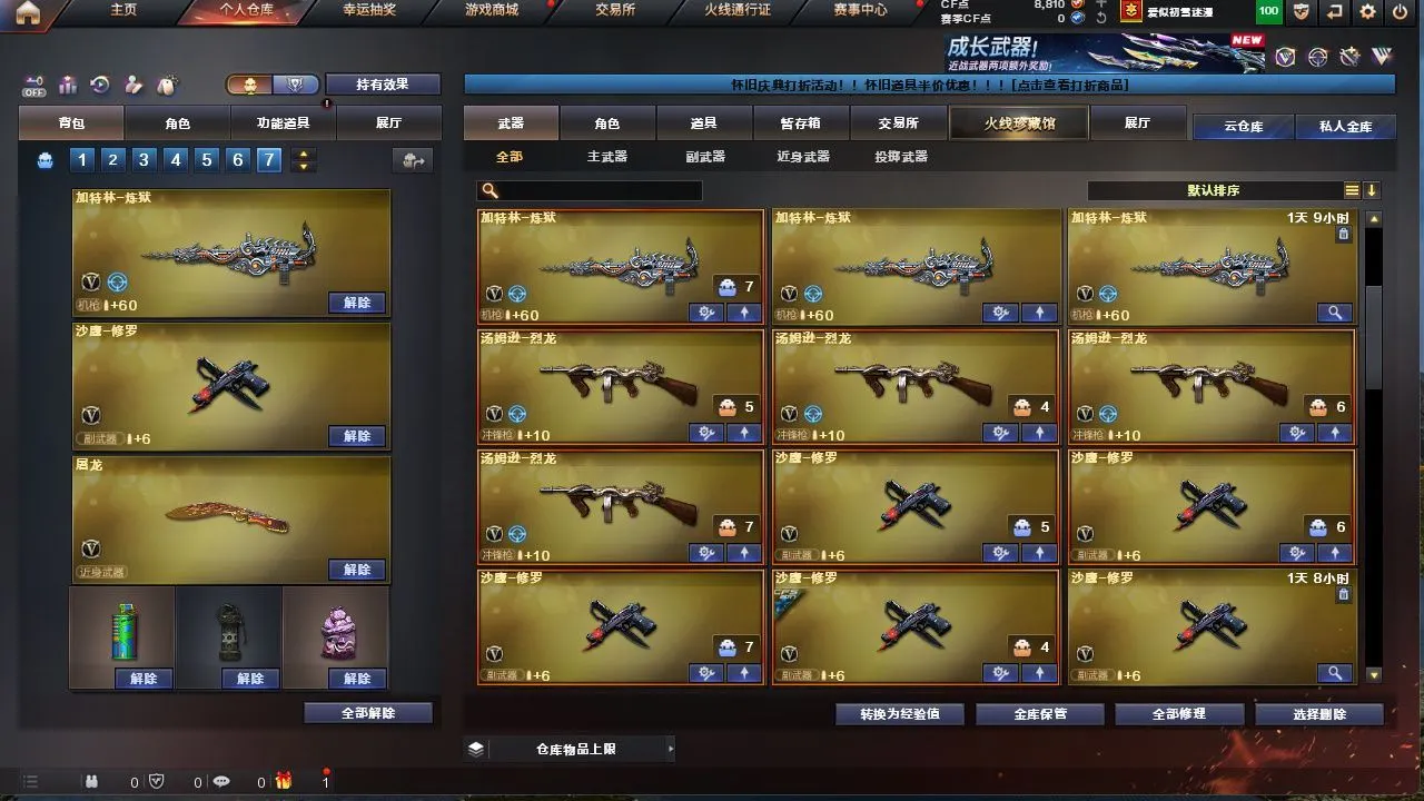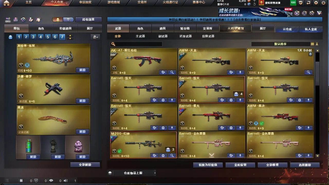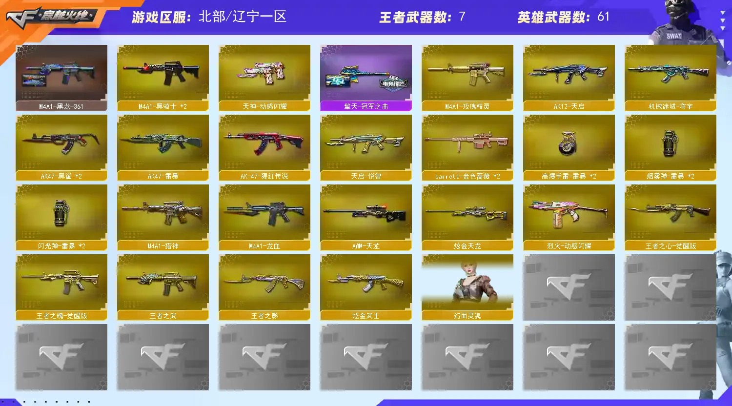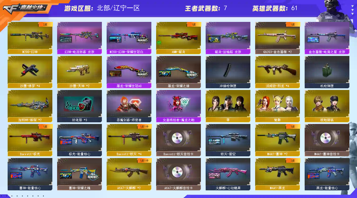 【M200 - 幻神 + 幻神 - 电流骇客皮肤 + M200 - 幻神 - 荣耀世冠白鲨】【AWM - 裁决 + 裁决 - 运输船皮肤】【QBZ03 - 金色蔷薇 (2)】【1 盘龙】【4 烈龙】【2 炼狱】【M4A1 - 雷神 (2)+AK-47 - 雷神 + 雷神 - 荣耀之魄 + 雷神 - 能量核心 + M4A1 - 雷神音效卡】【AK47 - 火麒麟 (2)+ 火麒麟 - CFSTAR + 火麒麟 - AG + 火麒麟 - 心动糖果 + AK47 - 火麒麟音效卡】【Barrett - 毁灭 (4)+ 毁灭 - 百城浙江皮肤 + 毁灭 - 星空 + Barrett - 毁灭音效卡】【M4A1 - 黑骑士 (2)+ 黑骑士 - 幻能朋克皮肤】【零 / 魅影 / 战地猎狐 / 乔伊教练 / 灵动武士 / 空 / 零 - 水下丽影 / 灵狐者 - 黄金海岸】【Barrett - 极光 /barrett - 金色蔷薇 (2)/AWM - 天龙 / 王者之魄 - 觉醒版 / AK12 - 天启 / AK47 - 雷暴 / AK47 - 黑鲨 (2)/AK-47 - 猩红传说 / 王者之心 - 觉醒版 / 烈火 - 动感闪耀 / 9A91 - 烈火 / 天神 - 动感闪耀 / 沙鹰 - 天神 (2)/ 沙鹰 - 修罗 (4)+ 修罗 - CFSTAR / 麒麟刺 / 龙啸 / 擎天 / 擎天 - 竞技荣光 / 屠龙 - 动感闪耀 / 屠龙 (3)/ 王者之锋 - 觉醒版 / 斩神刀 - 雷暴 / 手雷 - 动感闪耀 / 机械迷城 - 穹宇 / 天启 - 悦智 / 王者之武 / 王者之影 / 王者之击】【AWM - 灵狐 - 15 周年嘉年华 / COP - 旗袍】【Barrett - 极光 - 能量核心】【AWM - 天龙 - CFSTAR】【M4A1 - 黑龙 - 能量核心 + M4A1 - 黑龙 - 361】【死神 - 机甲核心皮肤】【屠龙 - 荣耀世冠 AG + 屠龙 - 荣耀之锋