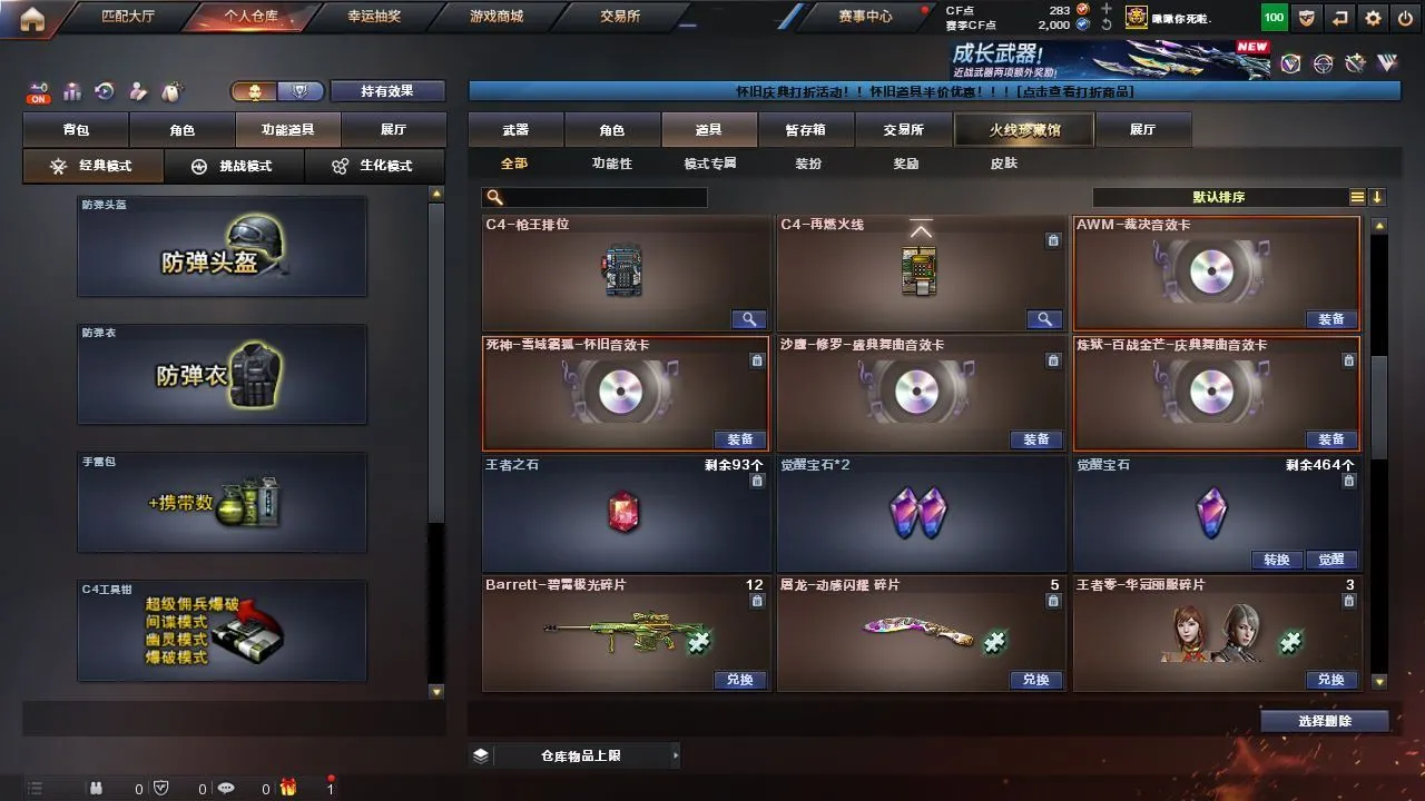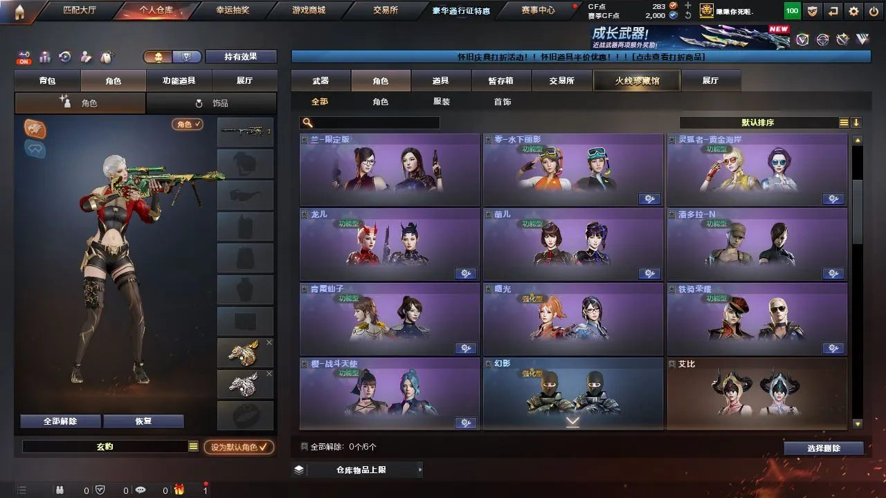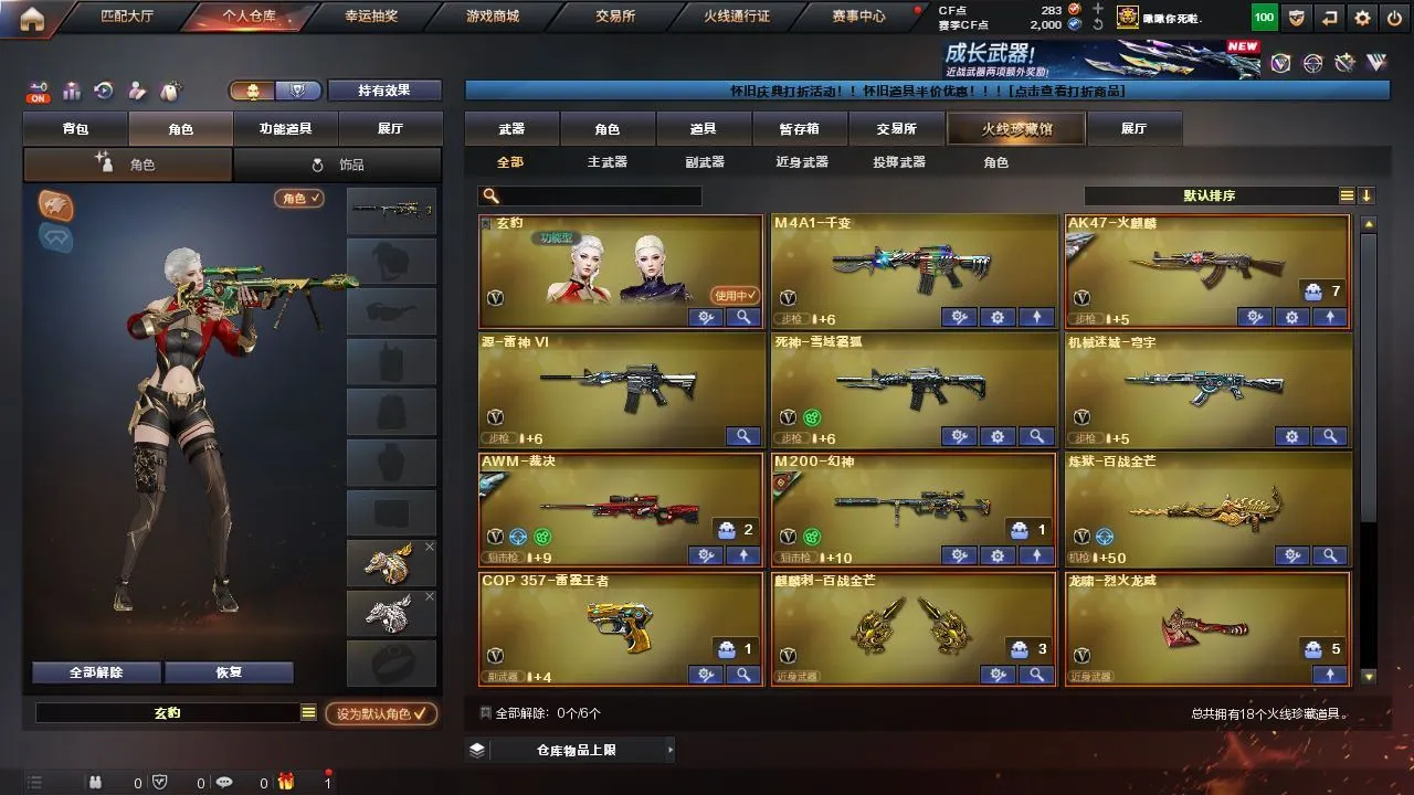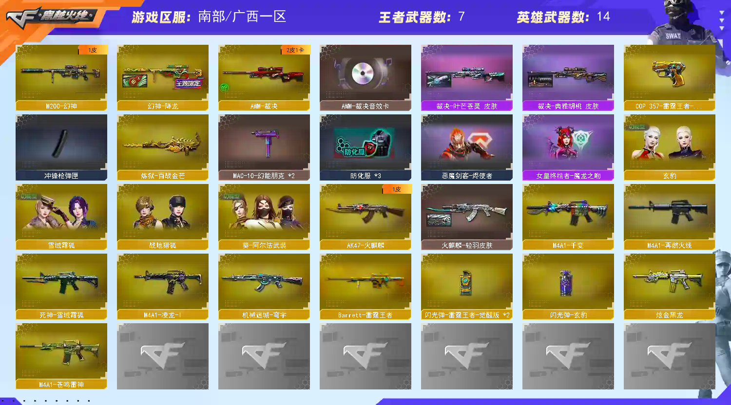 《m200幻神+幻神降龙皮肤》《玄豹》《葵阿尔法武装》《乔伊教练》《死神雪域霜狐+音效卡》《炼狱百战金芒+庆典舞曲音效卡》《COP357雷霆王者》《巴雷特雷霆王者》《裁决+叶芒苍灵皮肤+裁决音效卡》《雷霆王者手雷套》《火麒麟零纪元》《炫金黑龙》《迷你救赎猎手》《死神雪域霜狐怀旧音效卡》《修罗庆典舞曲音效卡》《火麒麟轻羽皮肤》《千变 火麒麟 机械迷城穹宇》《龙啸烈火龙威》