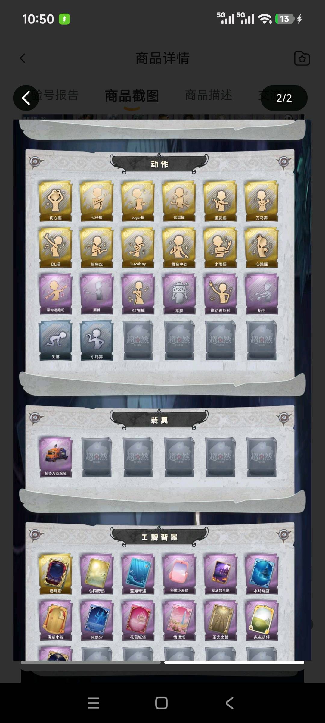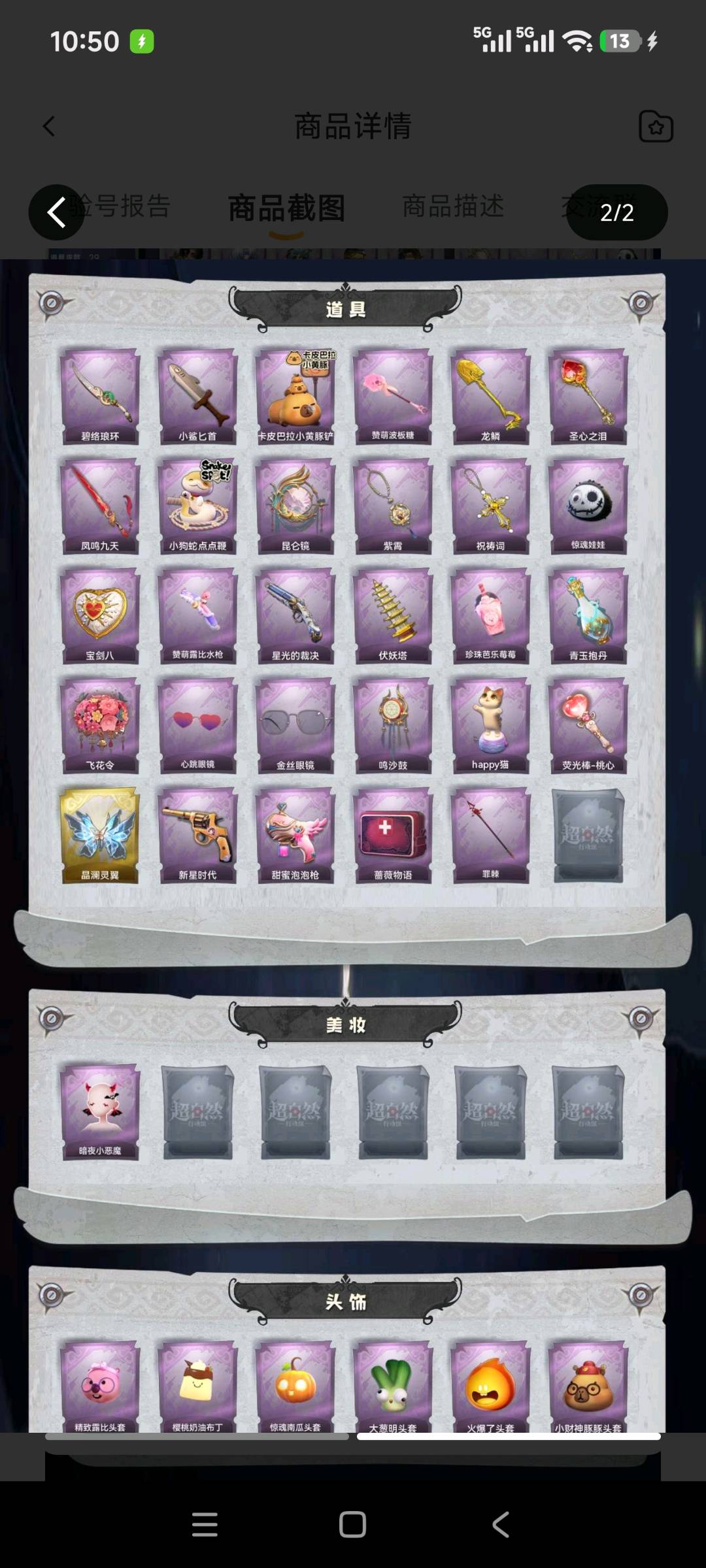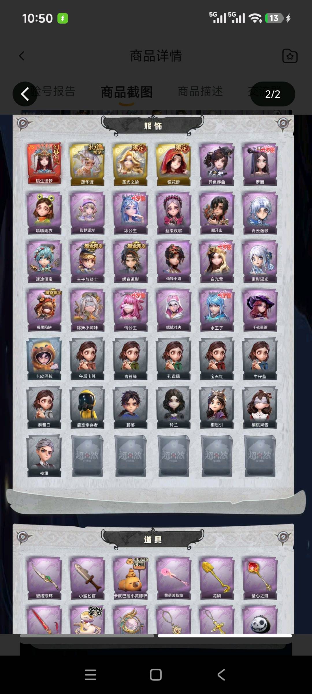 红皮1;金皮3;紫皮20;道具皮29;皮肤:巫铃儿-镜生遗梦,逍遥-莲华渡,薇薇安-圣光之谕,巫铃儿-镜花辞,小黄-异色序曲,小黄-罗丽,小黄-呱呱雨衣,爱丽丝-甜梦派对,爱丽丝-冰公主,爱丽丝-丝缕哀歌,零-搬开山,零-青云逸歌,阿念-迷途僵宝,阿念-王子与骑士,逍遥-绣春逍影,薇薇安-仙锋小姐,薇薇安-白光莹,巫铃儿-素影瑶光,莉莉-莓果陷阱,莉莉-除妖小师妹,莉莉-情公主,艾伦-绒绒对决,艾伦-水王子,兰-千夜星谕;道具:刺刀-碧络琅环,刺刀-小鲨匕首,铲子-卡皮巴拉小黄豚铲,铲子-赞萌波板糖,铲子-龙鳞,铲子-圣心之泪,桃木剑-凤鸣九天,长鞭-小狗蛇点点鞭,传送按钮-昆仑镜,摸金符-紫霄,摸金符-祝祷词,腰包-惊魂娃娃,腰包-宝剑八,短管猎枪-赞萌露比水枪,短管猎枪-星光的裁决,葫芦-伏妖塔,黄牛能量饮料-珍珠芭乐莓莓,黄牛能量饮料-青玉抱丹,额外的背包-飞花令,夜视仪-心跳眼镜,夜视仪-金丝眼镜,音响-鸣沙鼓,音响-happy猫,荧光棒-桃心-荧光棒-桃心,喷气背包-晶澜灵翼,转轮手枪-新星时代,电击枪-甜蜜泡泡枪,急救包-蔷薇物语,长枪-罪棘;美妆:美妆-暗夜小恶魔;饰品:头饰-精致露比头套,头饰-樱桃奶油布丁,头饰-惊魂南瓜头套,头饰-大葱明头套,头饰-火爆了头套,头饰-小财神豚豚头套,头饰-炙热烧烤,头饰-小狗蛇点点头套,头饰-鱼头怪头套,头饰-烈焰红唇头套,头饰-面具马头套,头饰-哈士奇头套,头饰-萨卡班甲鱼头套,头饰-嘻嘻头套,头饰-滑稽头套,头饰-呆滞头套,头饰-卑微头套,头饰-像素朋克墨镜,背饰-梵音莲华,背饰-晚安仪式,背饰-小小白光莹,背饰-蝶恋花,背饰-天使的呼唤,背饰-云梦之星,挂饰-九色祥鹿,挂饰-糖果守卫,挂饰-小鲨包包,挂饰-钗头凤,挂饰-未竟乐园,挂饰-天使消失的年代,美妆-暗夜小恶魔;动作:动作-伤心摇,动作-七仔摇,动作-sugar摇,动作-知世摇,动作-鹏友摇,动作-刀马舞,动作-DL摇,动作-鸳鸯戏,动作-luvaboy,动作-舞台中心,动作-小雨摇,动作-心跳摇,动作-带你逃跑吧,动作-要糖,动作-KT猫摇,动作-举牌,动作-律动迪斯科,动作-抬手,动作-失落,动作-小鸡舞;载具:载具-惊奇万圣涂装;工牌背景:卷珠帘,心同野鹤,蓝海奇遇,粉嫩小海狸,复活的肖像,水玲珑宫,佛系小豚,冰晶宫,花蕾城堡,情语塔,圣光之誓,点点萌伴,雷霆轩;工牌动作:元气剪刀手,虔诚之姿,净禅;员工:小黄,爱丽丝,零,阿念,逍遥,薇薇安,巫铃儿,莉莉,艾伦,爱德华,兰;累充4101元;铲铲币,瑕疵全皮号瑕疵全图鉴