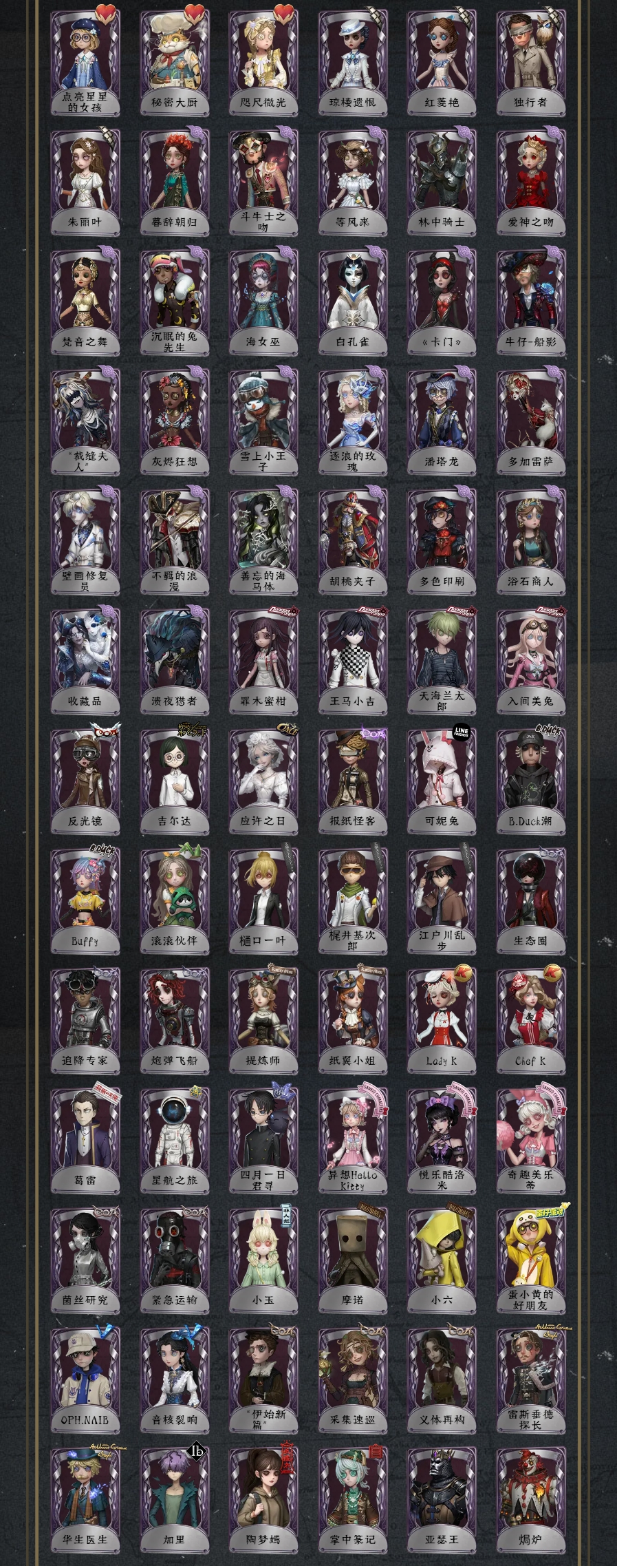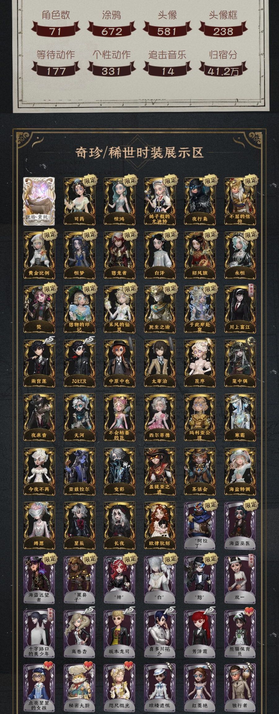 角色数71涂鸦672头像581头像框238等待动作177个性动作331追击音乐14归宿分41.2万犹格·索托斯之使司药惊鸿鸽子般的尤迪特夜行枭不屈的信仰黄金比例恒梦猎龙者白泽招风旗永恒荧猎物的印记采风的仙灵死生之谕于此岸赴宴川上富江雨宫莲JOKER中原中也太宰治花序笼中偶夜来香天河不会枯萎的花西尔菲德玛利亚公理寒霜今夜不再亚兹拉尔变彩盖提亚之遗茶话会海盐特调缚愿星辰长夜欧律狄刻“阿拉丁”海盗巫医海盗远望者“黑鼻子”“绯”“白”“黯”双一十字路口的美少年高卷杏坂本龙司喜多川祐介芳泽霞熊猫保育员点亮星星的女孩秘密大厨咫尺微光琼楼遗恨红菱艳独行者朱丽叶暮辞朝归斗牛士之吻等风来林中骑士爱神之吻梵音之舞沉眠的兔先生海女巫白孔雀《卡门》牛仔-船影“裁缝夫人”灰烬狂想雪上小王子逐浪的玫瑰潘塔龙多加雷萨壁画修复员不羁的浪漫善忘的海马体胡桃夹子多色印刷浴石商人收藏品溃夜猎者罪木蜜柑王马小吉天海兰太郎入间美兔反光镜吉尔达应许之日报纸怪客可妮兔B.Duck潮Buffy滚滚伙伴樋口一叶梶井基次郎江户川乱步生态圈迫降专家炮弹飞船提炼师纸翼小姐Lady KChef K葛雷星航之旅四月一日君寻异想Hello Kitty悦乐酷洛米奇趣美乐蒂菌丝研究紧急运输小玉摩诺小六蛋小黄的好朋友OPH.NAIB音核裂响“伊始新篇”采集速巡义体再构雷斯垂德探长华生医生加里陶梦嫣掌中篆记亚瑟王焗炉捣蛋裘克女仆装炽天使采药人永生花白兔先生郁金香之梦林间狩者镏金铜鹿白胡子宝藏猎人弹簧手思明绿纹大触万能钥匙Re-Swim纸心“月佑者”香薰流离的月光阿瓦尔的战车水晶烛台聚光灯下海西遗风不愿醒来的女孩仙鹤彼岸寄生之面克朗普斯安魂曲桃面书生神圣之辉“厄运”“朝圣者”冰中蝶笼中之蝶逆刃之鞭月下绅士阿波罗En ligne安宁“琥珀”月相历战猎人鸩纯白之盐守钟人禁闭院长“守财奴”红龙夫人缄默者噩之牙祝祷被时间遗忘的男孩善恶的本性宝钻女爵骨笛鼹鼠先生迷途诗人妄念的陈伤弄臣ACE女高音“宴舞”校对人霰蓝釉先生“亡灵”荒野女巫奶酪冥契衔尾蛇人造天堂动植物学教授沙滩漂移长生裁纸机藏清洁翼玛吉努迷迭香破魔之刃鬼天蛾神圣阿斯莫银骑士年岁暮影灵蛇执政官圣洁黑鸦墨韵恐惧的旧影幕外之音拂晓女士BISHOP-f1斐乐蒙的圣坛行于界限间“有机磷”“膨化”隐于夜色中图鉴内容来源于游戏数据