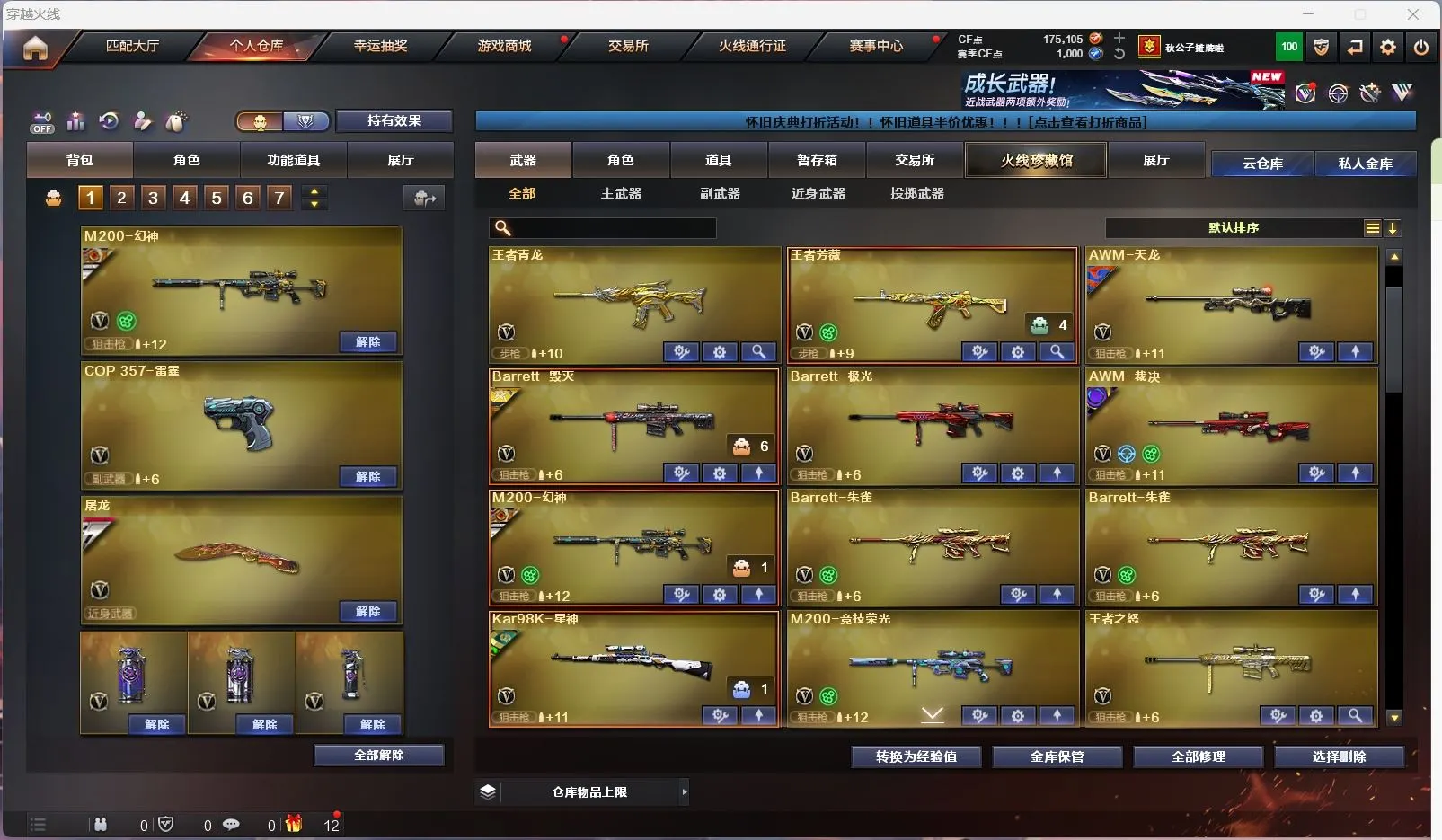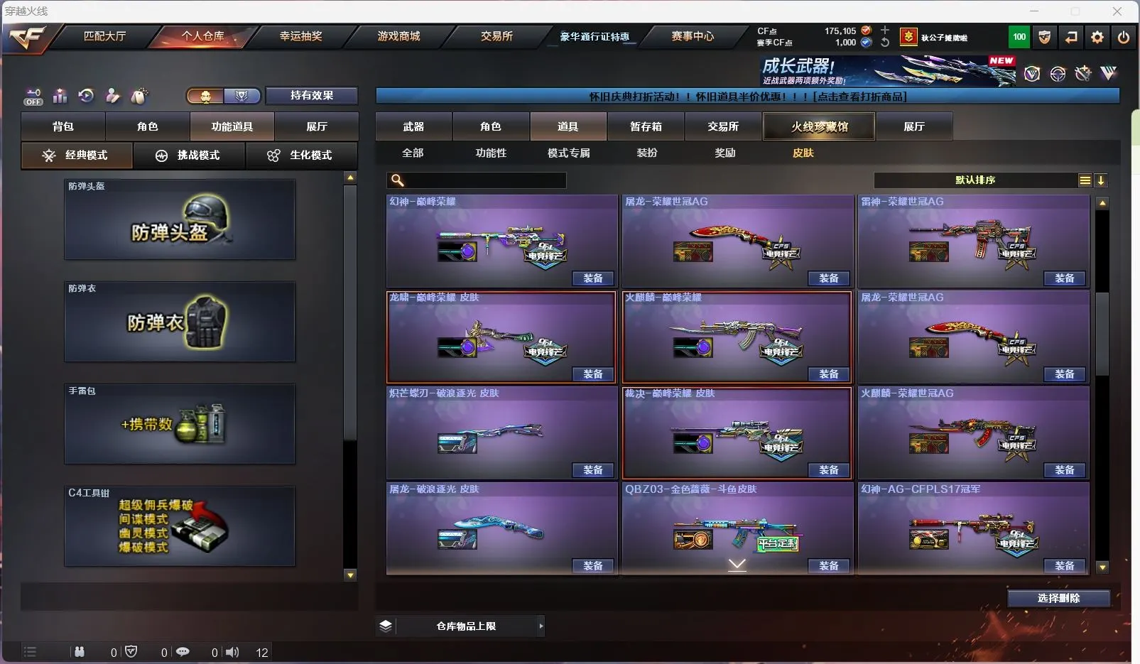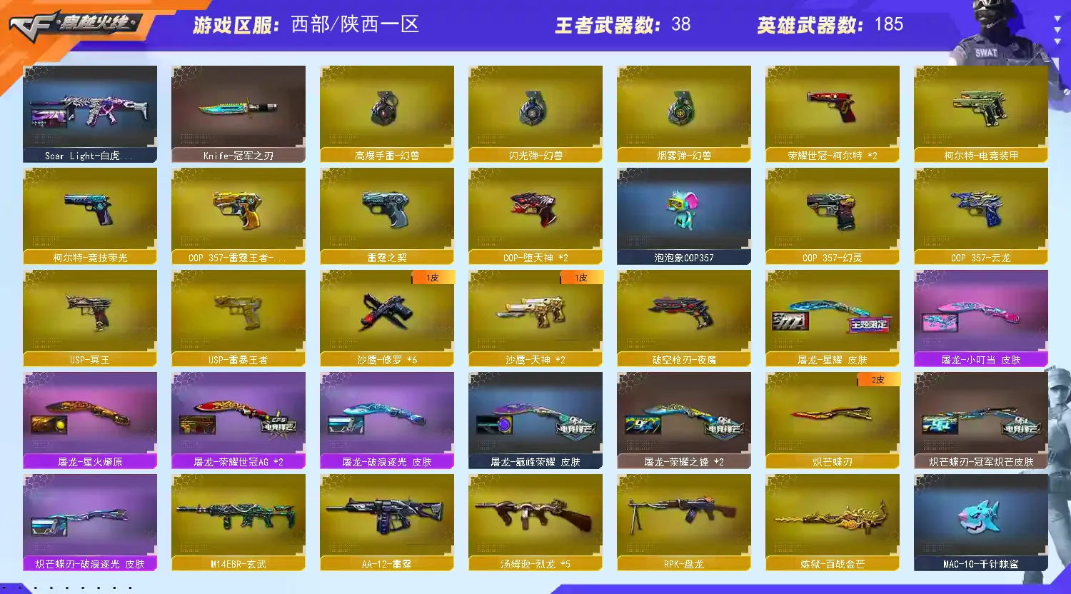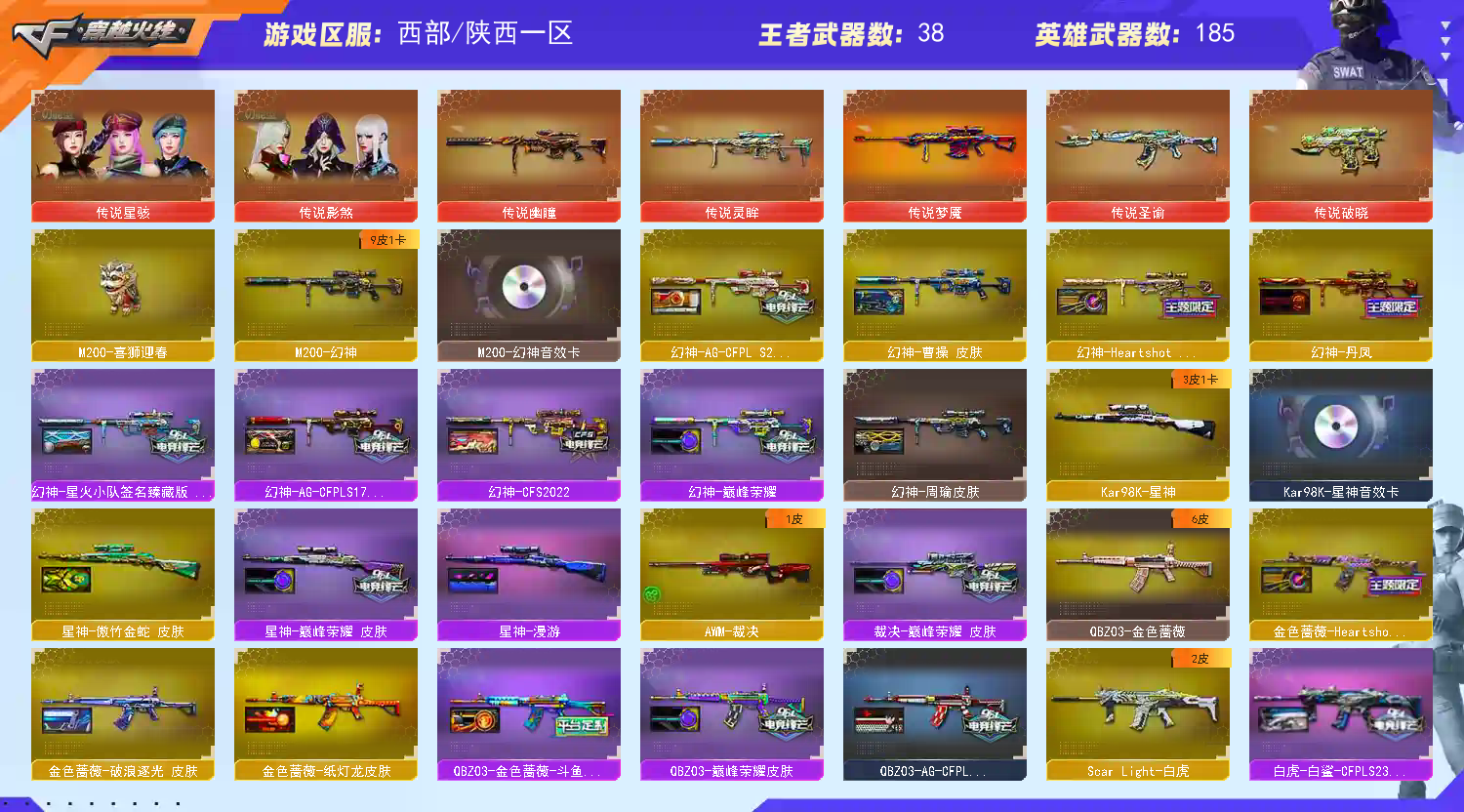 【亮点解析 双传说角色 幻神9皮带卡 星神三件套 裁决带皮】【传说星骇 传说影煞】【传说幽瞳 传说破晓 传说圣谕 传说梦魇 传说灵眸 】【m200幻神+音效卡+周瑜+巅峰荣耀+ag17冠军+cfs2022+星火小队+丹凤+女团+ag24冠军+曹操 +冠军之刃】【98k星神+音效卡+傲竹金蛇+巅峰荣耀】【m200竞技荣光套+云悠悠】【王者幻神 王者风神 王者星霆】【盘龙 炼狱 5烈龙 炽芒蝶刃+冠军炽芒】【scar白虎+白鲨冠军+暗星】【qbz金色蔷薇+女团+斗鱼+巅峰荣耀+ag19冠军】【qbz天罚 】【朱雀】【玄武】【火麒麟+冠军之心 +巅峰荣耀+荣耀世冠+横秒之巅】【黑龙】【雷神+卡+n9+冠军之魄+虎牙+荣耀之魄+巅峰荣耀+荣耀之魄十周年+女团】【黑骑士+卡+冠军之势 】【毁灭+卡+冠军之怒+荣耀之怒+sv16冠军】【极光】【裁决+巅峰荣耀 】【武器:黑武士 堕天神 武圣 夜魔 云龙 王者之心 王者之魄 王者冰魄 王者炎心 荣耀世冠火麒麟 荣耀世冠雷神 qbz王者蔷薇 王者青龙 王者芳薇 】【21手枪:修罗*6 天神 武圣 雷霆 堕天神 夜魔 幻灵 竞技荣光 usp冥王 云龙 沙鹰幻兽 荣耀世冠柯尔特 雷霆王者 usp雷暴王者】【27刀具:屠龙*5 龙啸 擎天 麒麟刺 尼泊尔雷霆 斩神刀雷暴 堕天神 幻灵之峰 麒麟刺 云龙扇 王者之锋 王者之啸 王者之击 荣耀世冠龙啸 王者玉锋 王者冰锋 女皇利刃幻兽 】【14雷套:幻兽雷 雷暴雷 雷霆雷 堕天神雷*6 夜魔雷*5】【小人枪:雷神小红 m200喜狮迎春 cop白鲨 MAC-10-千针棘鲨】【音效卡:星神音效卡 幻神音效卡 黑骑士音效卡 毁灭音效卡 雷神音效卡 】【四防角色:王者葵惊若翩鸿 王者潘多拉 王者岚兮儿 职业经理 】