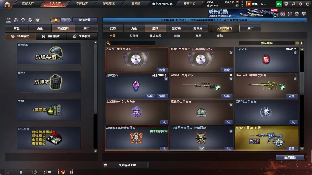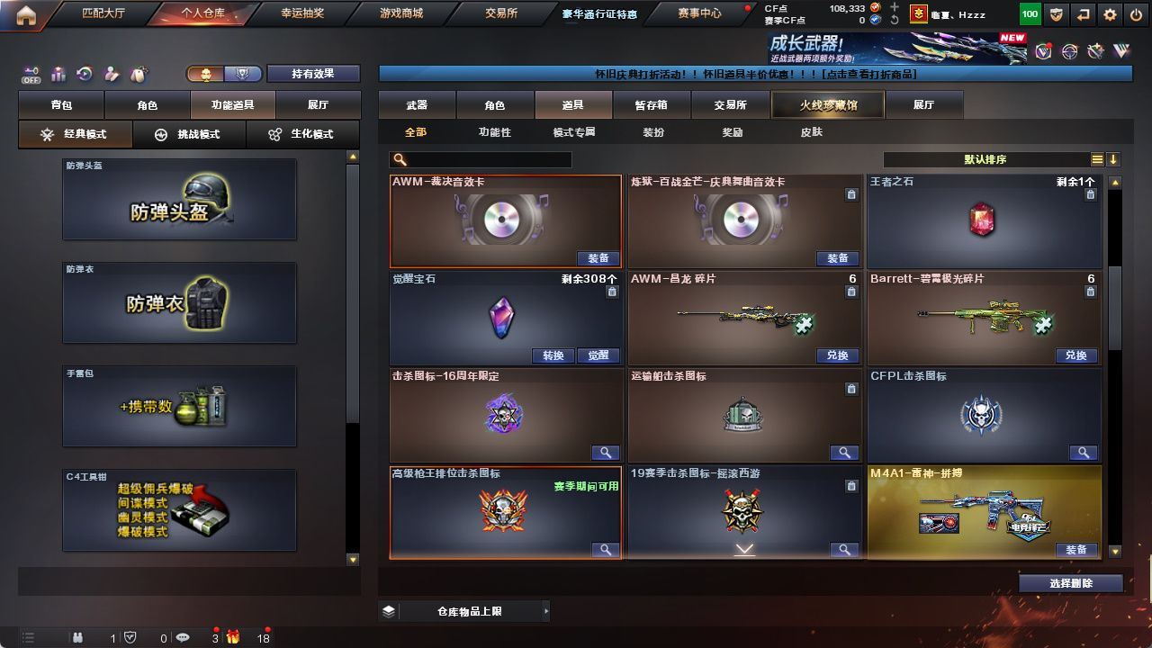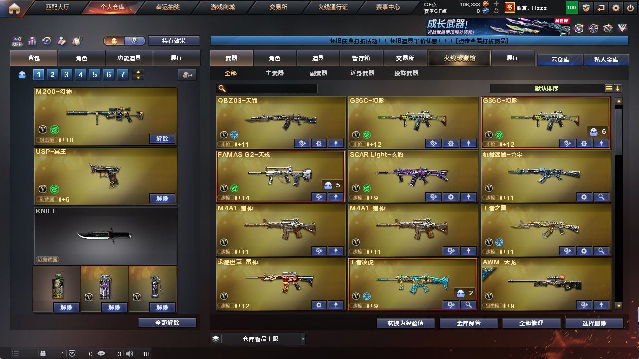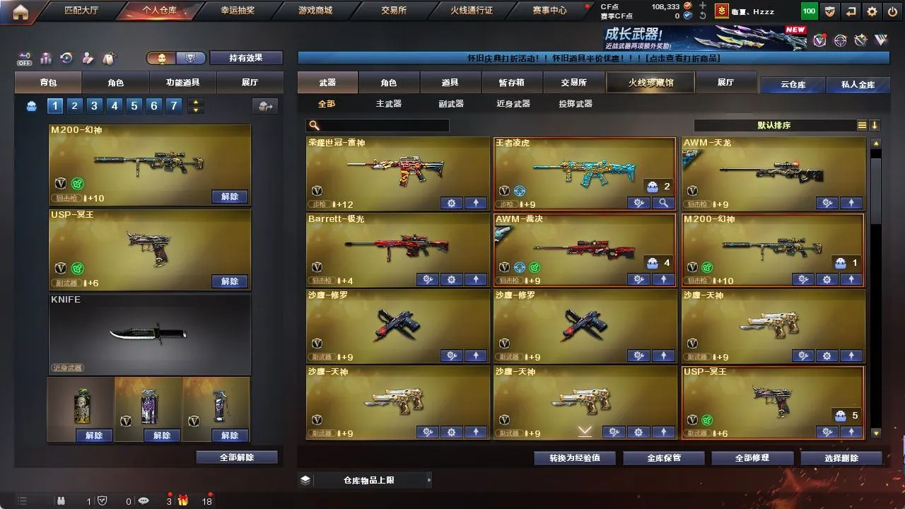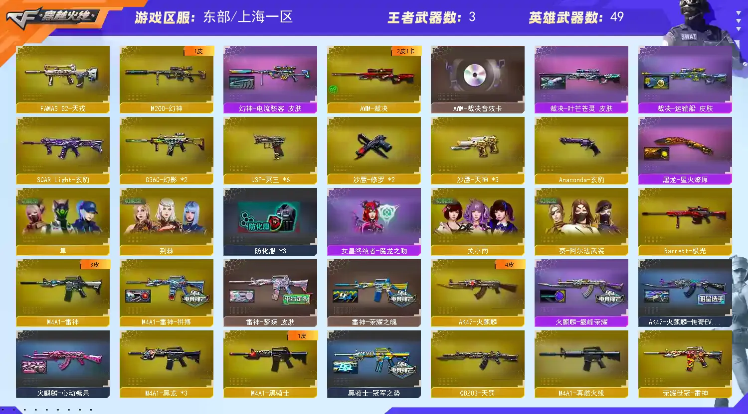【M200-幻神+幻神-电流骇客皮肤】【AWM-裁决+裁决-运输船皮肤+裁决-叶芒苍灵皮肤+AWM-裁决音效卡】【G36C-幻影(2)】【SCAR Light-玄豹】【FAMAS G2-天戎】【王者之翼-觉醒版】【沙鹰-天神(3)/沙鹰-修罗(2)/USP-冥王(6)/Anaconda-玄豹】【擎天/屠龙(3)/雷霆之锋/丛林匕首-玄豹(3)/麒麟刺-百战金芒/龙啸-烈火龙威】【玄豹套装】【王者凌虎/王者冰锋】【关小雨/隼/荆棘/葵-阿尔法武装/零·纪元斯沃特-X/潘多拉-N/云海玲珑/铁骑-乘风破浪/零-水下丽影】【炼狱-百战金芒-庆典舞曲音效卡】【毁灭-梦蝶皮肤/天龙-CFSTAR/AK47-火麒麟-传奇EVEN/火麒麟-CFSTAR/火麒麟-巅峰荣耀/火麒麟-心动糖果/AK47-火麒麟-百城23冠军皮肤/M4A1-雷神-拼搏/雷神-诺拉皮肤/雷神-梦蝶皮肤/M4A1-雷神-白鲨皮肤/雷神-荣耀之魄/黑骑士-冠军之势/修罗-CFSTAR/屠龙-惊鸿皮肤/屠龙-星火燎原】【Barrett-极光/AWM-天龙/M4A1-雷神/荣耀世冠-雷神/M4A1-黑龙(3)/M4A1-龙血/M4A1-黑骑士/M4A1-猎神(2)/AK47-火麒麟/AK47-无影/AK47-黑武士/QBZ03-天罚/机械迷城-穹宇】