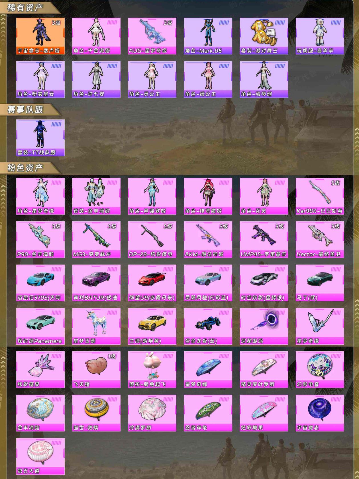 【稀有资产】宇宙意志-塞卢姆[3级]/角色-千金淑猫/AUG-星梦奇缘/角色-Mark.06/套装-派对舞王/玩偶服-喜羊羊/角色-粉雾星云/角色-许七安/角色-灵公主/角色-情公主/角色-海琴烟