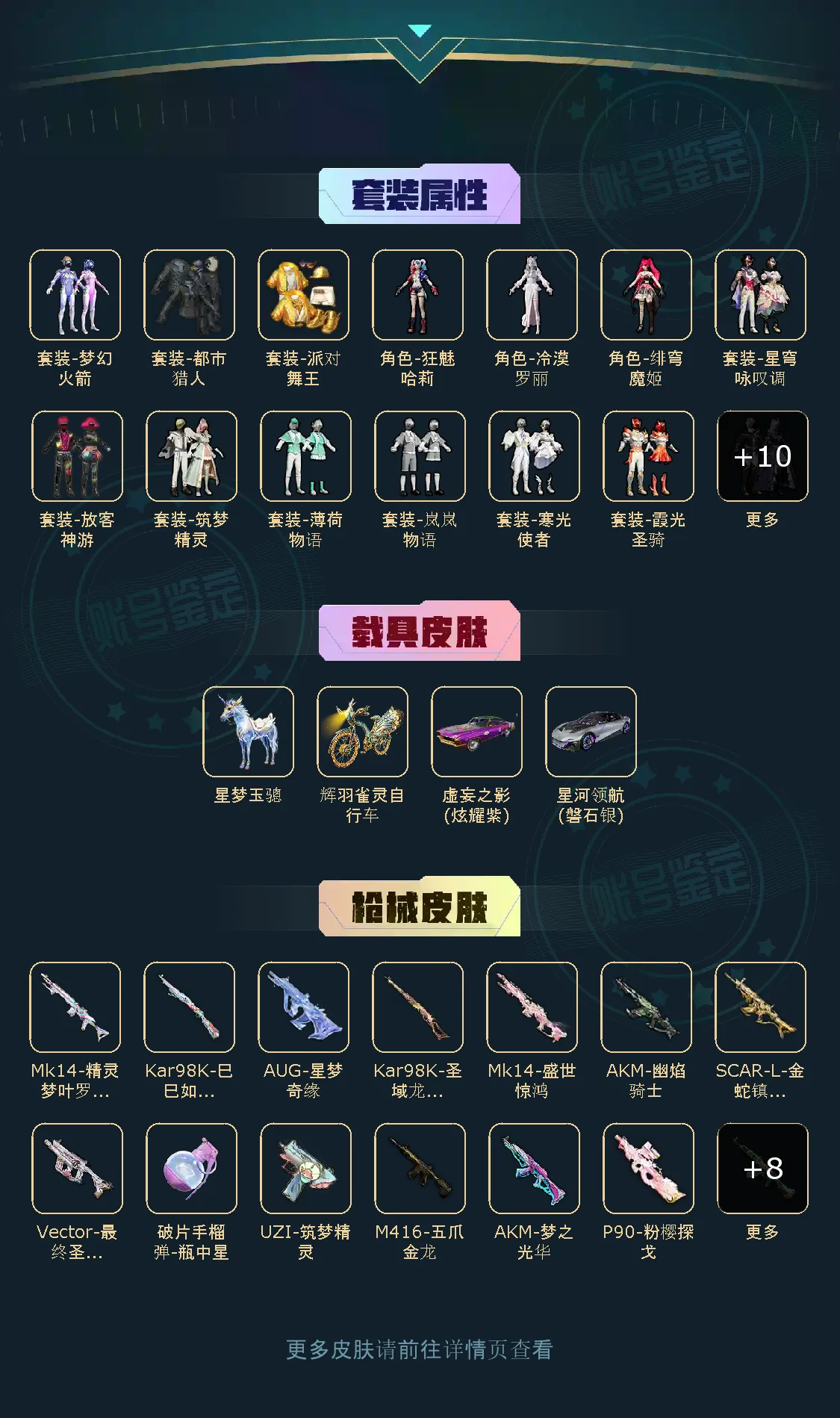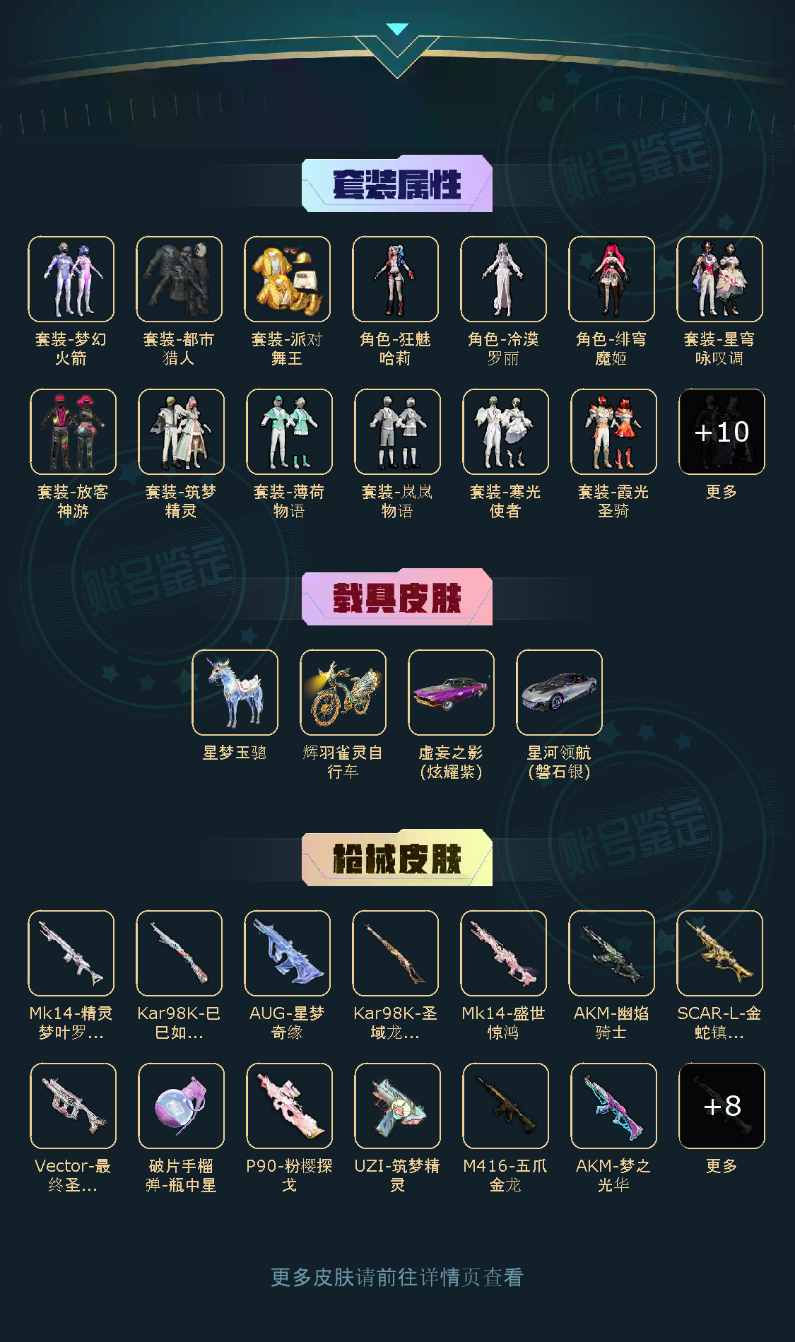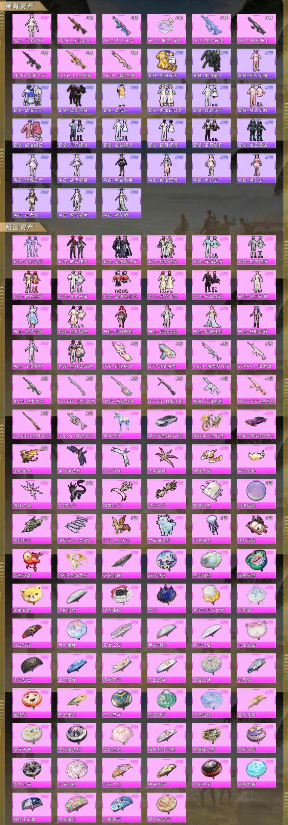 【稀有资产】角色-千金淑猫/M416-五爪金龙/AKM-梦之光华/破片手榴弹-瓶中星球/AUG-星梦奇缘/AKM-幽焰骑士/M416-墨龙九天/SCAR-L-金蛇镇世/Mk14-盛世惊鸿/套装-派对舞王/套装-都市猎人/套装-粉红小猪/套装-浪漫天命/套装-暗影哥特/套装-龟仙人/套装-兔兔白日梦/套装-晶辉守护/套装-绒宝小鹅/套装-浪漫假日/套装-牛仔情诗/套装-星谷精灵/套装-银月精灵/套装-圣穹绘梦/套装-虚空漩涡/角色-粉雾星云/角色-都市丽猫/角色-摩登魅猫/角色-俏兔智灵/角色-灵公主/角色-情公主/角色-白光莹/角色-鲛海歌灵/角色-海琴烟