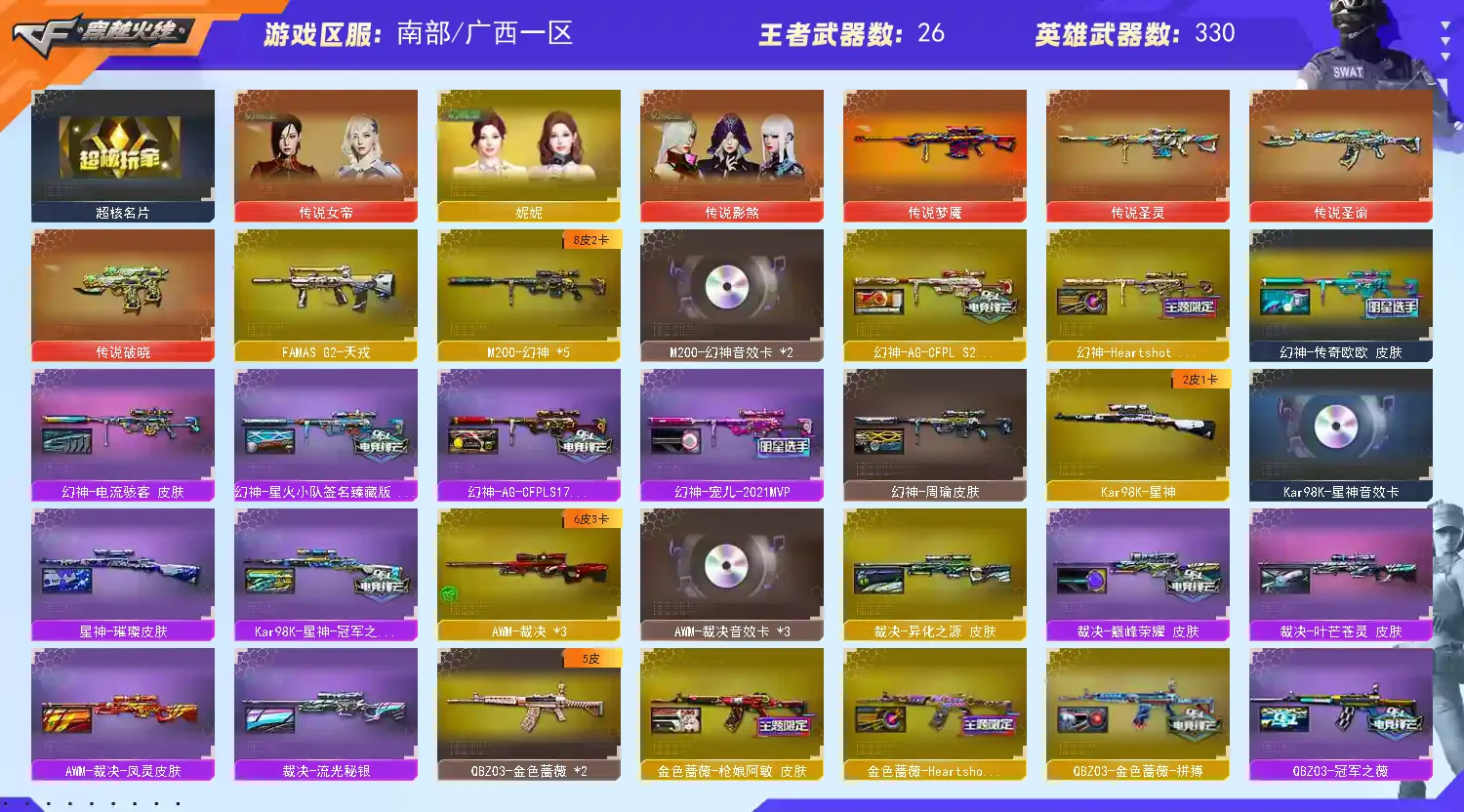 大满贯,狙击满音效。生化():粉象+传说影煞+毒蜂术士+沙漠攻瑰+八面玲珑+王者玄武+6盘+6炼狱+虎牙斗鱼平台皮+双炼狱音效+9烈龙+毒蜂+蝴蝶+萌兔+清道大等+8把蝴蝶刀+配带12张皮肤。爆破:妮妮+传说女帝+传说圣瑜+幻神8皮二件套+星神三件套+裁决三件套+毁灭三件套+极光三件套+白虎+qbz+法玛斯+18把副手】【荣耀之巅36豆】【Lv.102 荣耀元帅】VIP6363V,17王者,3炫金,传说圣谕/传说梦魇/传说圣灵/传说破晓/幻神Heartshot/幻神电流骇客 /幻神星火小队/幻神AGCFPLS24冠军/幻神欧欧 /幻神宠儿/幻神周瑜/幻神AG/星神冠军之星/星神璀璨/传说女帝 传说影煞 葵/樱/魅影/炫/迷迭香/M200-幻神(5)/M200-竞技荣光/王者幻神-觉醒版/Barrett-毀灭(7)/Barrett-极光/电竞装甲套装/竞技荣光套装/夜魔套装/雷暴套装/云龙套装/M200-幻神音效卡/M200-幻神-动感闪耀音效/Kar98K-星神音效卡/白虎-盛典舞曲音效卡/M4A1-雷神音效卡/M4A1-黑骑士音效卡/死神-雪域霜狐-怀旧音效卡/Barrett-毁灭音效卡/AWM-裁决音效卡/Barrett-极光音效卡/Barrett-碧香极光音效卡/炼狱-百战金芒-庆典舞曲音效卡/加特林-炼狱音效卡/屠龙-动感闪耀 音效卡/麒麟刺-百战金芒-盛典舞曲音效卡