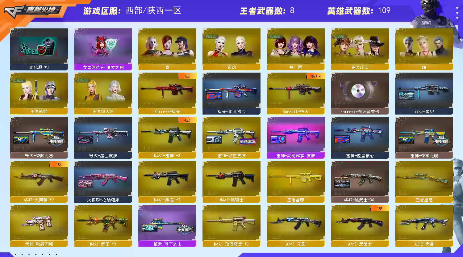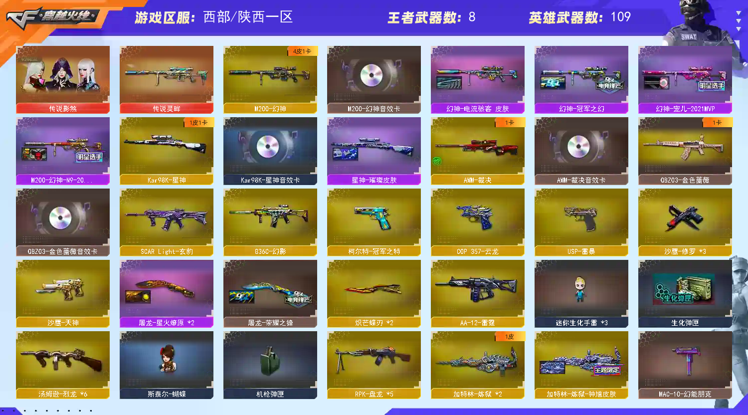 【亮点解析 幻神三件套 Kar98K-星神三件套 生化六烈+蝴蝶+蝴蝶刀】【四防传说影煞】【M200-幻神+音效卡+幻神-宠儿+电流骇客+幻神-冠军之幻+n92022mvp】【Kar98K-星神+音效卡+璀璨】【王者星霆】【传说灵眸】【g36c幻影】【QBZ03-金色蔷薇+音效卡】【生化 5盘龙 2炼狱 6烈龙 蝴蝶刀 蝴蝶】【裁决+音效卡】【毁灭+音效卡】【极光】【玄豹】【火麒麟】【黑龙】【雷神+航星+雷神-荣耀之魄】【黑骑士】【王者之势】【无影 死神 黑武士 天启 超新星 hk417-朱雀+音效卡】【8手枪 修罗*3 天神 usp雷暴 冠军之特 cop云龙】【17近战 屠龙*3 龙啸 擎天*2 麒麟刺 斩神刀雷暴 幻灵之锋 炽芒蝶刃蝴蝶刀*2 游乐设施 王者之锋】【手雷 雷暴*8 幻灵雷 云龙雷 】【四防 王者炽天使 王者影豹】【幻神音效卡 Kar98K-星神音效卡 裁决音效卡】