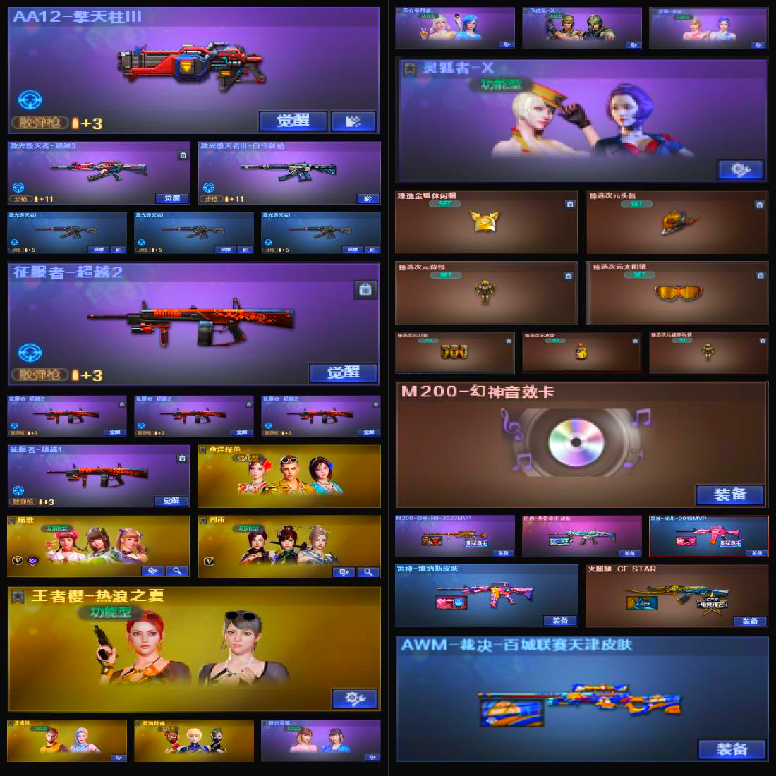 王者炫 M200幻神+N92022MVP皮肤+音效卡 王者星霆【英雄武器】M200-幻神/Barrett-极光/M4A1-雷神/黑骑士-海王/AN94-超新星/QBZ03-金色蔷薇/汤姆逊-烈龙(3)/COP 357-云龙/沙鹰-天神/沙鹰-修罗(3)/USP-雷暴/云龙扇/屠龙(2)/幻灵之锋/斩神刀-雷暴/高爆手雷-幻灵(2)/高爆手雷-雷暴(5)/烟雾弹-幻灵(2)/烟雾弹-雷暴(5)/闪光弹-云龙/闪光弹-幻灵(2)/闪光弹-雷暴(4)/超新星-热带奇洋/黑武士-锦绣游龙/烈龙-云海游龙/龙啸-热带奇洋/擎天-云海游龙/手雷-热带奇洋/手雷-云海游龙【重要角色】晴雅/司雨/王者炫/王者樱-热浪之夏/云海玲珑【重要武器皮肤】M200-幻神-N9-2022MVP/修罗-冠军之魂/AWM-裁决-百城联赛天津皮肤/雷神-宠儿-2019MVP/雷神-维纳斯皮肤/火麒麟-CFSTAR/白虎-热带奇洋 皮肤/屠龙-春桃 皮肤【重要音效卡】M200-幻神音效卡