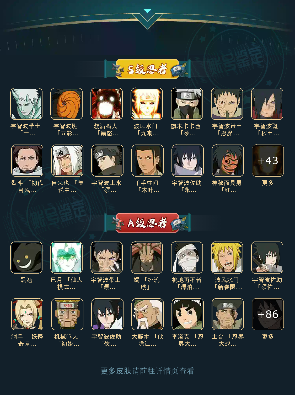 仙人自来也 纲手 波风水门 百战水门 猿飞日斩 千手柱间 宇智波斑 宇智波鼬 舞之自来也 大蛇丸 百战大蛇 秽土四代 秽土三代 秽土长门 仙人兜 黄猿九喇嘛鸣人 紫狗永恒佐助 樱婊忍战樱 秽土鼬 普通自来也 百豪纲手 死门凯 二代扉间 秽土二代 秽土初代 秽土柱间 白面具 须佐卡卡西 小胡子鬼灯幻月 雷影 土影 无 佩恩 百战佩恩 青年柱间 创立初代 秽土斑 青年斑 解斑 须佐止水 虎皮 破面带土 红夜带土 罗砂 秽土三代风影 忍战雷影 三代雷影 金角银角 秽土半藏 忍战大野木 小土豆 天道超 大筒木桃式 大筒木金式 钢铁之躯凯 桀骜之刃阿斯玛 狂野之鲨鬼鲛 飞段 黑飞段 百豪樱 忍战李 大卡卡西 五代水影照美冥 宇智波鼬 仙鸣 九尾查克拉鸣人 鹰佐 奇拉比 青年艾 半蛇兜 晓蛇 新春鼬 面麻 须佐佐助 疾风咒印佐助 忍战宁次 忍战天天 最终章雏田 幻容卡卡西 神卡 忍战卡卡西 泳装卡卡西 忍战凯 青春哥 惊门凯 爱情哥 新春止水 新春水门 青年水门 青水 新春我爱罗 泳装照美冥 侠隐照美冥 侠隐纲手 侠隐兜 漂泊再不斩 漂泊佩恩 漂泊二代 漂泊小南 漂泊佩恩 三船 青年三船 青年长门 泳装南 新春南 黑绝 新春大蛇丸 晓创生角度 晓创生蝎 晓创生飞段 泳装鼬 鲛肌融合鬼鲛 新春迪达拉 秽土迪达拉 恶灵之影飞段 暴怒带土 忍战黄土 卑留呼 桃博 黑土