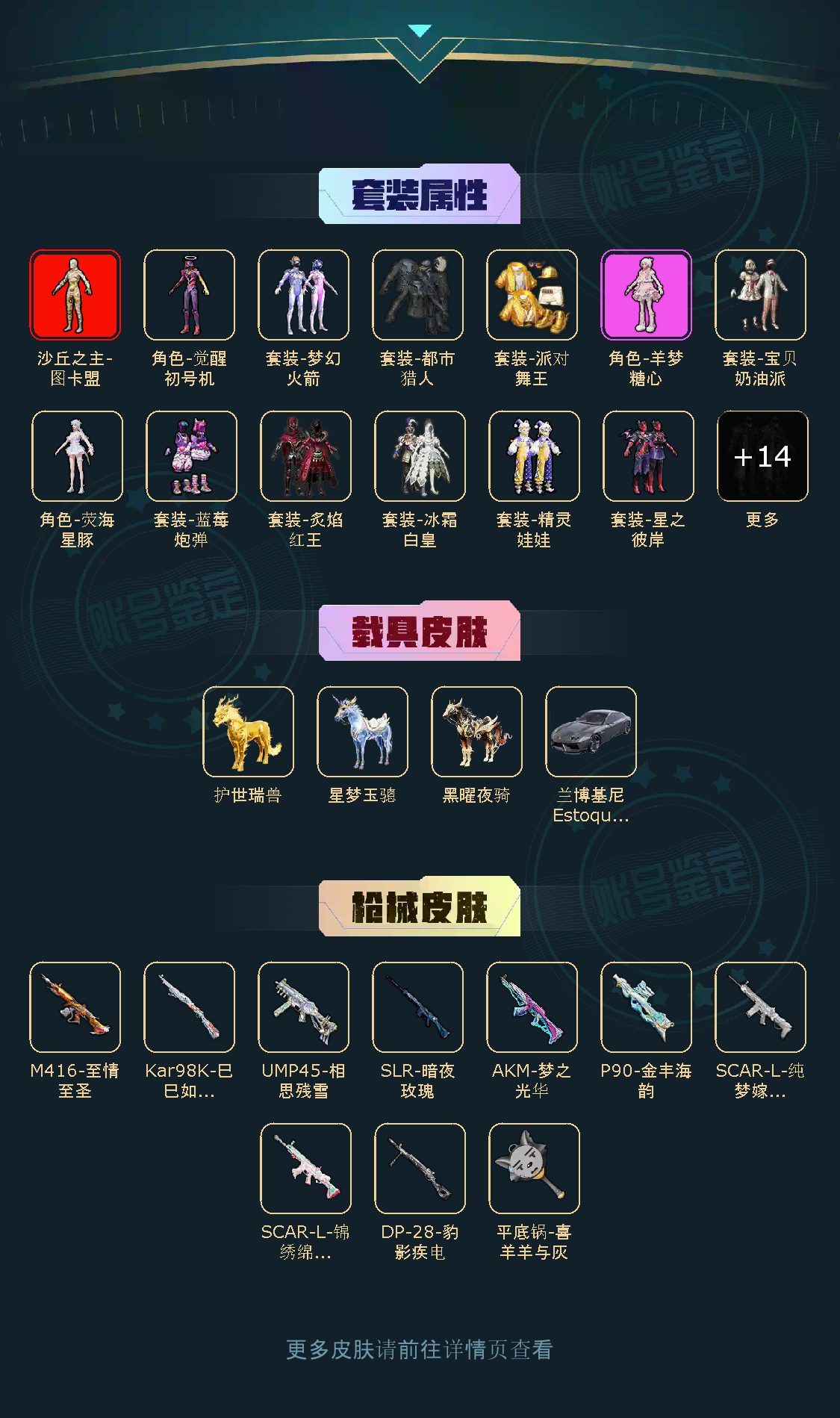 【稀有资产】沙丘之主-图卡盟[4级]/套装-第五大道/角色-羊梦糖心/M416-至情至圣/AKM-梦之光华/角色-Mark.06/套装-派对舞王/套装-深海小丑鱼/套装-都市猎人/套装-奇异狩猎者/套装-暗夜魅影/套装-粉红小猪/套装-浪漫天命/套装-暗影哥特/套装-龟仙人/套装-狂沙舞者/套装-东方飞龙/套装-冷酷挑战者/玩偶服-卖崽青蛙/玩偶服-懒羊羊/玩偶服-美羊羊/玩偶服-喜羊羊/角色-粉雾星云/角色-俏兔智灵/角色-情公主/角色-白光莹
