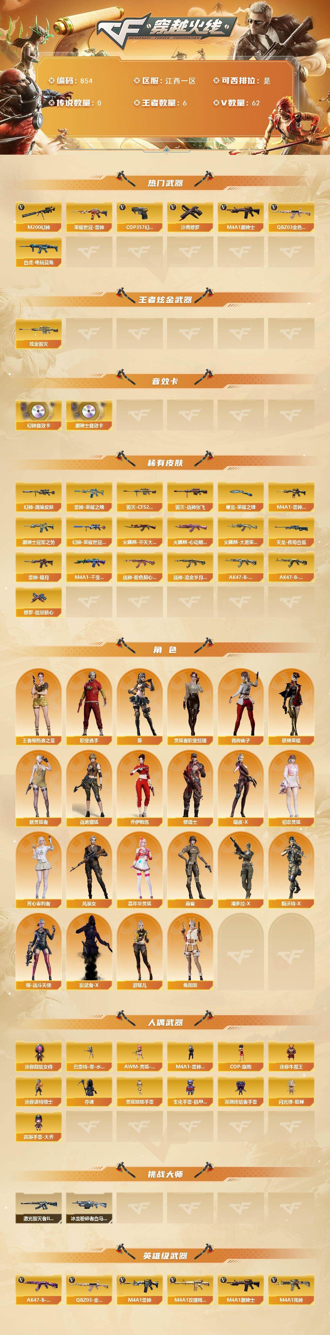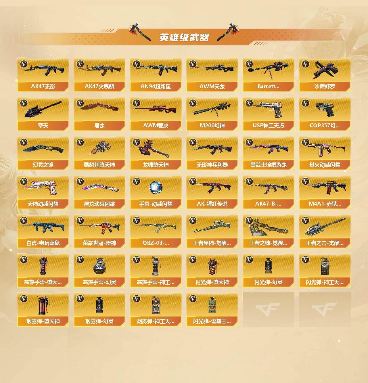 【QBZ03-金色蔷薇,M200-幻神,荣耀世冠-雷神,白虎-电玩蓝兔,M4A1-黑骑士,COP 357-幻灵,沙鹰-修罗*2】【M200-幻神音效卡,M4A1-黑骑士音效卡】【幻神-周瑜皮肤,M200-幻神-荣耀世冠白鲨,雷神-暗月,雷神-荣耀之魄,M4A1-雷神-CFS 2019,火麒麟-平天大圣,火麒麟-大唐荣光,火麒麟-心动糖果,毁灭-CFS2020,毁灭-战神张飞,M4A1-千变-孔明皮肤,黑骑士-冠军之势,战神-粉色甜心皮肤,战神-流金岁月皮肤,AK47-B-常胜将军-刘备,AK47-B-常胜将军-孙权,AWM-天龙-传奇白鲨,修罗-能量核心,屠龙-荣耀之锋】【葵,战地猎狐,王者樱-热浪之夏,乔伊教练,修道士,暗夜-X,初恋灵狐,芳心审判者,风暴女,嘉年华灵狐,灵狐者-职业经理,麻雀,潘多拉-X,青霞仙子,斯沃特-X,铁骑荣耀,兔囡囡,新灵狐者,樱-战斗天使,影武者-X,游珑儿,职业选手】【人偶武器:M4A1-雷神-精英刀锋,巴雷特-零-水下丽影,AWM-灵狐-15周年嘉年华,COP-旗袍,迷你牛魔王,迷你波特博士,夺魂,生化手雷-机甲核心,深渊终结者手雷,闪光弹-貂蝉,高爆手雷-大乔,迷你超能女侍,灵狐娃娃手雷】【AK47-火麒麟*2,M4A1-雷神,M4A1-黑骑士,AK47-无影,M4A1-死神,AN94-超新星,无影-神兵利器,黑武士-锦绣游龙,M4A1-玫瑰精灵,QBZ03-金色蔷薇,烈火-动感闪耀,AK-47-猩红传说*3,AK47-B-战神,AK47-B-常胜将军,QBZ-03-王者蔷薇-觉醒版,白虎-电玩蓝兔,荣耀世冠-雷神,AWM-天龙,Barrett-毁灭,AWM-裁决,M200-幻神,王者星神-觉醒版,沙鹰-修罗*2,COP 357-幻灵,USP-神工天巧,天神-动感闪耀,屠龙,麒麟刺-堕天神,擎天,幻灵之锋,屠龙-动感闪耀,龙啸-堕天神*2,王者之啸-觉醒版,王者之击-觉醒版,高爆手雷-堕天神*2,高爆手雷-幻灵*4,高爆手雷-神工天巧,手雷-动感闪耀,闪光弹-堕天神*2,闪光弹-幻灵*4,闪光弹-神工天巧*2,闪光弹-雷霆王者-觉醒版,烟雾弹-堕天神*2,烟雾弹-幻灵*3,烟雾弹-神工天巧,M4A1-赤狱骑士】【AG战队炫彩背包,BS战队炫彩背包,全能枪王背包,炫彩背包,超级背包,女皇终结者-魔龙之吻,救世主-黑桃战神,黄金生化钩,夺命之镰,防化服,金色流光-枪王排位*2,星辰流光-枪王排位,巅峰赛先锋-金色流光,流光-再燃火线,枪王排位28赛季金色流光,枪王排位29赛季金色流光,电玩兔兔表情,动感闪耀表情,EP战队名片,EP战队喷图,EP战队击杀图标,C4-高无钳,C4-沙漠,C4-再燃火线,防弹头盔*3,防弹衣*3,C4工具钳*2,手雷包】