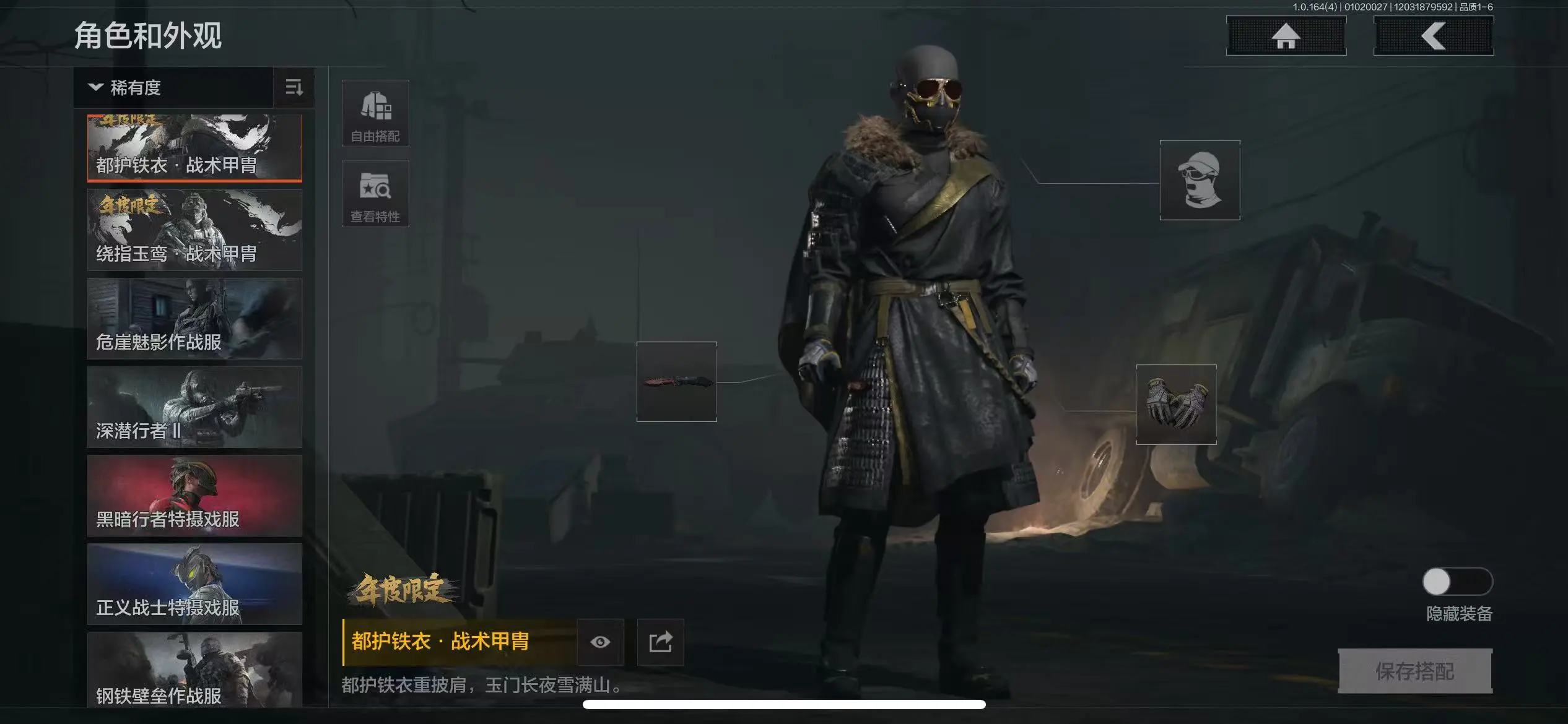 14金衣16金刀5手套2橙枪23金枪 骑士典范.艾尔熙德 冥王 黑卡蒂 冥河 脉冲.马克西姆 朱迪.阿尔瓦雷兹 强尼 都护铁衣.战术甲胄 绕指玉鸾战术甲胄 危崖魅影作战服 黑暗行者特摄戏服 正义战士特摄戏服 钢铁壁垒作战服 瑞兔折刀