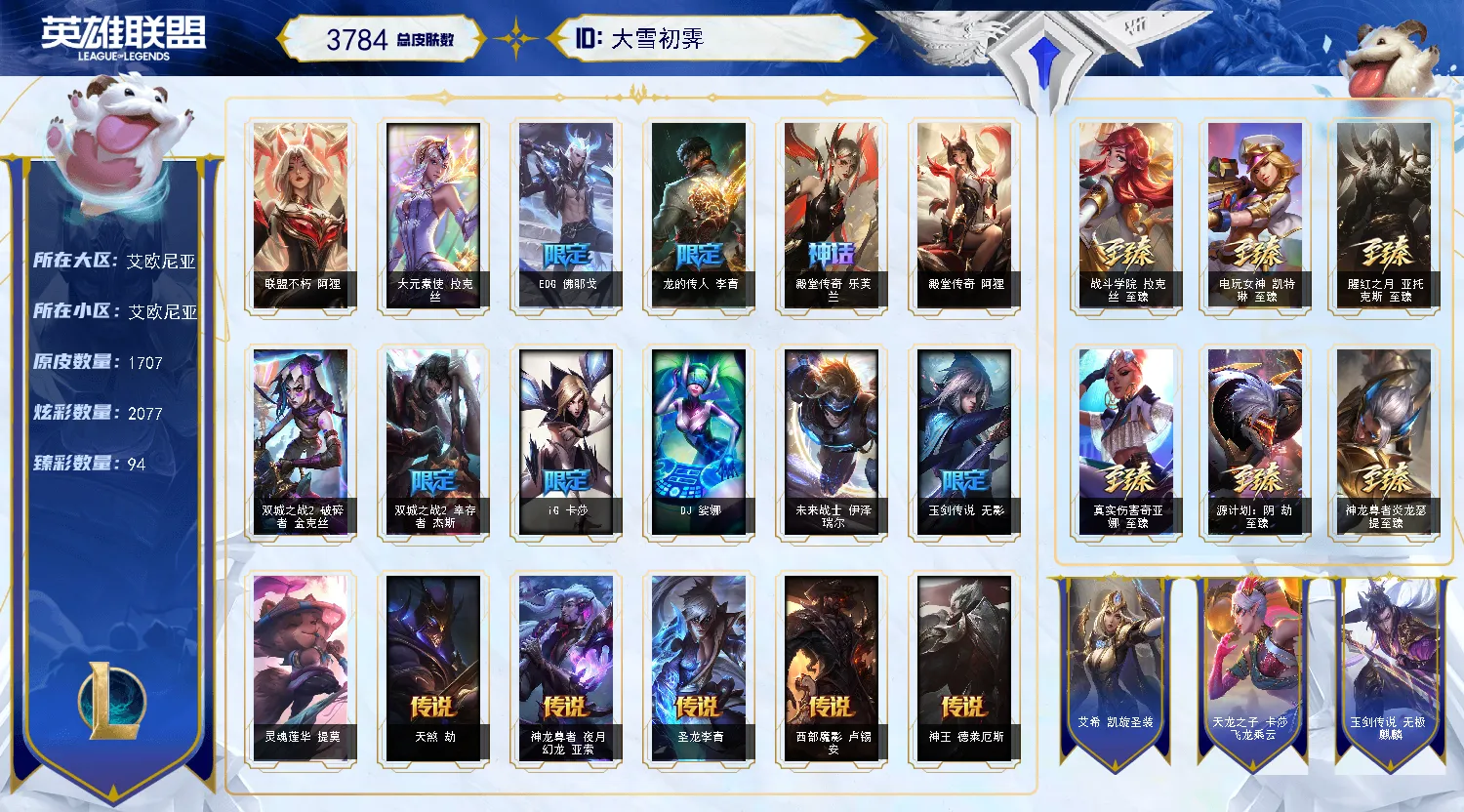 云顶、峡谷皮肤超级号1700原皮-晴天-艾欧尼亚-不朽阿狸-满终极皮肤-云顶65神话!