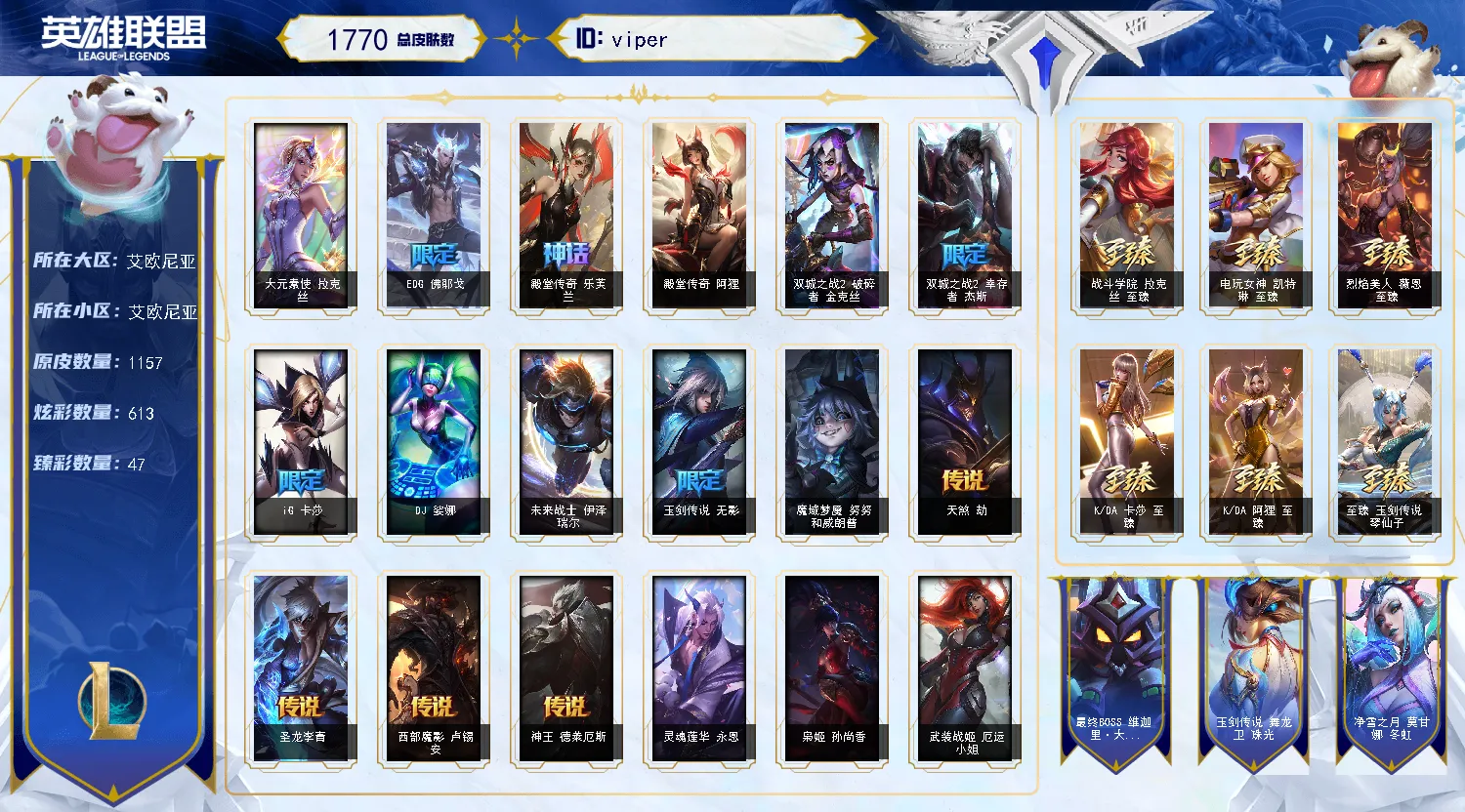 艾欧尼亚|1763皮|69神话|殿堂阿里|圣堂金克丝|EDG破军套|斗魂莲花套|云顶七神话|男女刀