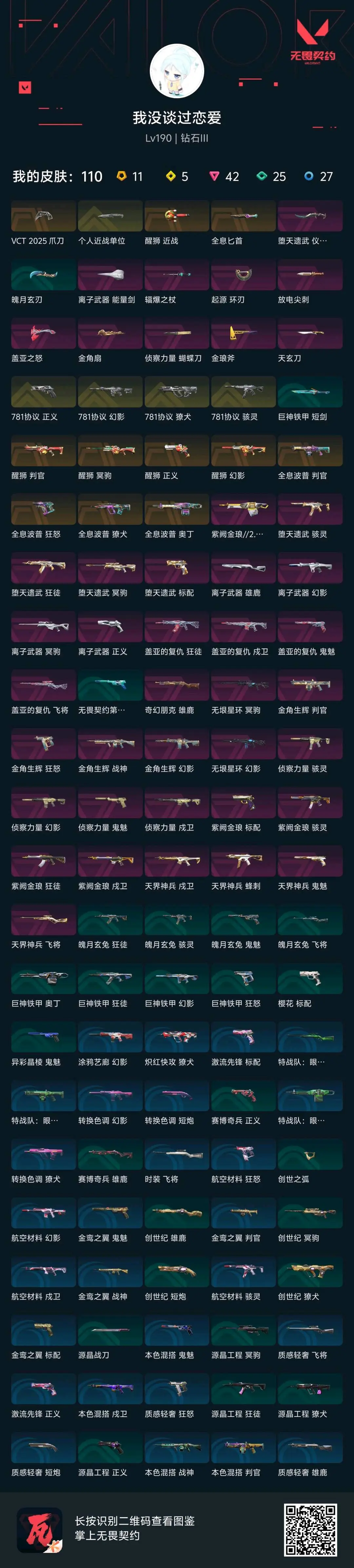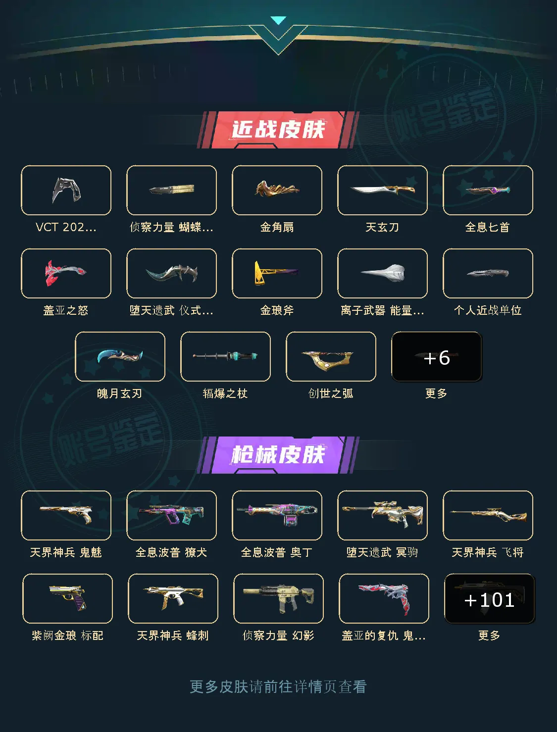 12个套装、VCT2025爪刀✅侦查套,紫金套,天界套✅781协议套,醒狮套,全息套✅盖亚套,堕天套,离子套。金角生辉套,魄月玄兔套,巨神铁甲套。