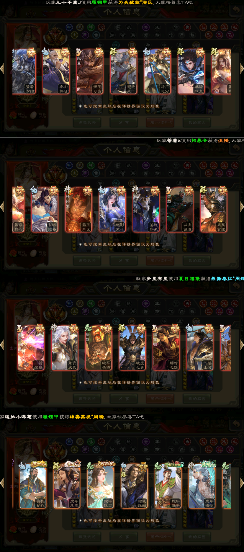 皮肤:潜蛟觊天.钟会、气荡山河.曹丕、魅影萦心清河公主、昭威淮南.司马昭、破宇开天.文鸯、势若万钧.文鸯、举棋若定戏志才、兔年春节.曹婴、才广志宏.星周不疑、长坂败备.曹纯、泰山捧日.程昱、兔年冬日.SP蔡文姬、明珠耀躯.甄姬、龙年中秋.曹植、安民护祚.钟繇、竭战鳞伤.曹昂、墨点江山.郭嘉、龙生九子.张辽、朝华同袍.十常侍、舞惑君心貂蝉、扬刀立威.麹义、盛气凌人.许攸、冠绝天下.南华老仙、霜刃绚练.灵雎、魂牵梦萦.灵雎、道法显威.左慈、蛇年限定.左慈、鸩杀少帝.李儒、虎年冬至.张琪瑛、锦帆游侠.星甘宁、超脱于世.庞德公、安民护祚.陶谦、鼠年七夕.吕布、虓虎之勇.吕布、声震寰宇.袁绍、每战必克.高顺、威显官渡.高览、单骑救主.SP赵云、斧引霹雳.星徐晃、知天难易.阎象、倚星折月.神郭嘉、鉴往知来.神司马懿、战龙在野.神赵云、匡汉延祚.神荀彧、霸王再世.神孙策、勇撼日月.神太史慈、虎年清明.神郭嘉、绽焰摧枯.神陆逊、兼资文武.神吕蒙、威灵尽显.孙寒华、破军杀将.徐盛、义除三害.周处、龙年七夕.陆逊、永开吴祚.孙权、兔年清明.周瑜、鼠年春分.小乔、涤荡江东.太史慈、星流霆击.孙尚香、兔年中秋.孙尚香、虎踞江东.孙策、剑起惊澜.吕蒙、珠玉琳琅.大乔、以身证道.关羽、一箭定情.SP孙尚香、龙年限定.诸葛亮、明良千古.关羽、临军对阵.张星彩、绵竹之殇.诸葛瞻、兔年春节.关银屏、明良千古.黄月英、龙御天下.刘备、虎年冬至.马超、火烧博望.卧龙诸葛、明良千古.张飞、锐不可当张翼、蛇年限定.孙寒华、笼中箜响.周妃、蛇年端午.鲁肃、奋钺振旅.皇甫嵩、威名尽显.SP赵云、蛇年中秋.甘夫人