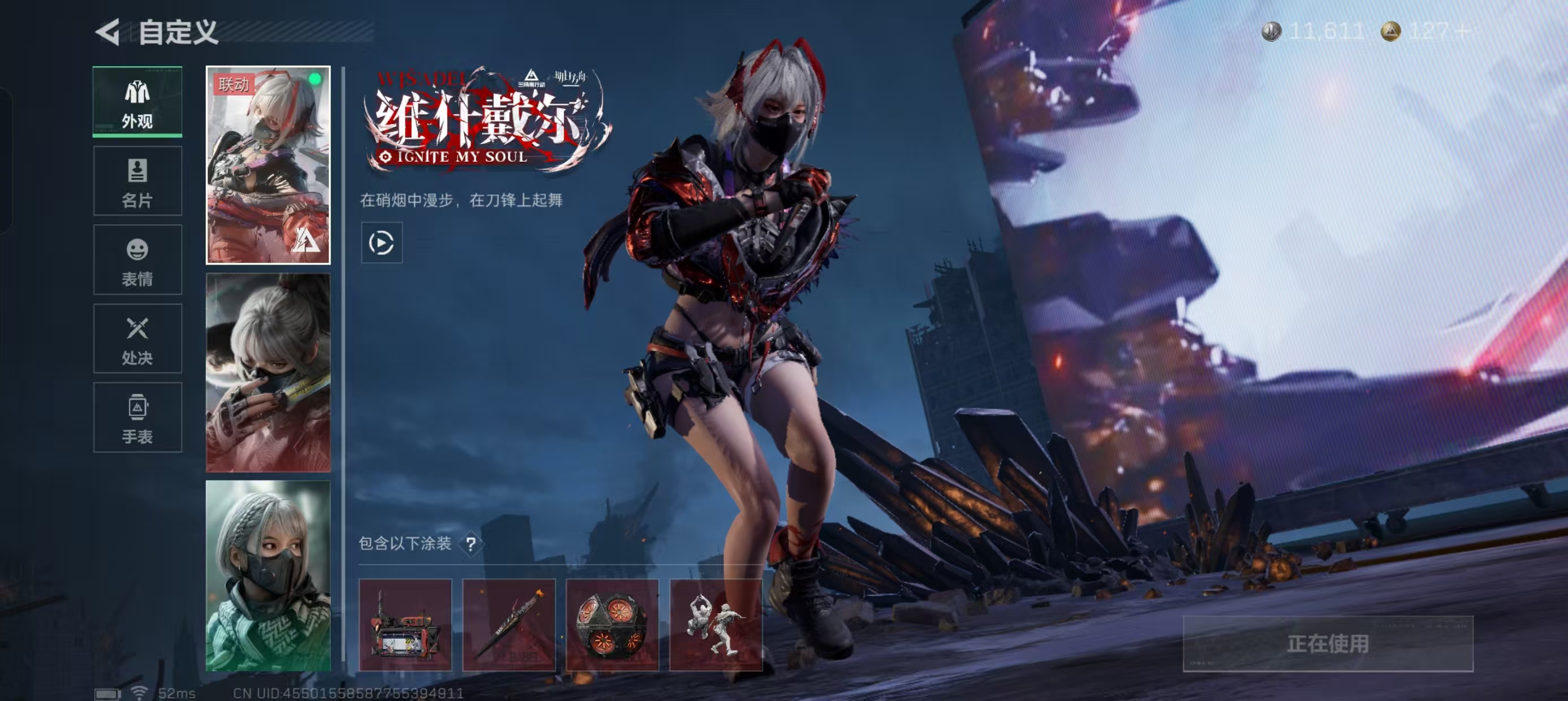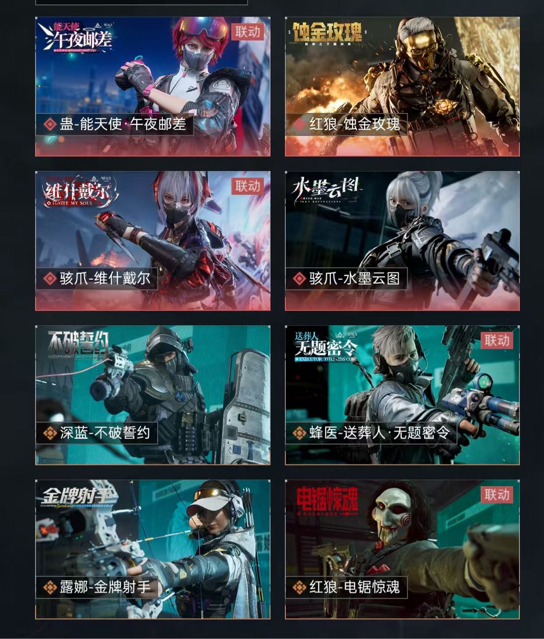 骇爪-维什戴尔 骇爪-水墨云图 露娜-黑·天际线 红狼-蚀金玫瑰 无名-夜鹰 深蓝-不破誓约 露娜-金牌射手 蛊-能天使·午夜邮差 红狼-电锯惊魂 蜂医-送葬人·无题密令