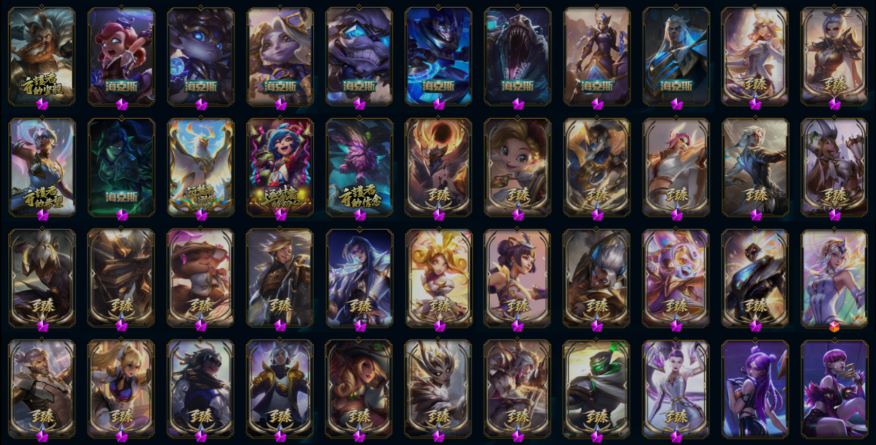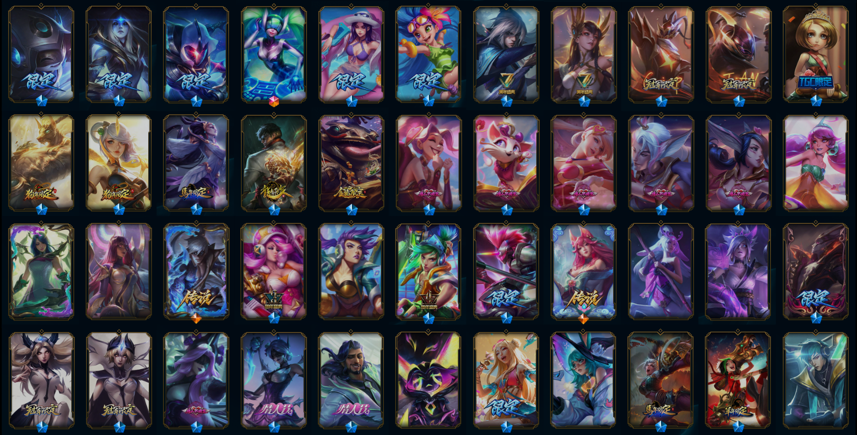 【传说皮肤】影执事劫 神龙尊者夜月幻龙亚索 真实伤害艾克 星之守护者霞 邪鸦魅影乐芙兰 血石领主弗拉基米尔 烈焰雄心崔丝塔娜 偶像歌手阿狸 神王盖伦 星之守护者洛 西部魔影卢锡安 暗星尊烬 奥德赛凯隐 神王德莱厄斯 蔷薇绅士杰斯 霸天异形卡兹克 泳池派对吉格斯 女校长菲奥娜 宇航员诺提勒斯 苍穹之光韦鲁斯 符文战熊沃利贝尔 冰霜亚龙希瓦娜 灵魂莲华阿狸 星之守护者拉克丝 暗星女王拉克丝 黯黑魔龙希瓦娜 焰尾妖狐阿狸 枯萎之壤泽拉斯 黎明使者锐雯 月蚀骑士蕾欧娜 腥红之月鬼武姬阿卡丽 钢铁军团盖伦 死亡骑士盖伦 战斗学院伊泽瑞尔 屠龙勇士潘森 炼狱魔犬内瑟斯 驯龙学者黑默丁格 第三类接触黑默丁格 银河魔装机神兰博 神龙尊者圣龙李青 源计划净化薇恩 神拳李青 丧尸布兰德 地狱行者孙悟空 上古战魂魔腾 冰川巨兽墨菲特 苹果机器人布里茨 太空律动猫猫布里和里茨 陆地王者4WD布里茨 女警狙击凯特琳 最终BOSS维迦 红色男爵库奇 女主播迦娜 冰霜之刃艾瑞莉娅 电玩女神娑娜 黯晶凤凰艾尼维亚 律政大亨蒙多 双重冰晶艾尼维亚 战地巨兽科加斯 绅士科加斯 至尊魔女莫甘娜 鬼魂新娘莫甘娜 恶魔之刃泰达米尔 西部天使艾希 源计划联合艾希 女皇艾希 合金巨兽努努和威朗普 驯龙炮手崔丝塔娜 提莫约德尔人的一大步 欧米伽小队幽灵特工 约德尔国队长提莫 黑夜使者索拉卡 霸天零式赛恩 黎明使者索拉卡 恶魔男爵瑞兹 源计划林易 战场女武神凯尔 钢铁之翼凯尔 大天使长米迦勒凯尔 战地机甲厄加特 魔幻卡牌崔斯特 地狱之门卫士加里奥 铁哥们儿奥拉夫
