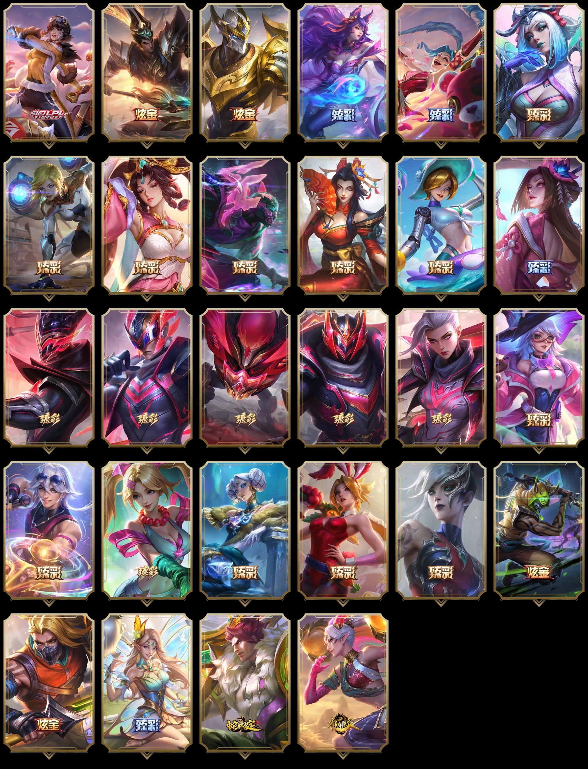 【重要皮肤】机神玄武盖伦至臻 心之钢永恩至臻 青花瓷拉克丝至臻 魅惑女巫莫甘娜至臻 女帝黛安娜至臻 战斗学院蕾欧娜至臻 太空律动璐璐至臻 魔女婕拉至臻 奥术师佐伊至臻 真实伤害亚索至臻 真实伤害赛娜至臻 星之守护者索拉卡至臻 灵魂莲华提莫至臻 灵能特工伊泽瑞尔至臻 福牛守护者菲奥娜至臻 源计划逆流塞拉斯至臻 暗星墨菲特至臻 神龙尊者炎龙瑟提至臻 黑夜使者凯隐至臻 征服者贾克斯至臻 飞升战神潘森至臻 KDA二代卡莎至臻 魅惑女巫厄运小姐至臻 魅惑女巫厄运小姐2022至臻 星之守护者妮蔻至臻 星之守护者妮蔻2022至臻 玉剑传说武剑仙至臻 玉剑传说武剑仙2022至臻 未来战士锤石至臻 未来战士锤石2022至臻 黑夜使者李青至臻 黑夜使者李青2022至臻 海克斯科技安妮 海克斯科技瑟庄妮 海克斯科技雷克顿 海克斯科技斯维因 海克斯科技吉格斯 海克斯科技波比 海克斯科技嘉文四世 海克斯科技阿木木 海克斯科技崔丝塔娜 永恒之森奥恩 光明哨兵奥拉夫 黎明使者卡尔玛 摄魂使者薇恩 胜利之王泰达米尔 胜利巨口克格莫 舞会公主安妮 创星之灵璐璐 钢铁军团拉克丝 暗星卡尔玛 黑夜使者弗拉基米尔 电玩女神厄运小姐 电玩勇者锐雯 电玩女神阿狸 玉剑传说无影 玉剑传说舞剑仙 灵能特工易 点心宝贝阿木木 龙的传人李青 替父从军花木兰 神龙烈焰金克丝 碧玉之牙卡西奥佩娅 春晖神女拉克丝 你看见过我的熊猫吗安妮 北辰之威内瑟斯 南天之怒沃里克 美猴王孙悟空 玉净夜叉凯特琳 紫金罗刹莫甘娜 广寒仙子嫦娥 虎痴之拳蔚 张辽文远 司马懿仲达 金猪烈焰瑟庄妮 纳财大帝塔姆 福牛守护者安妮 福牛守护者阿利斯塔 胜利之树茂凯 胜利机器人布里茨 胜利枪神格雷福斯 胜利枪神卢锡安 胜利之剑亚托克斯 水晶玫瑰阿克尚 幽梦玫瑰伊莉丝 甜心之羽霞 甜心之翎洛 甜心宝贝安妮 甜心宝贝娑娜 觅心游侠卢锡安 觅心魔灵奥莉安娜 觅心女王艾希 觅心萝莉金克丝 觅心猫猫悠米 幽梦玫瑰辛德拉 水晶玫瑰婕拉 双城之战2微光实验室辛吉德 冬境仙灵索拉卡 寒冬精灵璐璐 冬季仙境奥莉安娜 雪球也能爆炸吉格斯 圣诞捣蛋鬼金克丝 圣诞老人布隆 圣诞老人德莱文 冰雪驯鹿波比 冰雪风暴希维尔 持胡萝卜的雪人易 狂心冰王图奇 冰封王子蒙多 冰雪女神辛德拉 魄罗骑士瑟庄妮 夺命美人卡特琳娜 平安夜女神娑娜 圣诞糖果棒厄运小姐 魅惑女巫迦娜 魅惑女巫厄运小姐 魅惑女巫奈德丽 魅惑女巫伊莉丝 死亡誓约卡特琳娜 灵魂收割者索拉卡 克烈古拉伯爵 南瓜头王子阿木木 海之歌萨勒芬妮 泳池派对凯特琳 泳池派对佐伊 泳池派对奥莉安娜 泳池派对厄运小姐 泳池派对塔里克 泳池派对菲奥娜 泳池派对格雷福斯 泳池派对蕾欧娜 泳池派对雷克顿 电玩战魂赫卡里姆 斩星魔剑易 御星魔矢艾希 送披萨的小姐姐希维尔 鸡里奥 克格汪 制胜金靴李青 制胜金球拉莫斯 DWG奈德丽 FPX锤石 FPX薇恩 FPX李青 FPX普朗克 FPX墨菲特 iG艾瑞莉娅 iG乐芙兰 SSG洛 SSG嘉文四世 SSG伊泽瑞尔 SKTT1扎克 SKTT1烬 SKTT1辛德拉 SKTT1艾克 SKTT1奥拉夫 SKTT1阿利斯塔 SKTT1卡莉丝塔 SKTT1瑞兹 SKTT1阿兹尔 SKTT1伊莉丝 SKTT1雷克顿 SSW锤石 SSW泰隆 SSW图奇 SSW辛吉德 SKTT1劫 SKTT1婕拉 SKTT1李青 SKTT1薇恩 暗杀星奥莉安娜 暗杀星蒙多 暗杀星努努和威朗普 暗杀星慎 Fnatic迦娜 Fnatic库奇 Fnatic古拉加斯 Fnatic嘉文四世 Fnatic卡尔萨斯 冰雪节格雷福斯 冰雪节玛尔扎哈 冰雪节辛吉德 冰雪兽纳尔 防暴士兵格雷福斯 防暴士兵辛吉德 防暴天使凯尔 钢铁之翼艾尼维亚 冠军典狱长锤石 冠军掠夺者卡兹克 冠军蔷薇乐芙兰 冠军之矛卡莉丝塔 冠军之刃锐雯2016 冠军之隐劫 冠军之志瑞兹 春晖神女奇亚娜 鬼影森森茂凯 鬼影重重魔腾 海贼瑞兹 红桃杰克崔斯特 胡桃夹子萨科 惊悚派对费德提克 警用试作体K9内瑟斯 蓝色忧郁崔斯特 魅惑女巫悠米 密林猎手提莫 南瓜头费德提克 女猎手希维尔 破空枪骑孙悟空 圣诞精灵崔丝塔娜 圣诞开心鬼提莫 圣诞狂欢基兰 圣诞狂欢努努和威朗普 圣诞老人古拉加斯 圣诞玩偶波比 圣诞驯鹿克格莫 糖果使徒费德提克 外星装甲库奇 无头骑士赫卡里姆 喜庆之树茂凯 邪恶圣诞老人维迦 幸福女神乐芙兰 雪默丁格 雪装奈德丽 野兽猎人德莱文 野兽猎人瑟庄妮 野兽猎人泰达米尔 永恒之森乐芙兰 勇者阿狸 征服者卡尔玛 征服者诺提勒斯 征服者韦鲁斯 暗影沃里克 冠军之箭艾希 诺斯费拉图弗拉基米尔 阿木木主人不要我了 波比的巧克力工坊 都铎王朝图奇 十周年纪念安妮 神凰行者瑞羽圣凰艾尼维亚 胜利凤凰艾尼维亚 暗裔英雄盖伦 DJ娑娜 大元素使拉克丝 灵魂守卫乌迪尔 武装战姬厄运小姐
