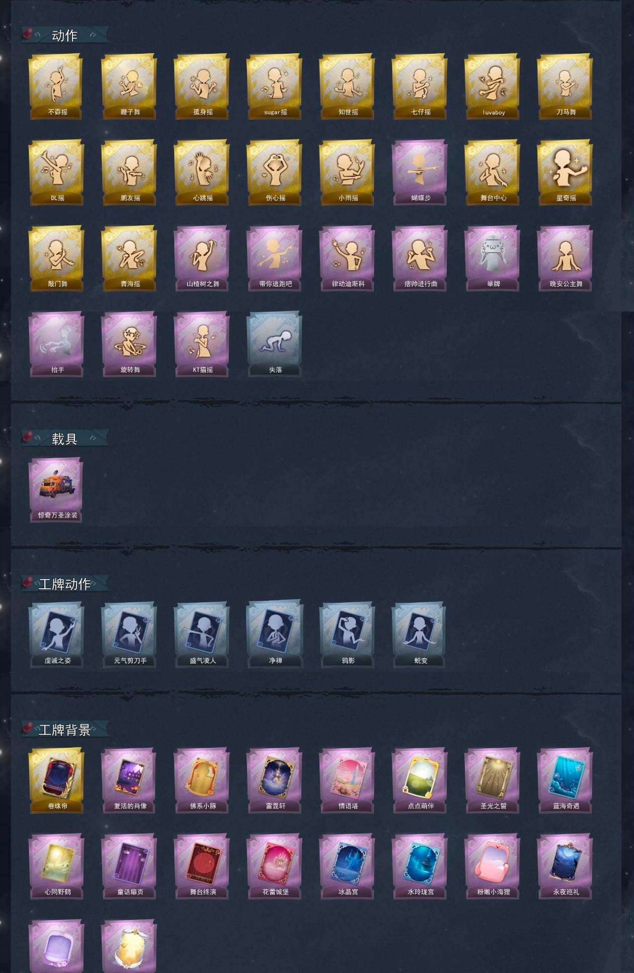 【动作】不孬摇、鞭子舞、孤身摇、sugar摇、知世摇、七仔摇、luvaboy、刀马舞、DL摇、鹏友摇、心跳摇、伤心摇、小雨摇、蝴蝶步、舞台中心、星奇摇、敲门舞、青海摇、山楂树之舞、带你逃跑吧、律动迪斯科、痞帅进行曲、举牌、晚安公主舞、抬手、旋转舞、KT猫摇、失落