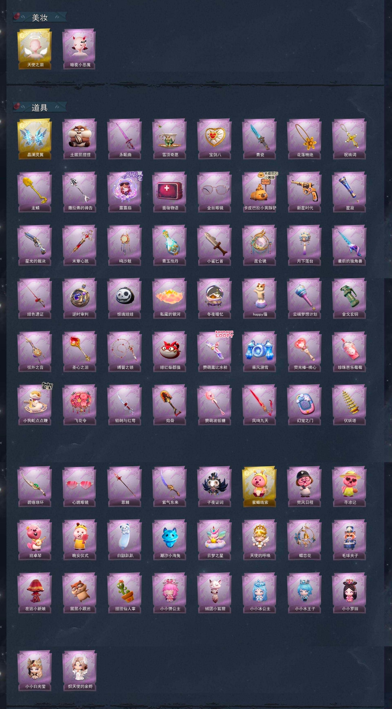 【道具皮肤】喷气背包-晶澜灵翼、急救包-土拨鼠捏捏、桃木剑-永眠曲、黄牛能量饮料-雪顶奇愿、腰包-宝剑八、刺刀-青瓷、摸金符-花落精绝、摸金符-祝祷词、铲子-龙鳞、铲子-撒拉弗的祷告、折扇-露露扇、急救包-蔷薇物语、夜视仪-金丝眼镜、铲子-卡皮巴拉小黄豚铲、转轮手枪-新星时代、专业手电-星寂、短管猎枪-星光的裁决、急救包-末章心跳、音响-鸣沙鼓、黄牛能量饮料-青玉抱丹、刺刀-小鲨匕首、传送按钮-昆仑镜、腰包-月下莲台、桃木剑-最后的独角兽、桃木剑-绯色遗证、传送按钮-逆时审判、腰包-惊魂娃娃、腰包-私藏的银河、音响-冬夜暖忆、音响-happy猫、专业手电-云端梦想计划、闪光弹-金戈玄铜、除颤仪-弦外之音、铲子-圣心之泪、长鞭-缚誓之锁、腰包-绯红柴郡猫、短管猎枪-赞萌露比水枪、喷气背包-乘风溯雪、黄牛能量饮料-珍珠芭乐莓莓、长鞭-小狗蛇点点鞭、额外的背包-飞花令、刺刀-铂刺与红萼、铲子-焰骨、铲子-赞萌波板糖、桃木剑-凤鸣九天、传送按钮-幻宠之门、葫芦-伏妖塔、刺刀-碧络琅环、夜视仪-心跳眼镜、刺刀-紫气东来、背饰-子夜证词、背饰-蜜蜂线索、背饰-兜风日程、背饰-寻凉记、背饰-班卓琴、背饰-晚安仪式、背饰-白鼬趴趴、背饰-潮汐小海兔、背饰-云梦之星、背饰-天使的呼唤、背饰-蝶恋花、背饰-毛球夹子、背饰-在逃小新娘、背饰-鼠鼠小跟班、背饰-炽天使的余烬