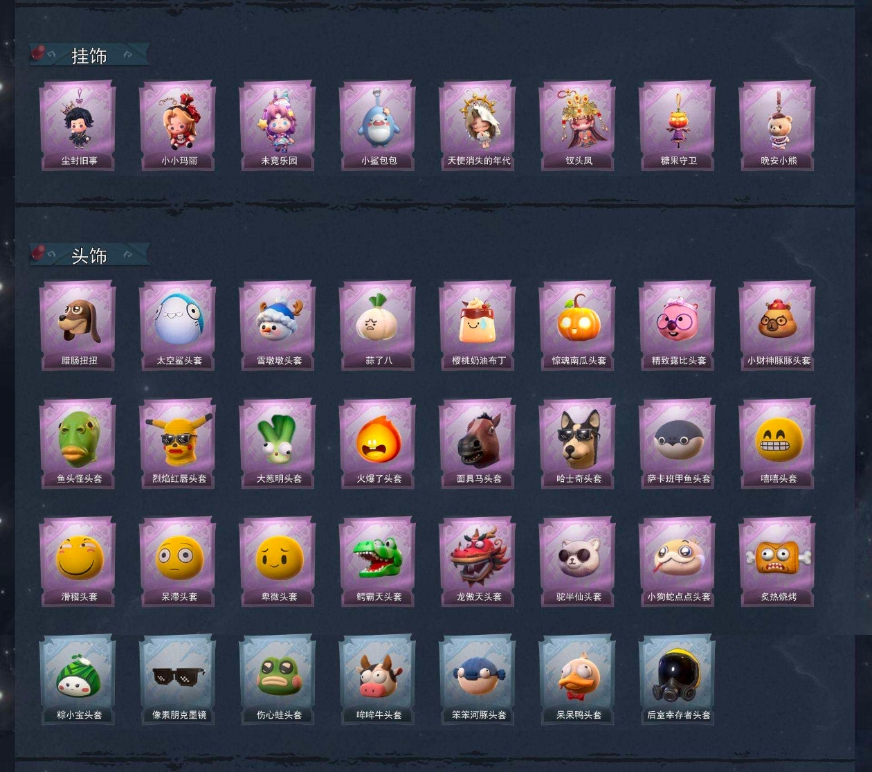 【头饰】腊肠扭扭、太空鲨头套、雪墩墩头套、蒜了八、樱桃奶油布丁、惊魂南瓜头套、精致露比头套、小财神豚豚头套、鱼头怪头套、烈焰红唇头套、大葱明头套、火爆了头套、面具马头套、哈士奇头套、萨卡班甲鱼头套、嘻嘻头套、滑稽头套、呆滞头套、卑微头套、鳄霸天头套、龙傲天头套、驼半仙头套、小狗蛇点点头套、炙热烧烤、粽小宝头套、像素朋克墨镜、伤心蛙头套、哞哞牛头套、笨笨河豚头套、呆呆鸭头套、后室幸存者头套