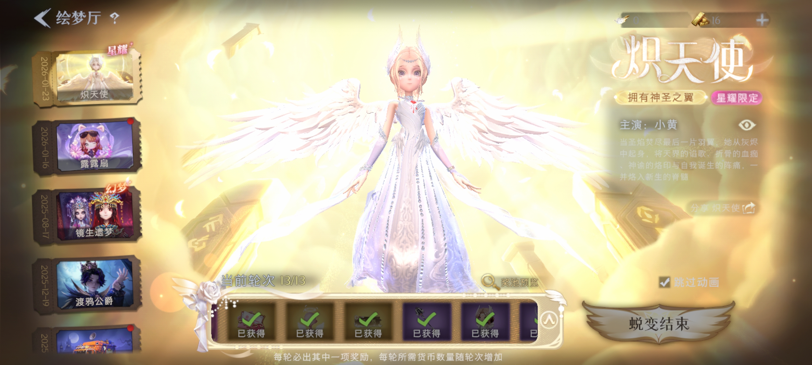【金色皮肤】小黄-炽天使、零-渡鸦公爵、逍遥-莲华渡、薇薇安-圣光之谕、爱丽丝-血色中的玛丽、小黄-遗失的童话、巫铃儿-镜花辞
