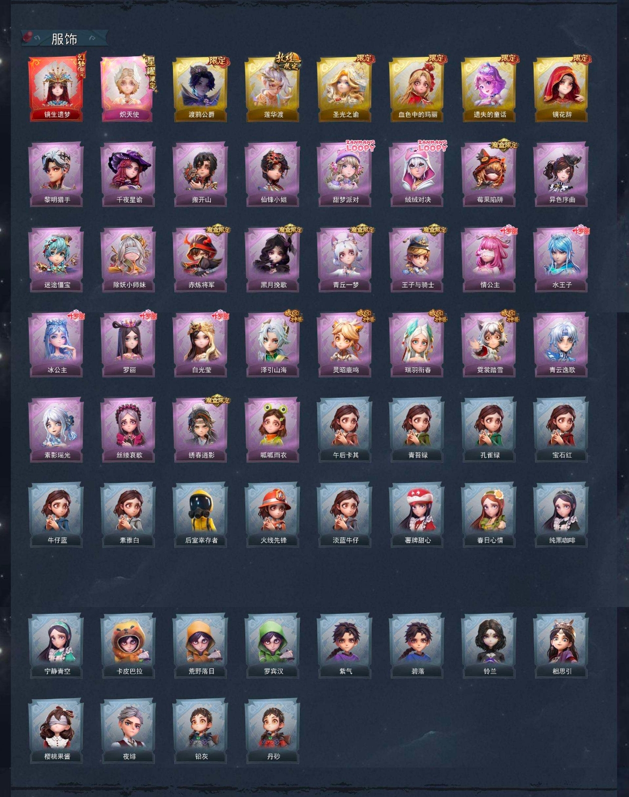 【紫色皮肤】艾伦-黎明猎手、兰-千夜星谕、零-搬开山、薇薇安-仙锋小姐、爱丽丝-甜梦派对、艾伦-绒绒对决、莉莉-莓果陷阱、小黄-异色序曲、阿念-迷途僵宝、莉莉-除妖小师妹、零-赤炼将军、薇薇安-黑月挽歌、小黄-青丘一梦、阿念-王子与骑士、莉莉-情公主、艾伦-水王子、爱丽丝-冰公主、小黄-罗丽、薇薇安-白光莹、逍遥-泽引山海、阿念-灵昭鹿鸣、爱丽丝-瑞羽衔春、小黄-霓裳踏雪、零-青云逸歌、巫铃儿-素影瑶光、爱丽丝-丝缕哀歌、逍遥-绣春逍影、小黄-呱呱雨衣