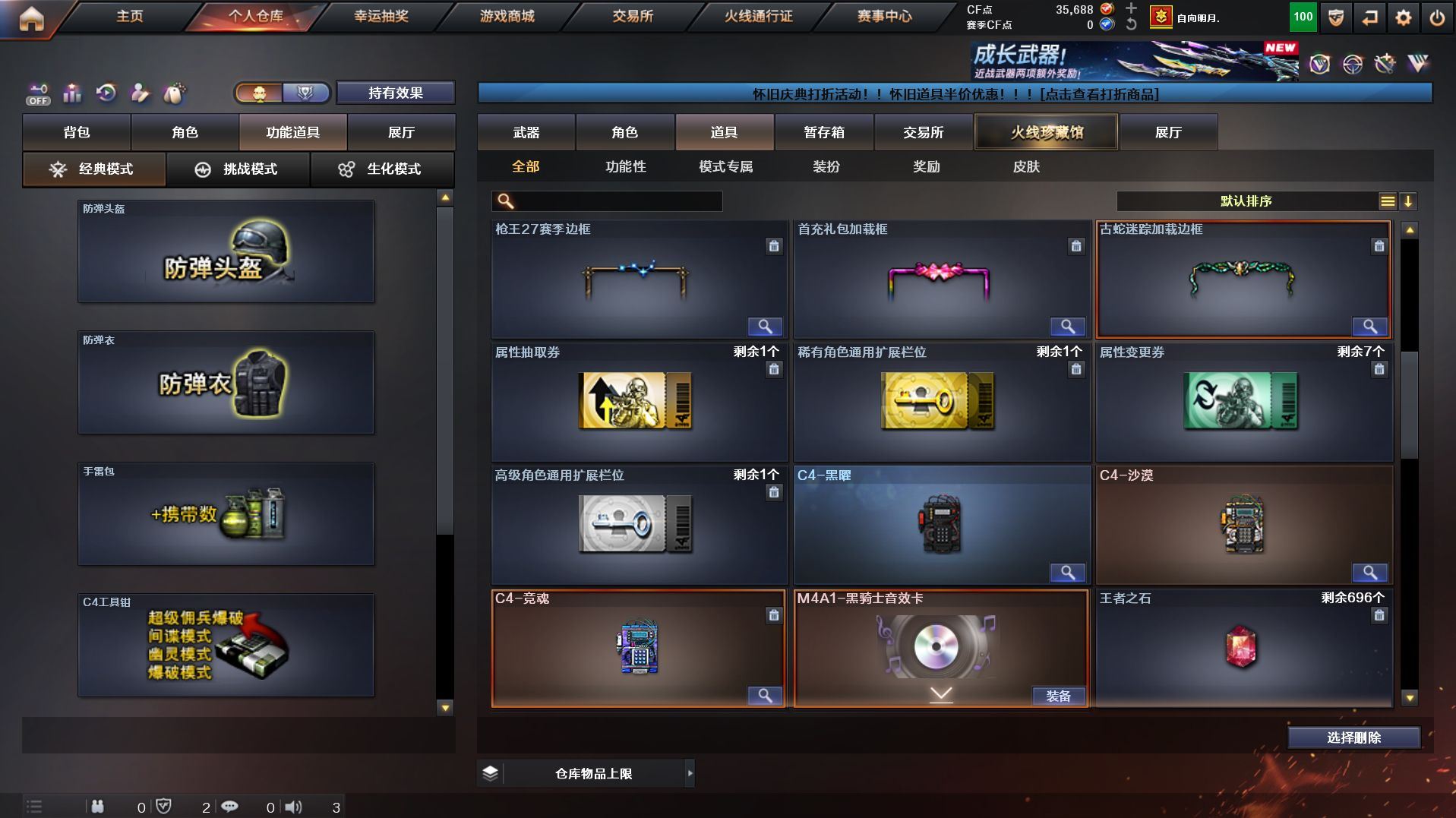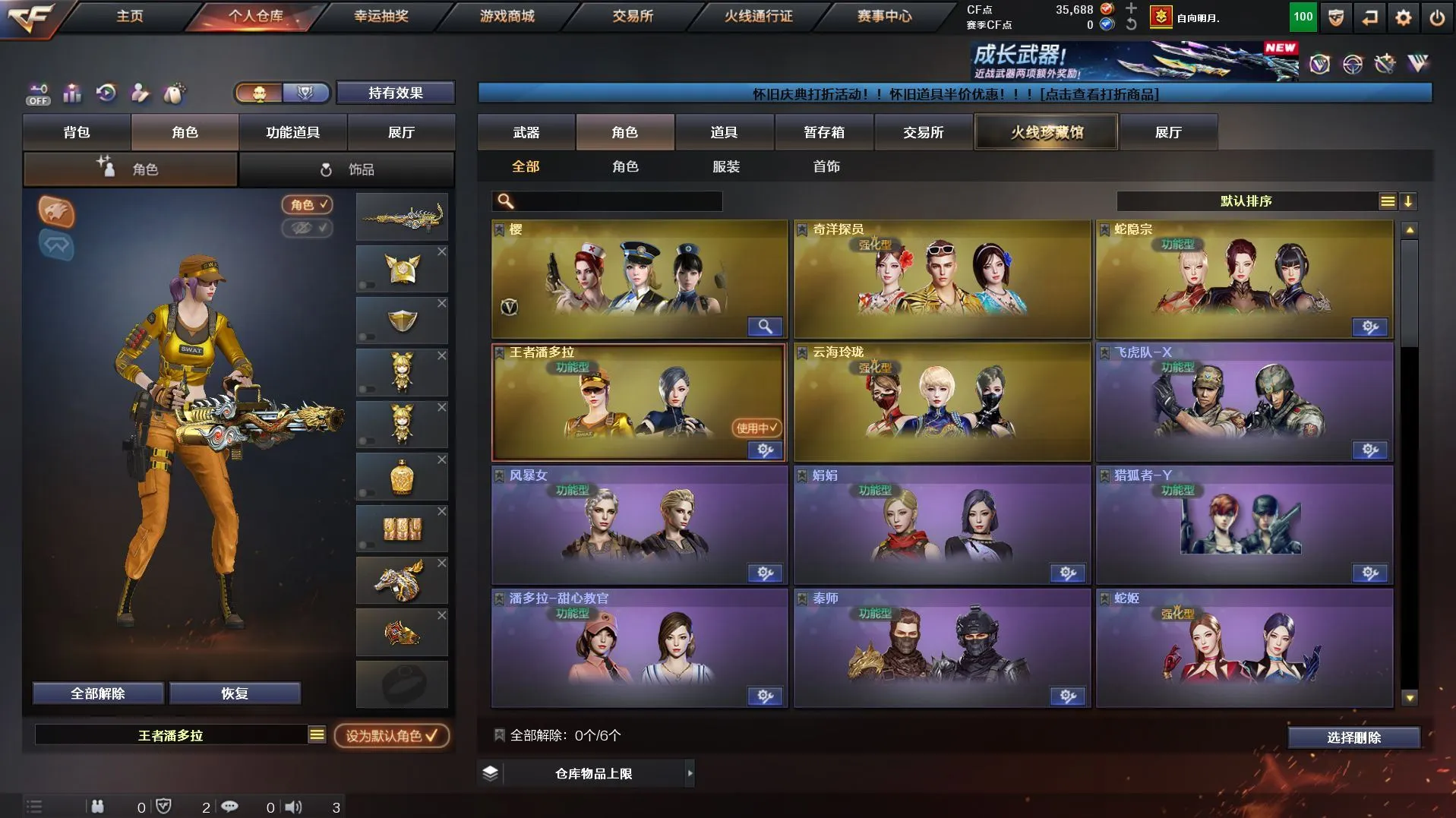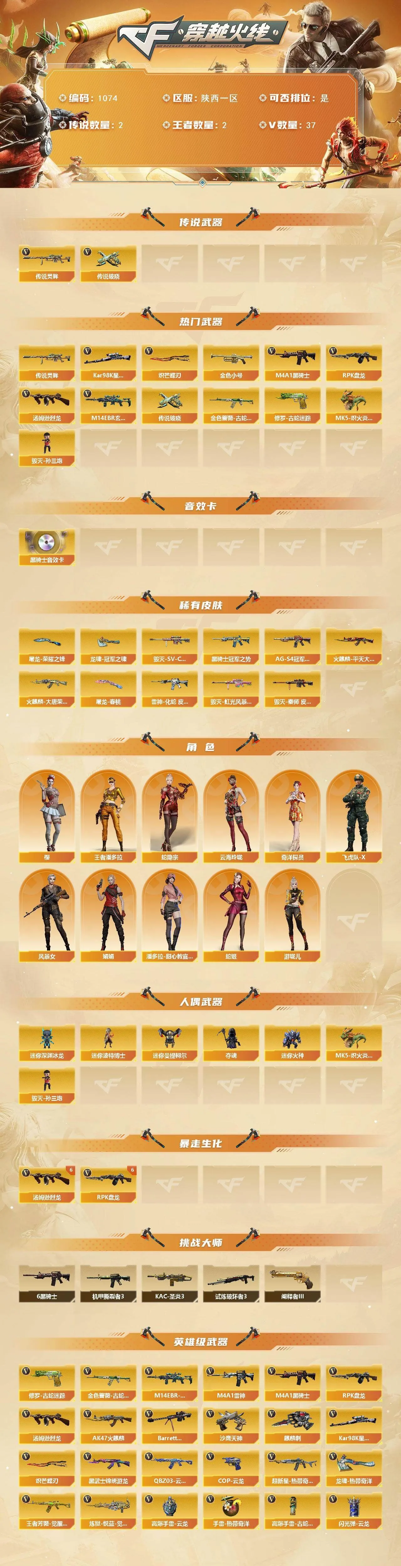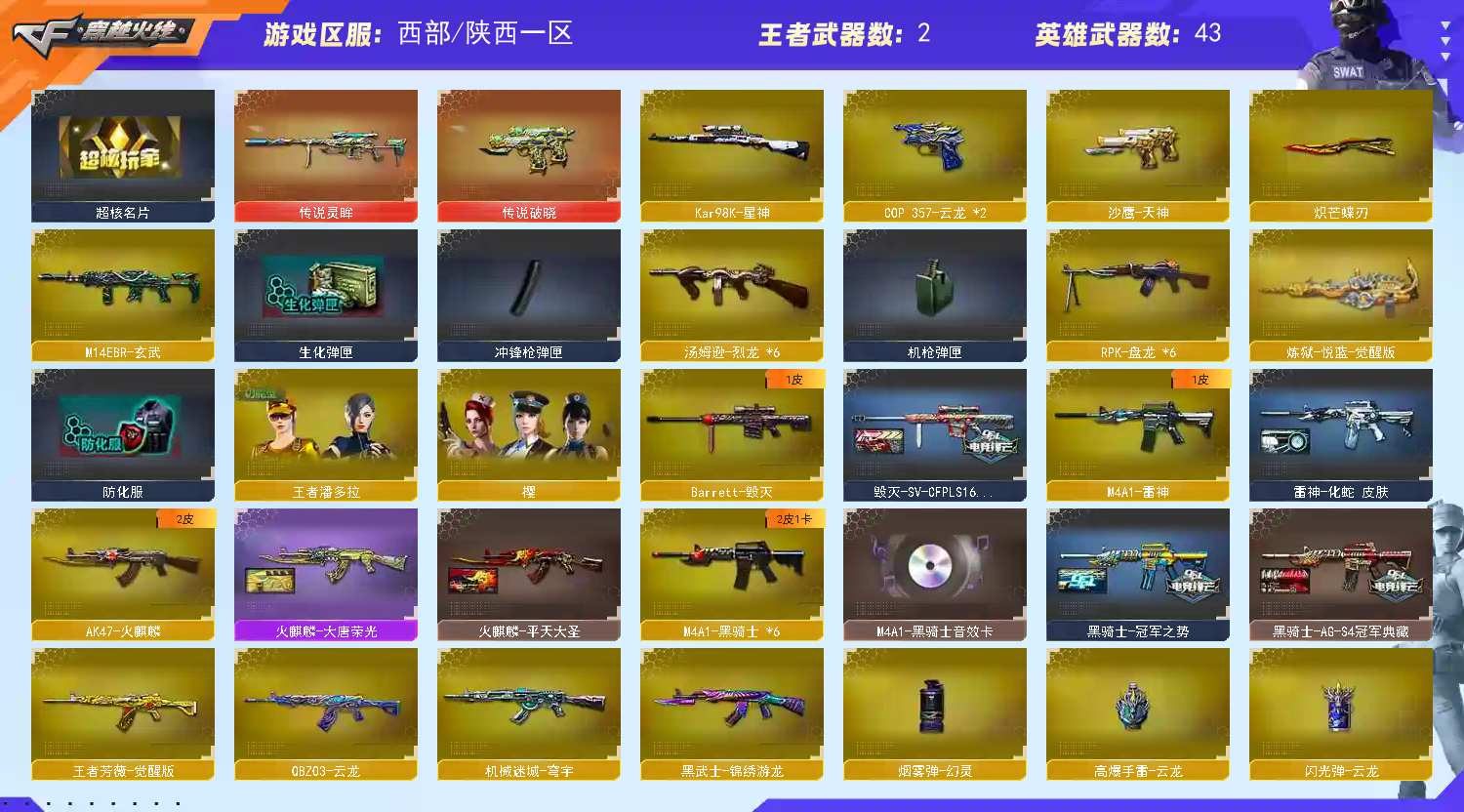 【传说武器】:传说灵眸,传说破晓【热门武器】:传说灵眸,传说破晓,M14EBR-玄武,金色蔷薇-古蛇迷踪,修罗-古蛇迷踪,Kar98K-星神,金色小号,M4A1-黑骑士*6,汤姆逊-烈龙*6,RPK-盘龙*6,MK5-炽火炎龙,毁灭-孙三炮,炽芒蝶刃【音效卡】:M4A1-黑骑士音效卡【皮肤】:雷神-化蛇 皮肤,火麒麟-平天大圣,火麒麟-大唐荣光,毁灭-SV-CFPLS16冠军,毁灭-虹光风暴 皮肤,毁灭-秦师 皮肤,黑骑士-冠军之势,黑骑士-AG-S4冠军典藏,屠龙-荣耀之锋,屠龙-春桃 皮肤,龙啸-冠军之啸【角色】:樱,王者潘多拉,蛇隐宗,奇洋探员,云海玲珑,飞虎队-X,风暴女,娟娟,潘多拉-甜心教官,蛇姬,游珑儿【人偶武器】:毁灭-孙三炮,MK5-炽火炎龙,迷你深渊冰龙,迷你波特博士,迷你曼提柯尔,夺魂,迷你火种【挑战大师】:机甲撕裂者III,试炼破坏者III,KAC-圣炎切割者III,阐释者III【英雄级武器】:AK47-火麒麟,M4A1-雷神,M4A1-黑骑士*6,M14EBR-玄武,QBZ03-云龙,黑武士-锦绣游龙,超新星-热带奇洋,金色蔷薇-古蛇迷踪,王者芳薇-觉醒版,Barrett-毁灭,Kar98K-星神,RPK-盘龙*6,炼狱-悦蓝-觉醒版,汤姆逊-烈龙*6,沙鹰-天神,COP 357-云龙*2,修罗-古蛇迷踪,麒麟刺,炽芒蝶刃,龙啸-热带奇洋,高爆手雷-云龙,手雷-热带奇洋,高爆手雷-古蛇迷踪,闪光弹-云龙,烟雾弹-幻灵,烟雾弹-云龙,烟雾弹-古蛇迷踪【道具】:BS战队炫彩背包,古蛇迷踪炫彩背包,奇洋探员-海龟背包,热带奇洋炫彩背包,臻选金狐背包,超级背包,黄金曼提柯尔的背包,超核名片,绿色巨人,变异宝贝,生化弹匣,夺命之镰,防化服,金色流光-枪王排位,星辰流光-枪王排位,枪王排位28赛季金色流光,枪王排位29赛季金色流光,古蛇迷踪特效,蛇隐宗表情,热带奇洋表情,斯沃特表情,C4-黑曜,C4-沙漠,防弹头盔,防弹衣,C4工具钳,手雷包【特殊枪械】:6黑骑士,6烈龙,6盘龙