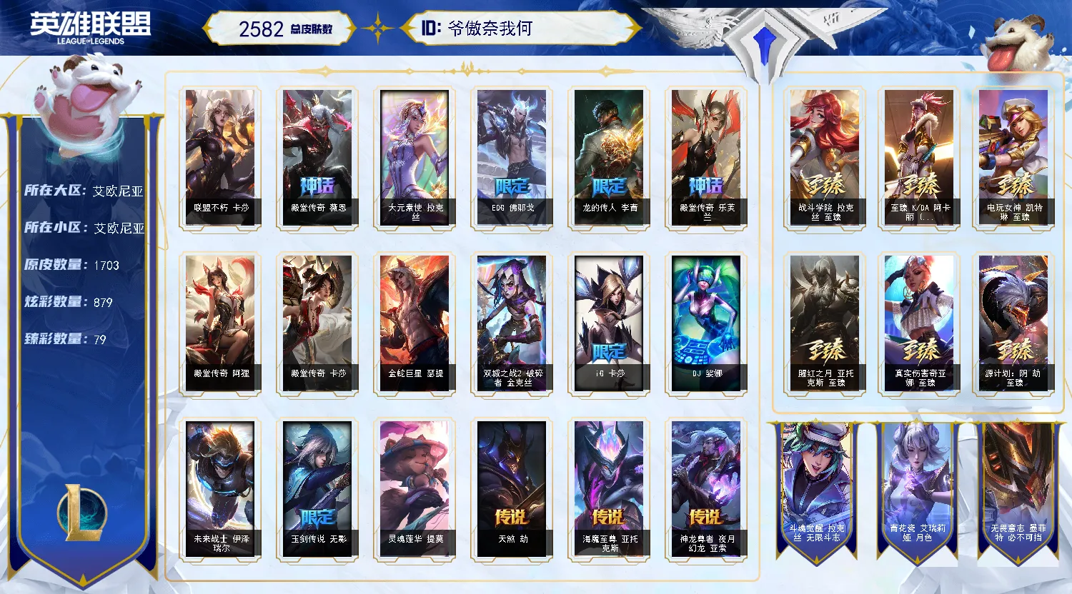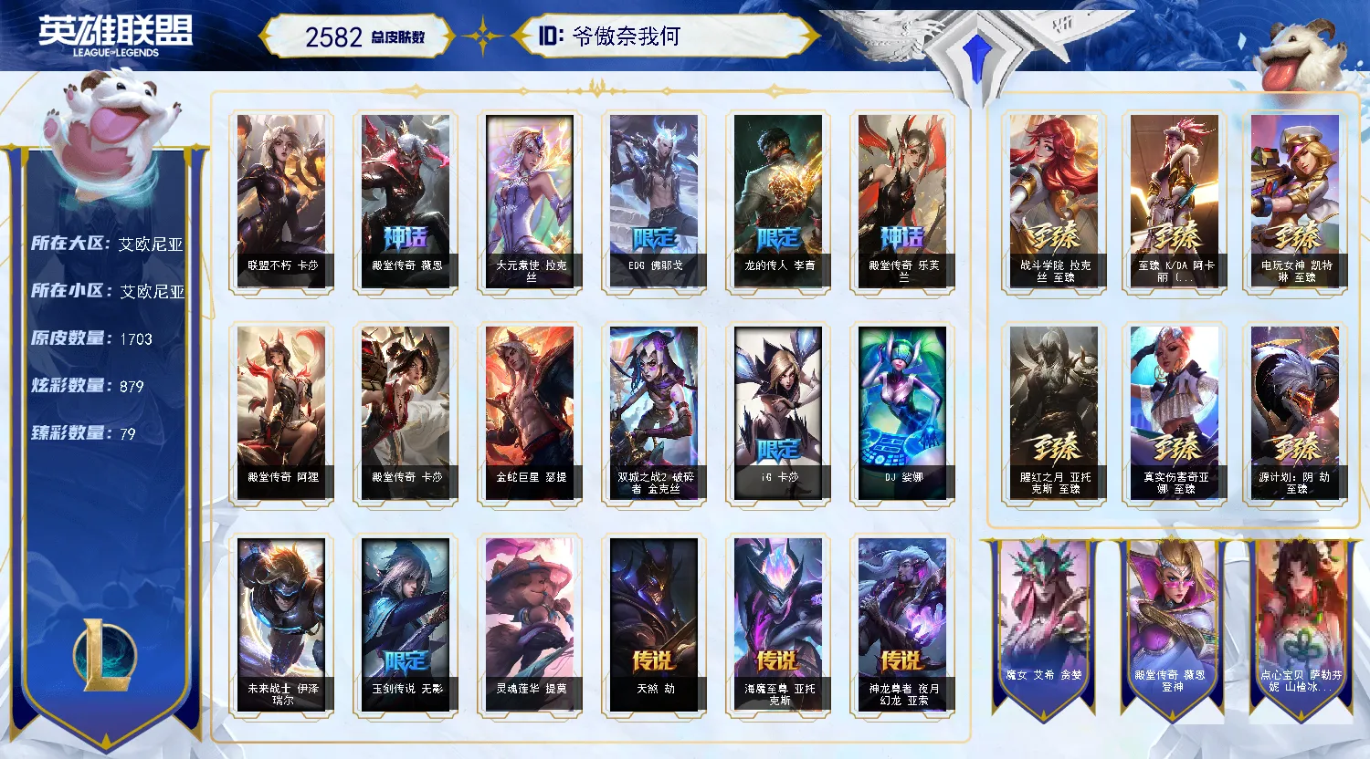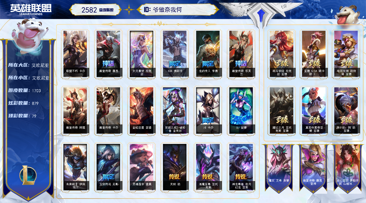 艾欧尼亚原皮1700/️全英雄可下棋可排位/不朽卡莎名人堂阿狸/2圣堂/9终极️/144神话至臻/