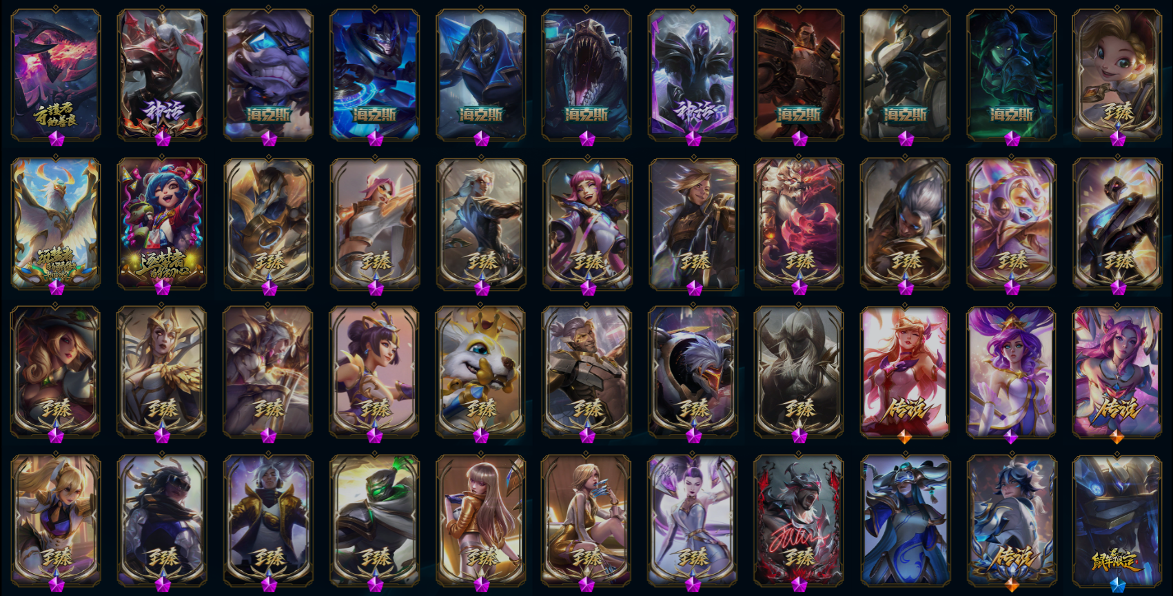 【传说皮肤】黎明使者索拉卡 邪鸦魅影乐芙兰 驯龙学者黑默丁格 太空律动猫猫布里和里茨 星之守护者卡莎 灵魂莲华阿狸 灵魂莲华瑟提 幻灵战斗队长厄运小姐 源计划泯灭雷克顿 光明哨兵格雷福斯 源计划超体莫德凯撒 黎明使者永恩 星之守护者阿卡丽 星之守护者霞 灵魂莲华锤石 真实伤害艾克 天煞劫 西部魔影卢锡安 西部天使赛娜 星之守护者金克丝 暗星尊烬 神龙尊者夜月幻龙亚索 黑夜使者亚索 神龙尊者昼日真龙亚索 奥德赛凯隐 灌篮高手德莱厄斯 霸天异形卡兹克 神王德莱厄斯 女校长菲奥娜 泳池派对吉格斯 宇航员诺提勒斯 苍穹之光韦鲁斯 符文战熊沃利贝尔 枯萎之壤泽拉斯 焰尾妖狐阿狸 星之守护者阿狸 黯黑魔龙希瓦娜 黎明使者锐雯 日蚀骑士蕾欧娜 钢铁军团盖伦 屠龙勇士潘森 青花瓷伊泽瑞尔 战斗学院伊泽瑞尔 炼狱魔犬内瑟斯 神拳李青 第三类接触黑默丁格 银河魔装机神兰博 丧尸布兰德 源计划净化薇恩 光明哨兵薇恩 神龙尊者圣龙李青 上古战魂魔腾 女帝卡特琳娜 陆地王者4WD布里茨 战斗学院凯特琳 女警狙击凯特琳 冰川巨兽墨菲特 未来战士凯特琳 最终BOSS维迦 红色男爵库奇 电玩女神娑娜 女主播迦娜 律政大亨蒙多 冰霜之刃艾瑞莉娅 双重冰晶艾尼维亚 黯晶凤凰艾尼维亚 战地巨兽科加斯 绅士科加斯 至尊魔女莫甘娜 恶魔之刃泰达米尔 西部天使艾希 女皇艾希 鬼魂新娘莫甘娜 源计划联合艾希 合金巨兽努努和威朗普 驯龙炮手崔丝塔娜 欧米伽小队幽灵特工 约德尔国队长提莫 霸天零式赛恩 烈焰雄心崔丝塔娜 提莫约德尔人的一大步 源计划林易 大天使长米迦勒凯尔 钢铁之翼凯尔 战场女武神凯尔 血石领主弗拉基米尔 战地机甲厄加特 地狱之门卫士加里奥 铁哥们儿奥拉夫