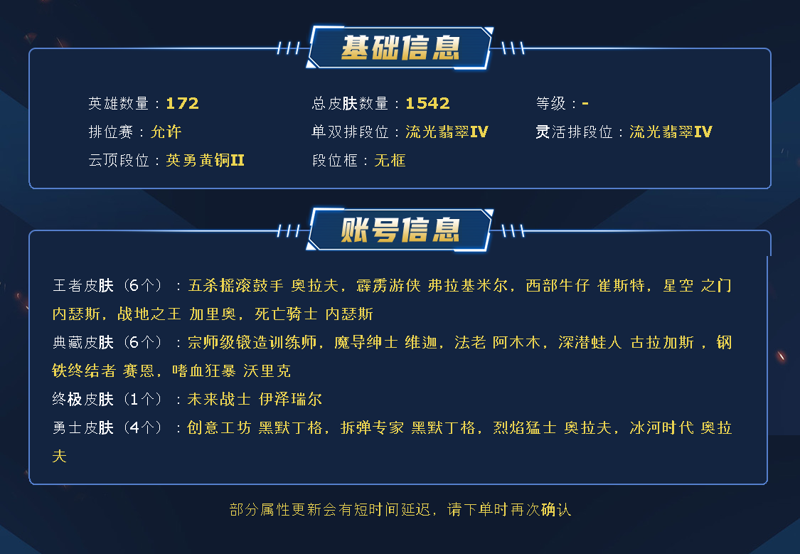 ~~喜欢记得收藏~~可排位~~1600皮全英雄~~租之前尽量查一下游戏ID,确保段位是您需要的,避免浪费您的时间~~请勿挂机逃跑故意送人头,谢谢合作,谢谢~~