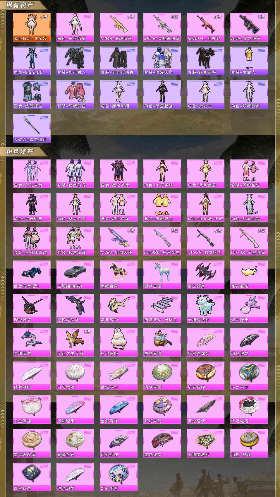 【稀有资产】暮色玫影-艾丽娅[2级]/角色-千金淑猫/M416-暖熊萌萌/M416-灵猫魔法师/SCAR-L-万古烈焰/AUG-星之彼岸/角色-Mark.06/套装-都市猎人/套装-奇异狩猎者/套装-浪漫天命/套装-暗影哥特/套装-龟仙人/套装-迅捷狂鲨/套装-浪漫假日/角色-都市丽猫/角色-摩登魅猫/角色-灵公主/角色-鲛海歌灵/大砍刀-青龙偃月刀
