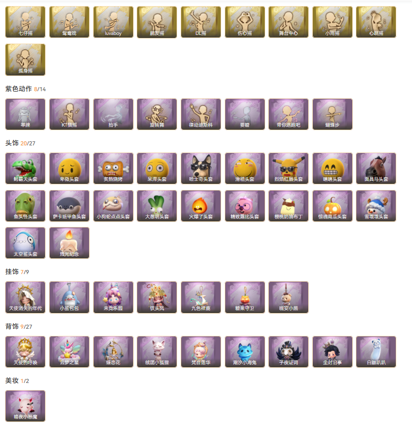 皮肤:巫铃儿-镜生遗梦,薇薇安-圣光之谕,零-渡鸦公爵,小黄-遗失的童话,逍遥-莲华渡,巫铃儿-镜花辞,薇薇安-白光莹,阿念-王子与骑士,爱丽丝-丝缕哀歌,小黄-罗丽,爱丽丝-甜梦派对,爱丽丝-耀眼的你,阿念-迷途僵宝,小黄-呱呱雨衣,爱丽丝-冰公主,零-青云逸歌,莉莉-除妖小师妹,逍遥-绣春逍影,莉莉-莓果陷阱,艾伦-黎明猎手,莉莉-情公主;道具:喷气背包-晶澜灵翼,腰包-月下莲台,铲子-圣心之泪,长枪-罪棘,桃木剑-绯色遗证,腰包-宝剑八,长鞭-缚誓之锁,葫芦-伏妖塔,腰包-私藏的银河,闪光弹-金戈玄铜,传送按钮-昆仑镜,音响-happy猫,音响-冬夜暖忆,短管猎枪-星光的裁决,短管猎枪-赞萌露比水枪,桃木剑-凤鸣九天,转轮手枪-新星时代,摸金符-紫霄,铲子-龙鳞,急救包-末章心跳,摸金符-祝祷词,折扇-露露扇,喷气背包-乘风溯雪,黄牛能量饮料-珍珠芭乐莓莓,音响-鸣沙鼓,专业手电-星寂,长鞭-飞天绫,夜视仪-金丝眼镜,传送按钮-逆时审判,专业手电-云端梦想计划,桃木剑-最后的独角兽,刺刀-碧络琅环,刺刀-铂刺与红萼,黄牛能量饮料-青玉抱丹,传送按钮-幻宠之门,额外的背包-飞花令,电击枪-甜蜜泡泡枪,急救包-蔷薇物语;美妆:美妆-暗夜小恶魔;饰品:头饰-樱桃奶油布丁,头饰-呆滞头套,头饰-鳄霸天头套,头饰-大葱明头套,头饰-滑稽头套,头饰-炙热烧烤,头饰-惊魂南瓜头套,头饰-面具马头套,头饰-嘻嘻头套,头饰-烛光纪念,头饰-小狗蛇点点头套,头饰-雪墩墩头套,头饰-鱼头怪头套,头饰-哈士奇头套,头饰-萨卡班甲鱼头套,头饰-烈焰红唇头套,头饰-太空鲨头套,头饰-蒜了八,头饰-精致露比头套,头饰-火爆了头套,头饰-卑微头套,头饰-像素朋克墨镜,头饰-后室幸存者头套,挂饰-尘封旧事,挂饰-钗头凤,挂饰-晚安小熊,挂饰-小鲨包包,挂饰-未竟乐园,挂饰-九色祥鹿,挂饰-天使消失的年代,挂饰-糖果守卫,背饰-蝶恋花,背饰-白鼬趴趴,背饰-云梦之星,背饰-子夜证词,背饰-绒团小狐狸,背饰-梵音莲华,背饰-天使的呼唤,背饰-潮汐小海兔;动作:动作-DL摇,动作-七仔摇,动作-伤心摇,动作-舞台中心,动作-鸳鸯戏,动作-小雨摇,动作-孤身摇,动作-KT猫摇,动作-心跳摇,动作-鹏友摇,动作-luvaboy,动作-蝴蝶步,动作-律动迪斯科,动作-旋转舞,动作-举牌,动作-要糖,动作-抬手,动作-带你逃跑吧;工牌背景:工牌背景-卷珠帘,工牌背景-水玲珑宫,工牌背景-复活的肖像,工牌背景-点点萌伴,工牌背景-花蕾城堡,工牌背景-粉嫩小海狸,工牌背景-情语塔,工牌背景-永恒之阶,工牌背景-永夜巡礼,工牌背景-心同野鹤,工牌背景-圣光之誓,工牌背景-冰晶宫,工牌背景-鸢尾花,工牌背景-童话扉页;工牌动作:工牌动作-虔诚之姿,工牌动作-鸦影,工牌动作-元气剪刀手,工牌动作-净禅;员工:莉莉,零,艾伦,巫铃儿,逍遥,阿念,薇薇安,爱丽丝,小黄,兰,小满,爱德华