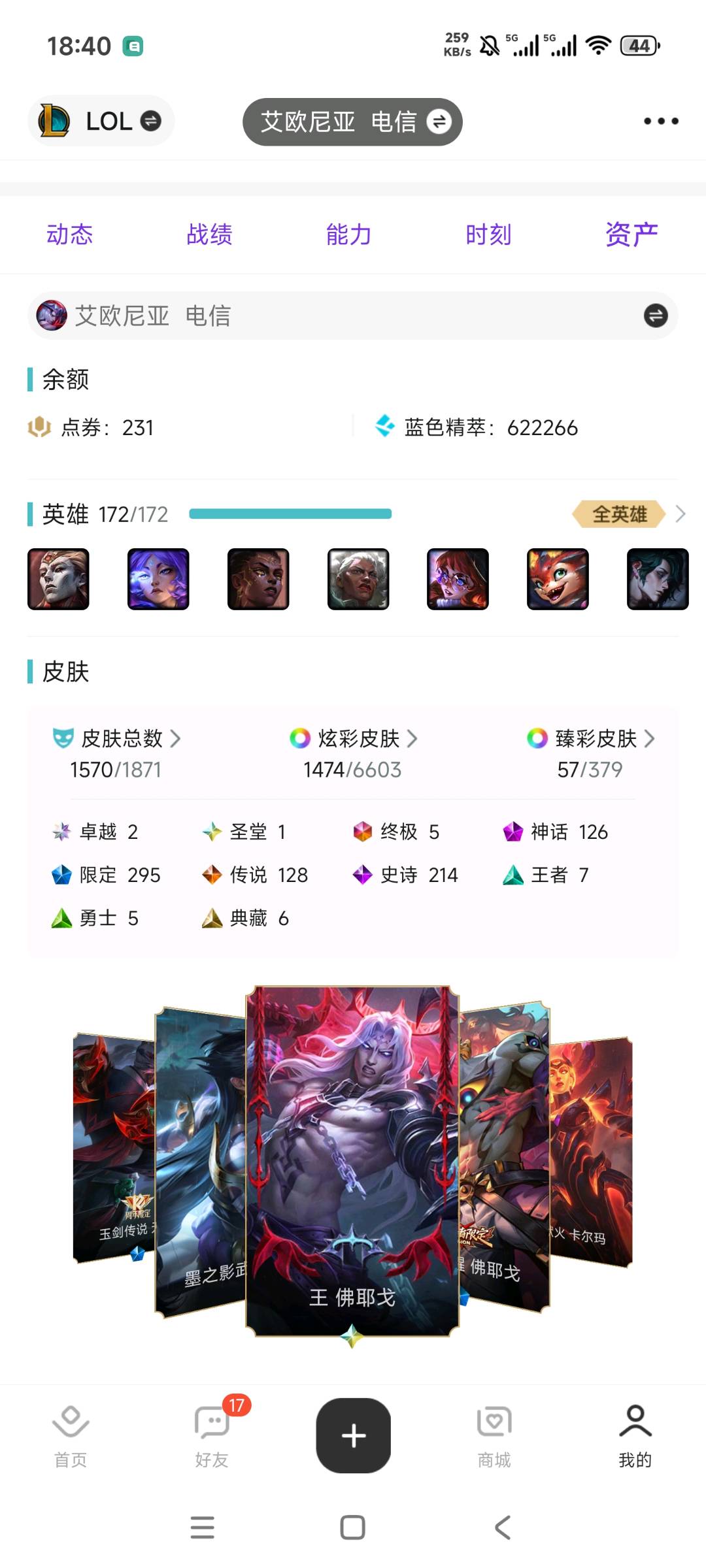 艾欧尼亚丨所有英雄都有皮肤丨3000皮丨126神话丨王佛耶戈丨龙虾炫彩丨60臻彩丨可排位打字