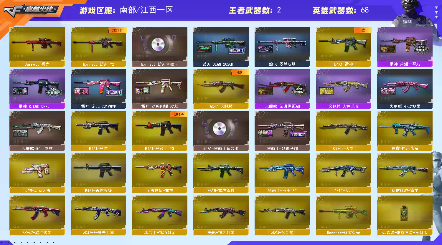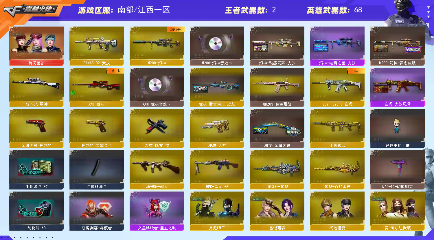 【亮点解析 传说角色 幻神三件套 裁决三件套 生化高配 】【传说星骇 】【m200幻神+音效卡+动感闪耀皮肤+黄忠+电竞之星 】【98k星神】【6盘龙 炼狱 烈龙 斯太尔幻面灵狐】【scar白虎+大汉风骨】【qbz金色蔷薇】【qbz天罚】【火麒麟+荣耀世冠】【黑龙】【雷神+宠儿+荣耀世冠】【黑骑士+卡】【毁灭+卡+bean】【极光】【裁决+卡+胜者为王 】【武器:天戎 朱雀 白虎电玩 海王 荣耀世冠雷神 王者玄武 】【7手枪:修罗*3 天神*2 柯尔特百战金芒 荣耀世冠柯尔特】【7刀具:屠龙 龙啸 擎天 屠龙 龙啸 麒麟刺 】【雷套:幻灵雷】【小人枪:朱雀蛇隐宗 cop白鲨 】【音效卡:裁决音效卡 黑骑士音效卡 幻神音效卡 毁灭音效卡 】