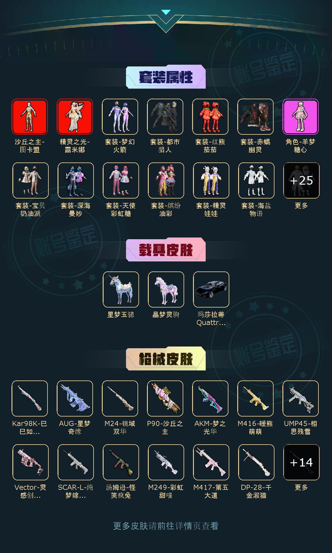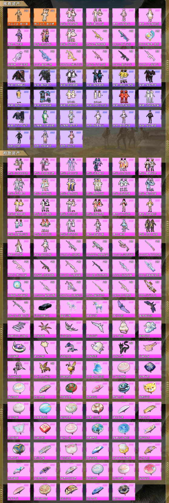 【稀有资产】沙丘之主-图卡盟[3级]/精灵之光-露米娜[2级]/套装-彩虹甜喵/套装-第五大道/角色-羊梦糖心/角色-小叽联名款/角色-严莉莉/套装-缤纷油彩/套装-甜梦小狐/M416-暖熊萌萌/AKM-梦之光华/破片手榴弹-美味星星糖/烟雾弹-丁香清露/AUG-星梦奇缘/GROZA-精灵之光/M416-心之恋语/M416-墨龙九天/SCAR-L-甜梦小狐/套装-赤蝎幽灵/套装-都市猎人/套装-胖达圆圆/套装-暗夜魅影/套装-潮萌小黄鸭/套装-暗影哥特/套装-龟仙人/套装-迅捷狂鲨/套装-糯粉咩咩/套装-软软马卡龙/套装-红熊茄茄/套装-动感兔斯基人偶服/套装-光子十周年/玩偶服-卖崽青蛙/玩偶服-喜羊羊/角色-粉雾星云/角色-都市丽猫/角色-摩登魅猫/角色-2B战斗服款/角色-俏兔智灵/角色-情公主