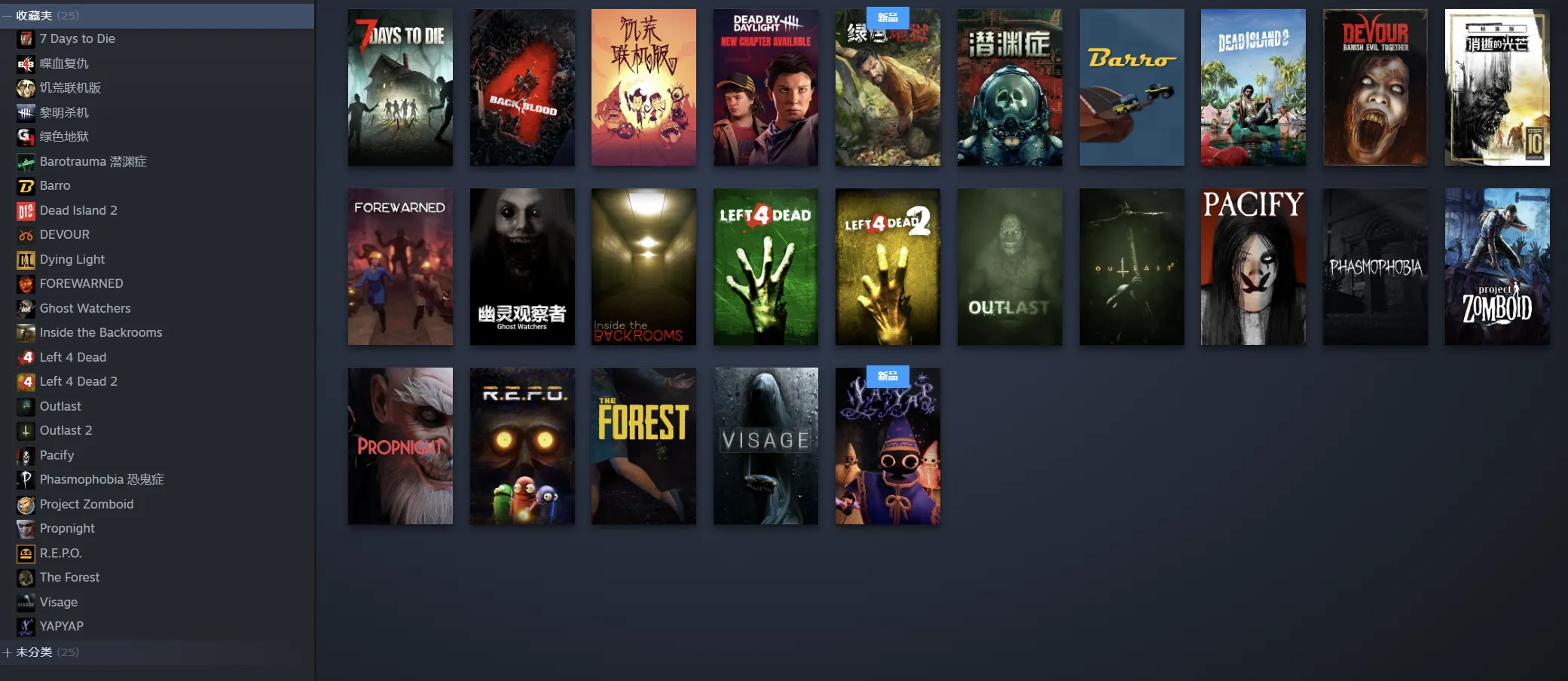 攀爬动物在一起/等动物攀登((Climber Animals: Together)、PEAK(拉我一把)、雨中冒险2、魔法咒语/YAPYAP、喋血复仇、REPO、恐鬼症/幽灵恐怖(Phasmophobia)、道具夜/道具之夜(Propnight)、吞噬(DEVOUR)、安抚(Pacify)、潜渊症(Barotrauma)、消逝的光芒增强版(Dying Light Platinum Edition)、深入后室(Inside The Backrooms)、幽灵观察者(Ghost Watchers)、预警(FOREWARNED)、面容(Visage)、逃生1(Outlast)、逃生2(Outlast 2)、僵尸毁灭工程(Project Zomboid)、7日杀/七日杀(7 Days to Die)、求生之路1,求生之路2(Left 4 Dead, Left 4 Dead 2)、饥荒联机版(Don't Starve Together)、迷失森林(The Forest)、死亡岛2、绿色地狱/丛林地狱