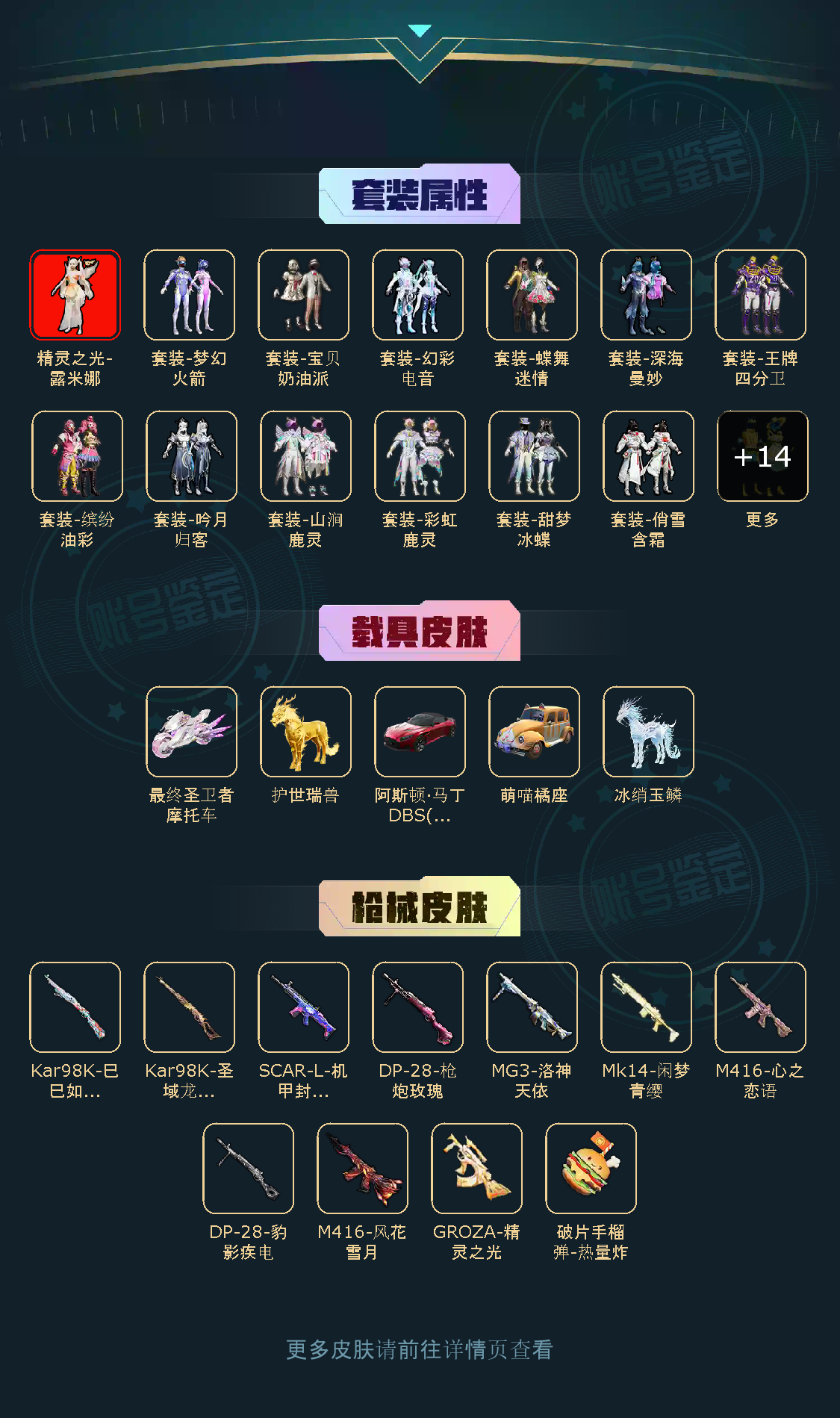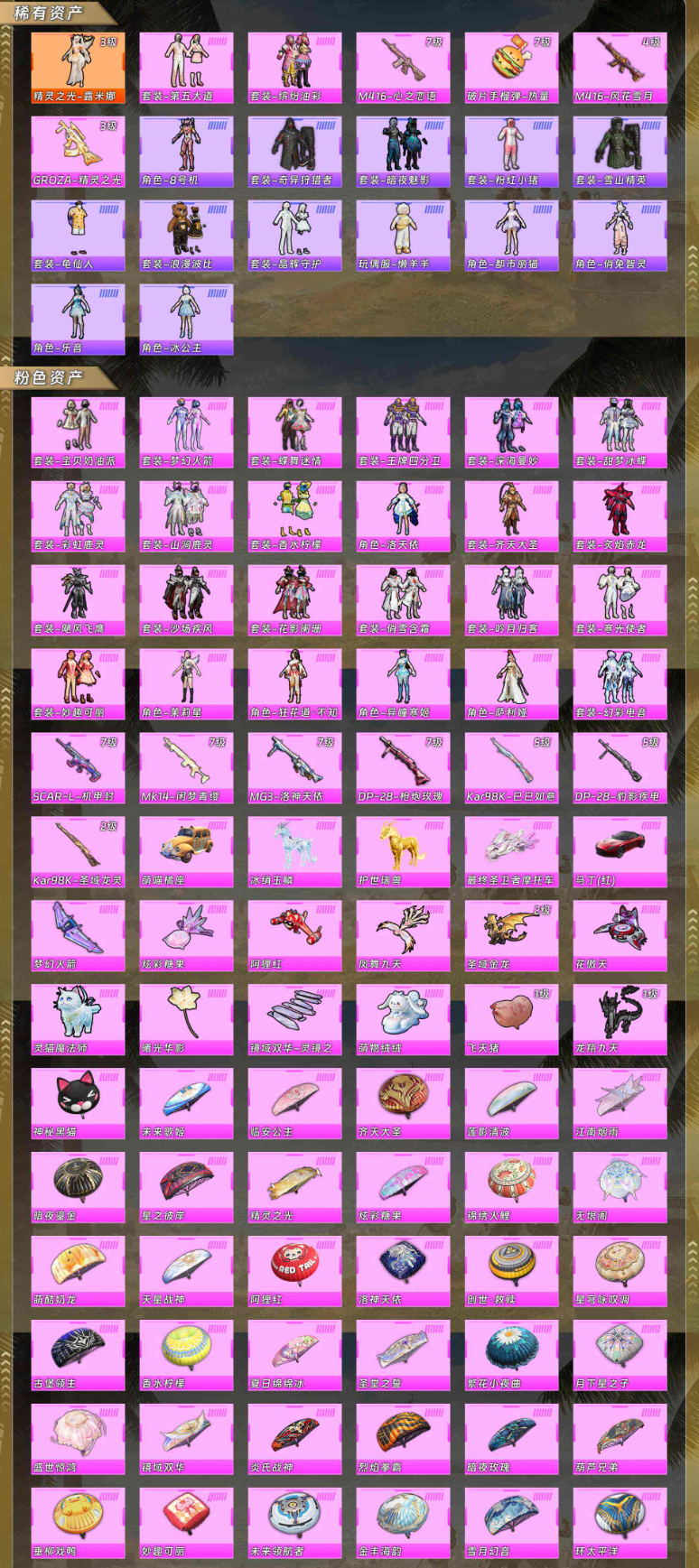 【稀有资产】精灵之光-露米娜[3级]/套装-第五大道/套装-缤纷油彩/M416-心之恋语/破片手榴弹-热量炸弹/M416-风花雪月/GROZA-精灵之光/角色-8号机/套装-奇异狩猎者/套装-暗夜魅影/套装-粉红小猪/套装-雪山精英/套装-龟仙人/套装-浪漫波比/套装-晶辉守护/玩偶服-懒羊羊/角色-都市丽猫/角色-俏兔智灵/角色-乐音/角色-冰公主