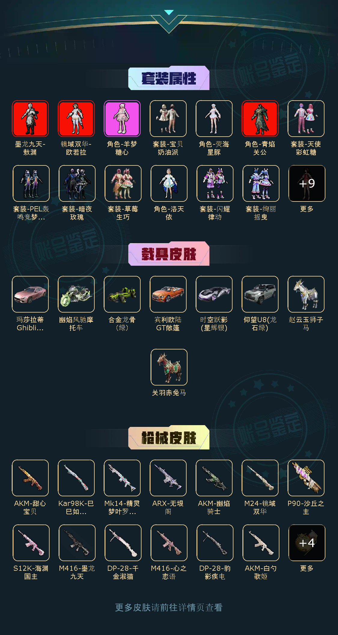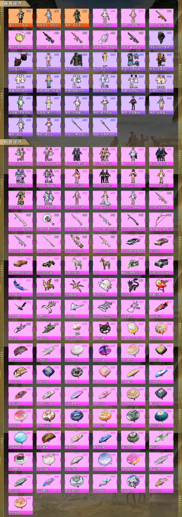 【稀有资产】墨龙九天-敖渊[4级]/镜域双华-欧若拉[2级]/角色-青焰关公[2级]/角色-千金淑猫/角色-羊梦糖心/AKM-甜心宝贝/破片手榴弹-秋玉花灯/M416-墨龙九天/M416-心之恋语/烟雾弹-丁香清露/AKM-幽焰骑士/熔岩游骑兵面罩/小恶魔头饰/套装-粉红小猪/套装-雪山精英/套装-龟仙人/套装-迅捷狂鲨/套装-浪漫波比/套装-糯粉咩咩/套装-摄影小熊猫/套装-晶辉守护/套装-星谷精灵/套装-银月精灵/玩偶服-小狗蛇点点/玩偶服-卖崽青蛙/玩偶服-懒羊羊/角色-粉雾星云/角色-都市丽猫/角色-摩登魅猫/角色-俏兔智灵/角色-银尘/角色-情公主/大砍刀-青龙偃月刀/撬棍-龙胆亮银枪