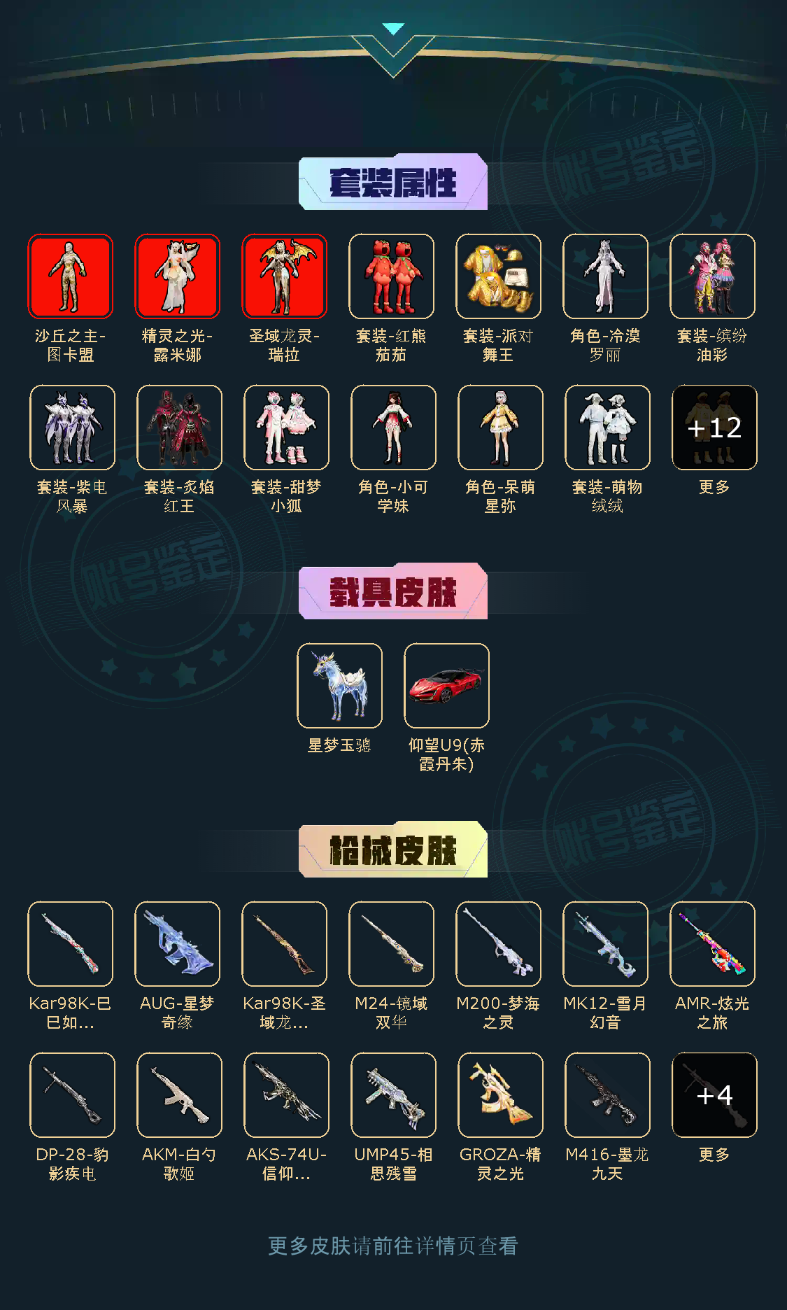 【稀有资产】沙丘之主-图卡盟[5级]/圣域龙灵-瑞拉[1级]/精灵之光-露米娜[1级]/角色-千金淑猫/角色-严莉莉/套装-缤纷油彩/套装-甜梦小狐/破片手榴弹-热量炸弹/AUG-星梦奇缘/M416-墨龙九天/GROZA-精灵之光/烟雾弹-丁香清露/套装-派对舞王/套装-龟仙人/套装-糯粉咩咩/套装-兔兔白日梦/套装-璀璨流光/套装-红熊茄茄/套装-绒宝小鹅/玩偶服-小狗蛇点点/玩偶服-美羊羊/角色-粉雾星云/角色-都市丽猫/角色-摩登魅猫/角色-俏兔智灵/角色-银尘